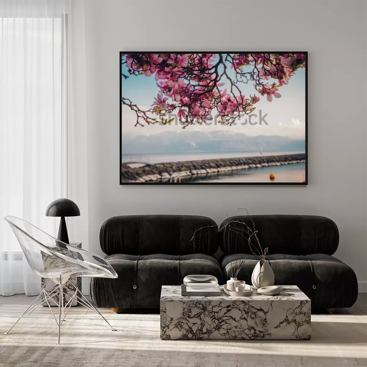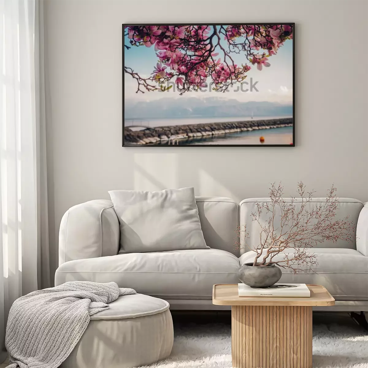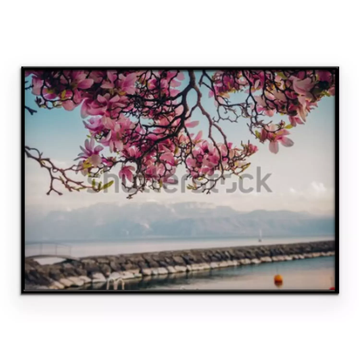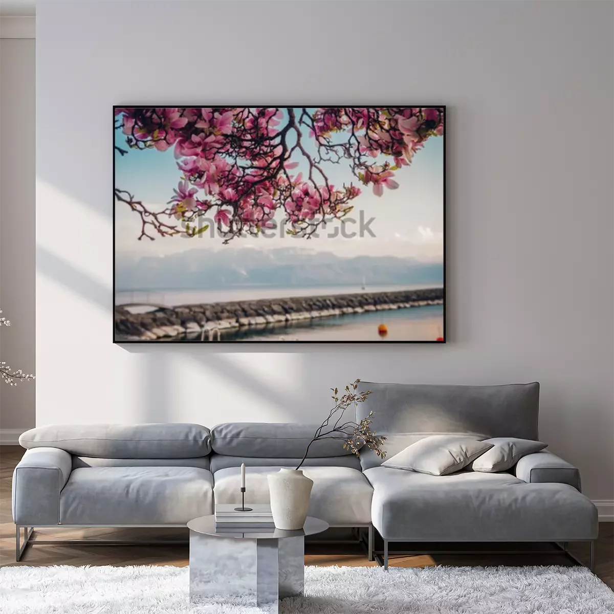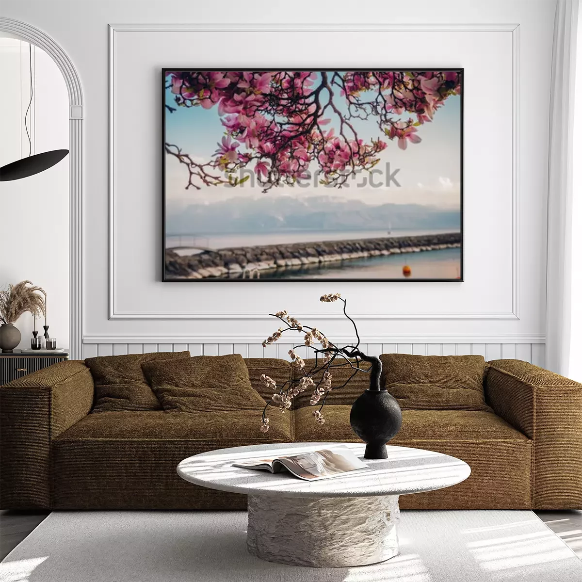 Poster : Nature fleurie sur fond d'eaux et de montagnes