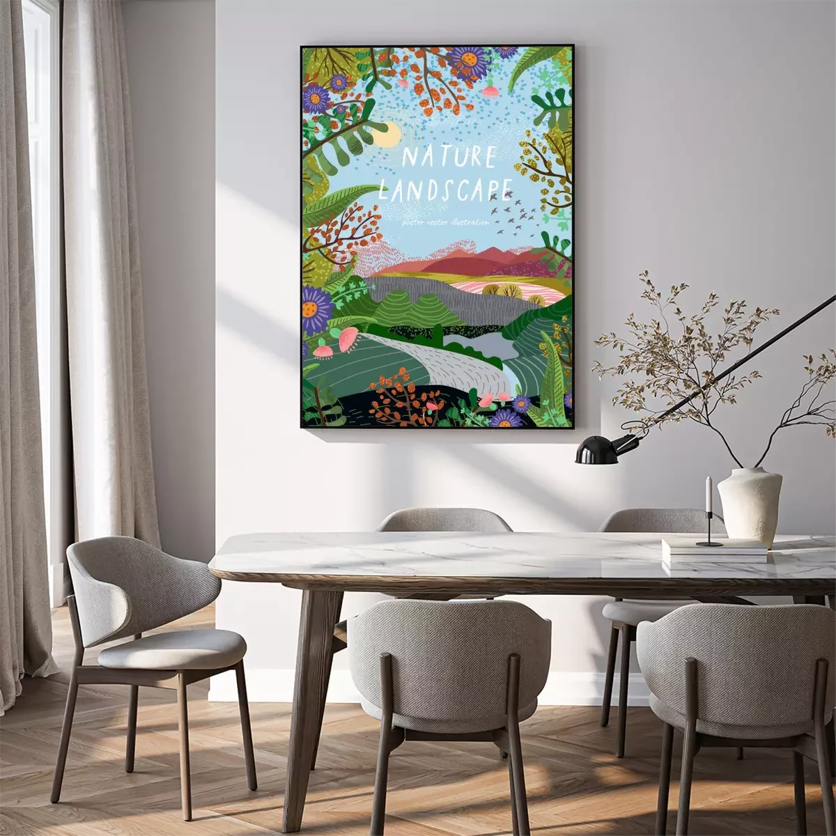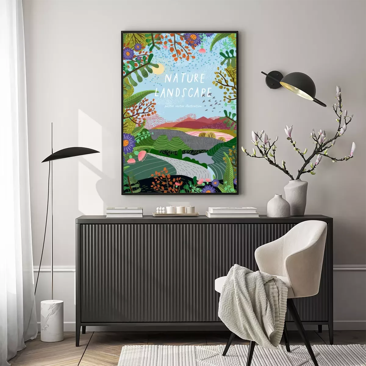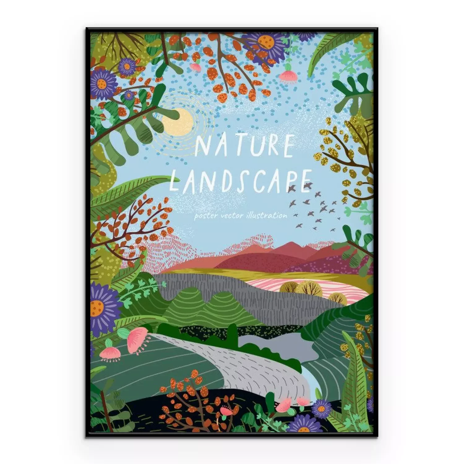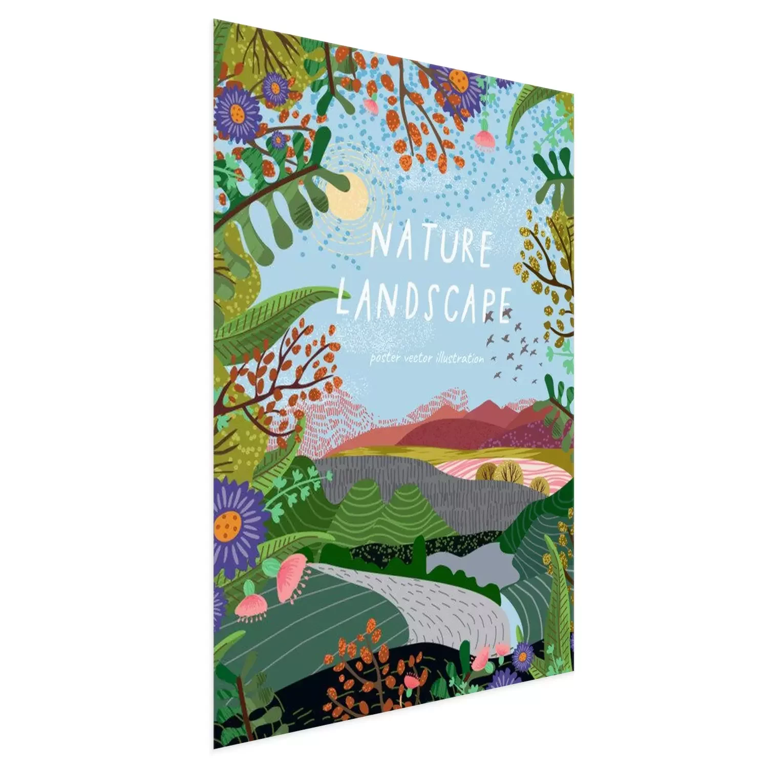 Poster : Nature landscape. Vector background illustration with hills, road, plants and flowers. Summer or spring day