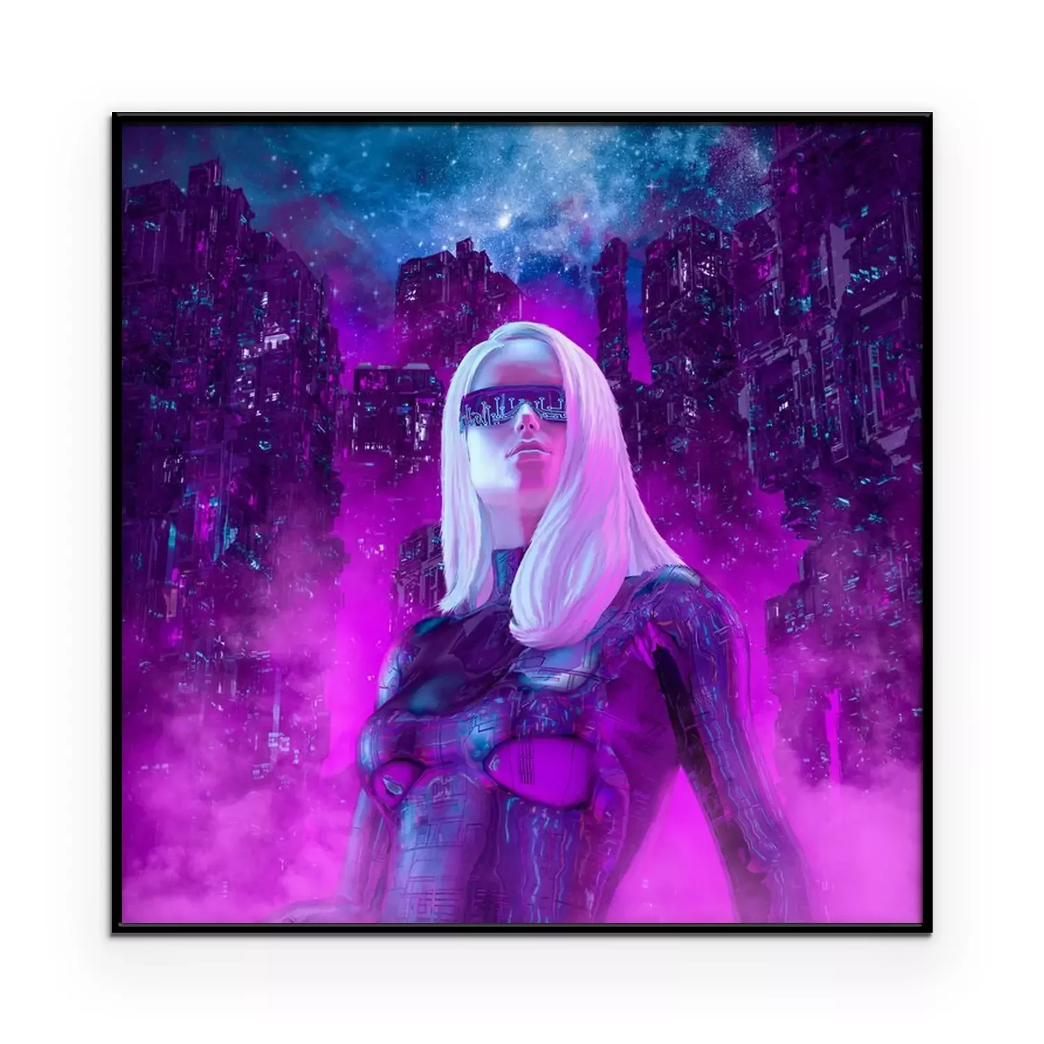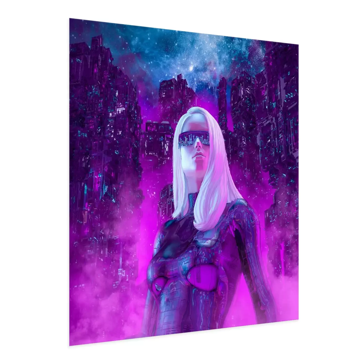 Poster  Neon night heroine / 3D illustration of beautiful blond woman with sunglasses in futuristic neon lit cyberpunk city