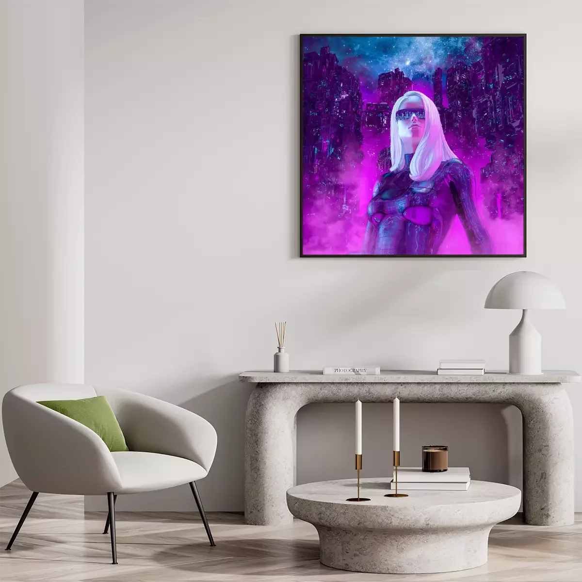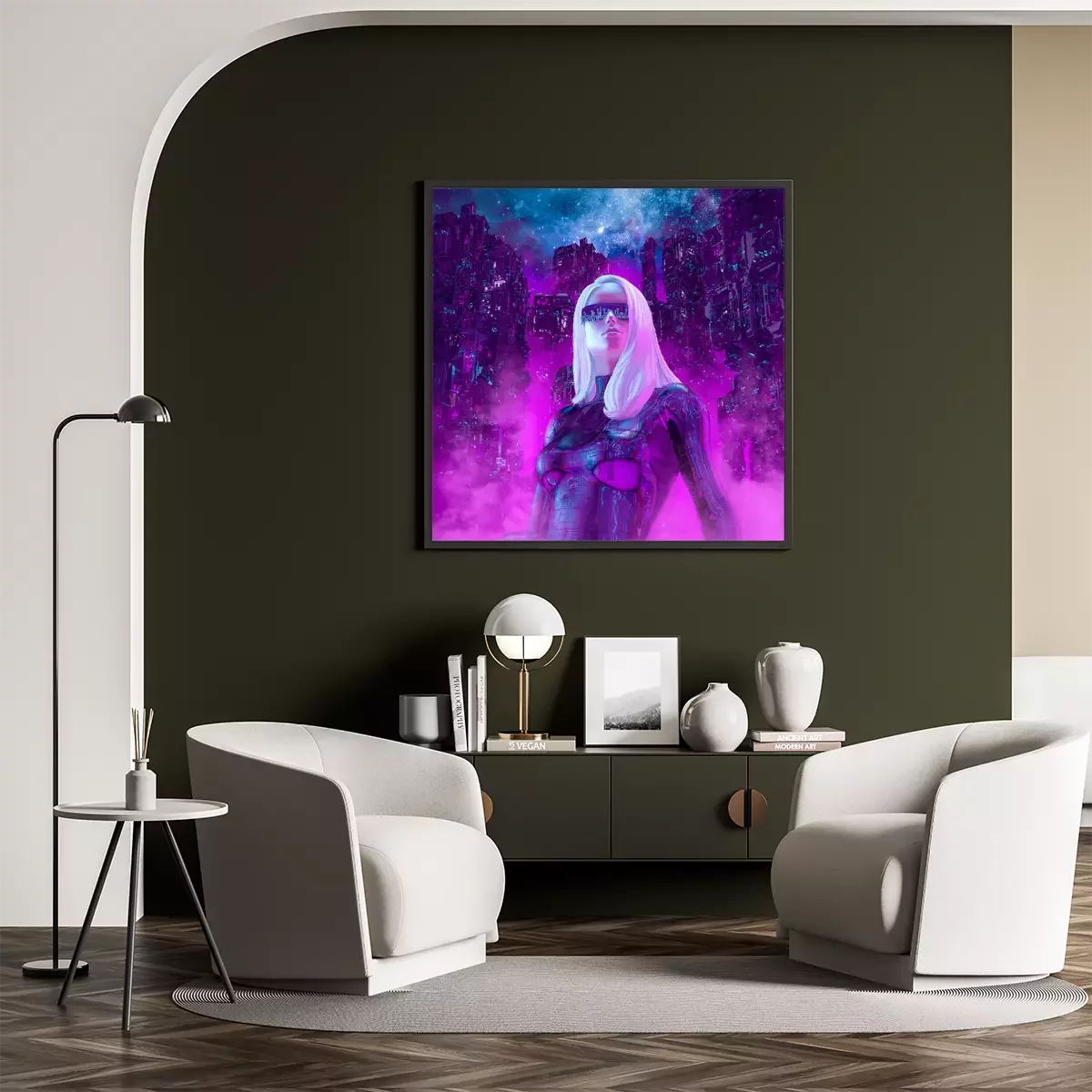 Poster : Neon night heroine / 3D illustration of beautiful blond woman with sunglasses in futuristic neon lit cyberpunk city