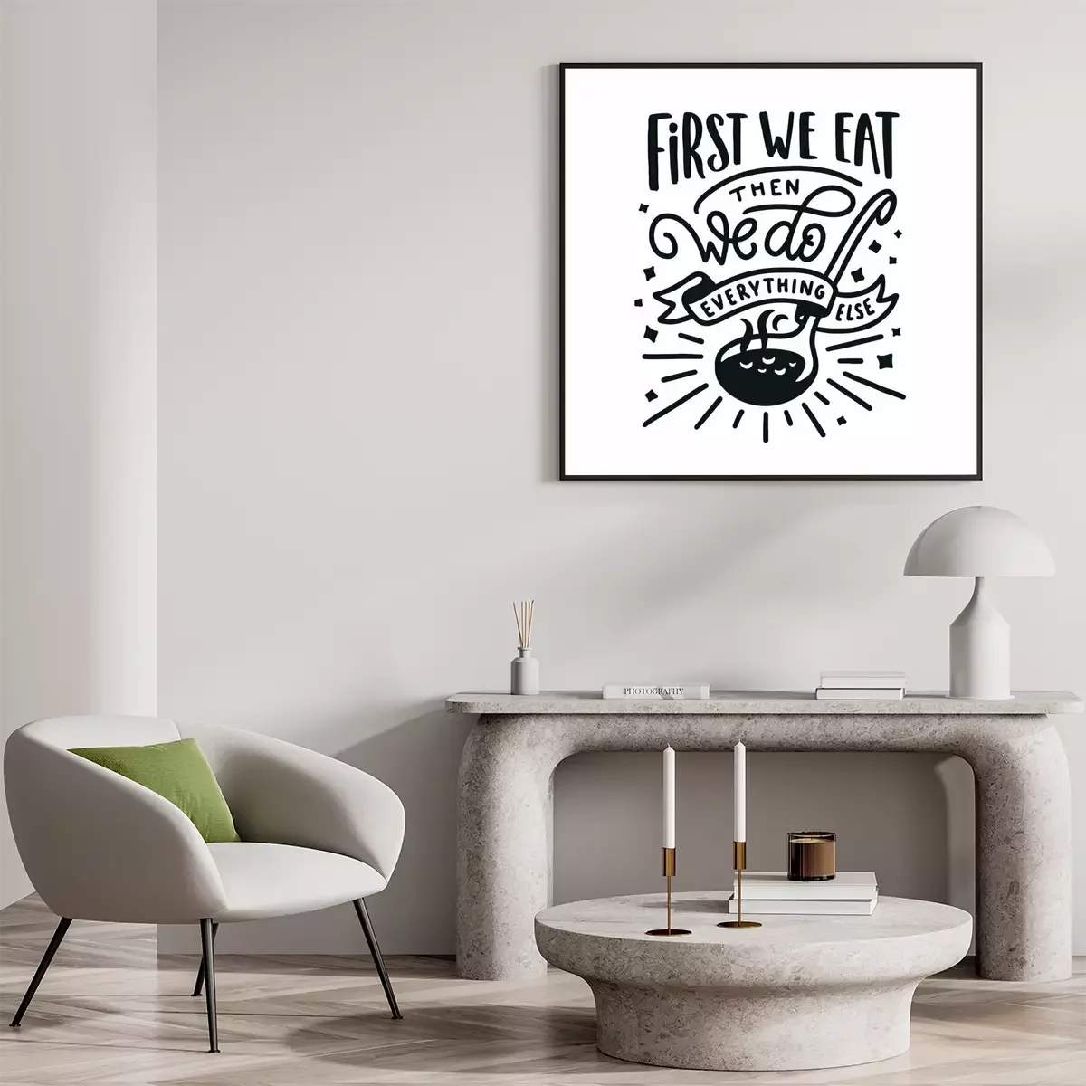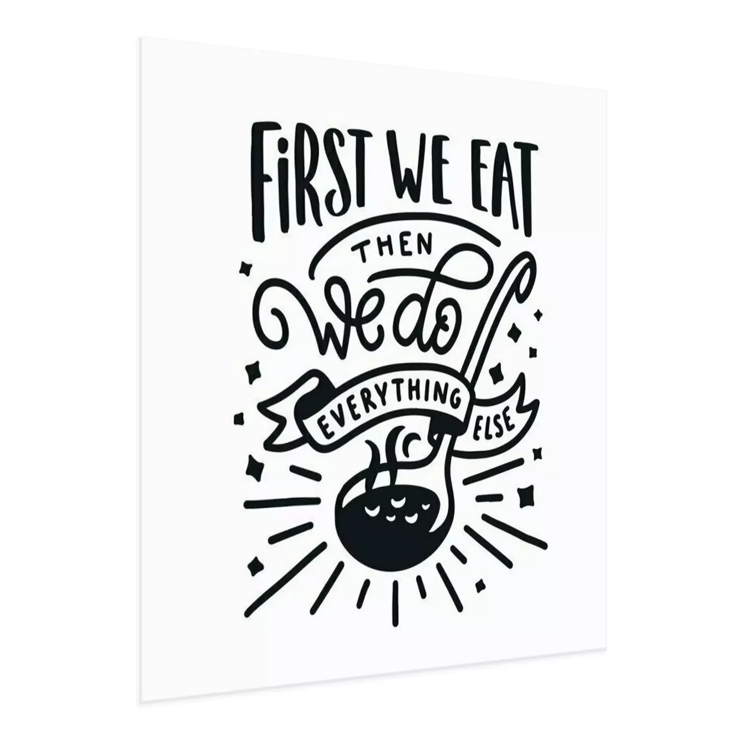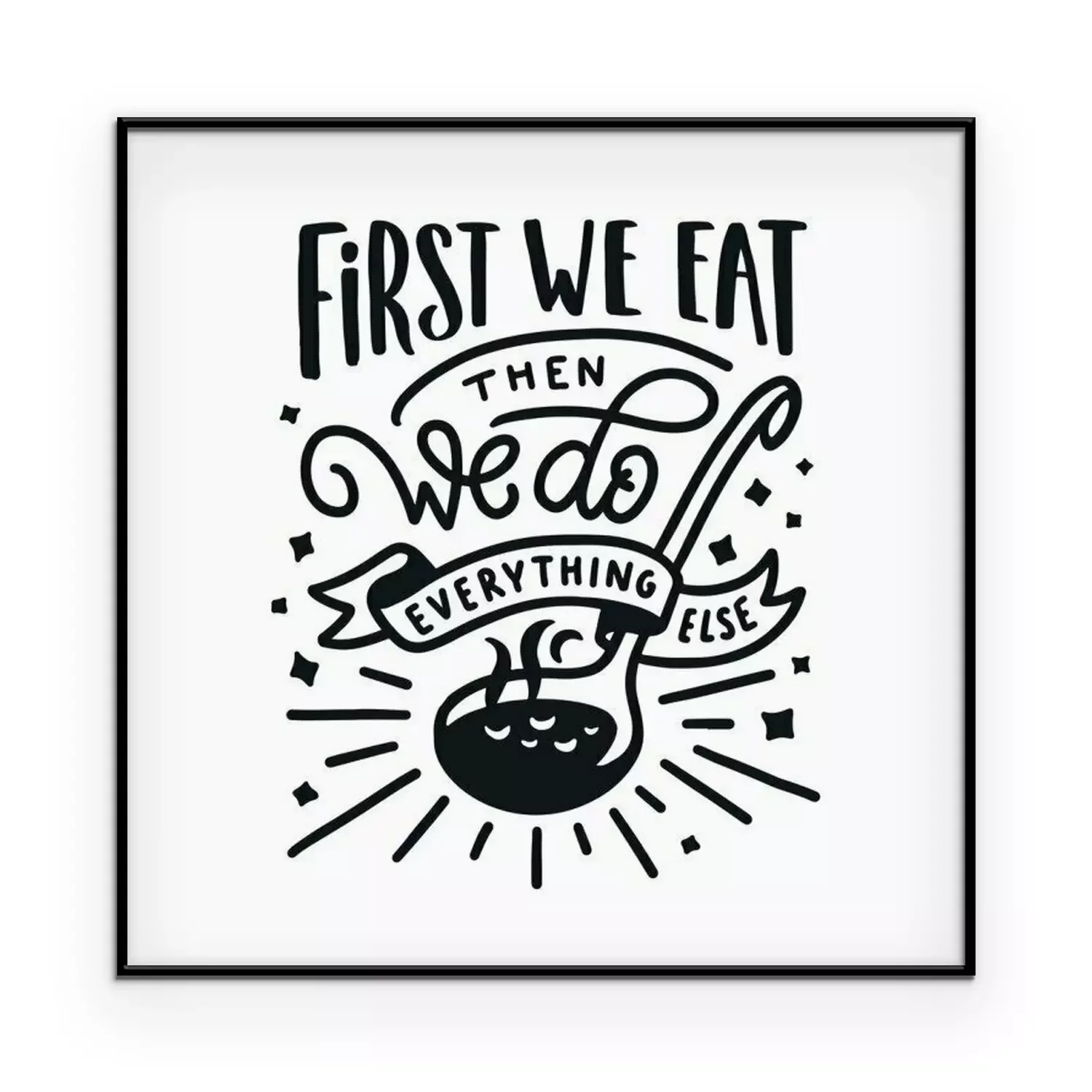 Poster  Nous mangeons d’abord une affiche de cuisine typographique. Illustration vintage de vecteur