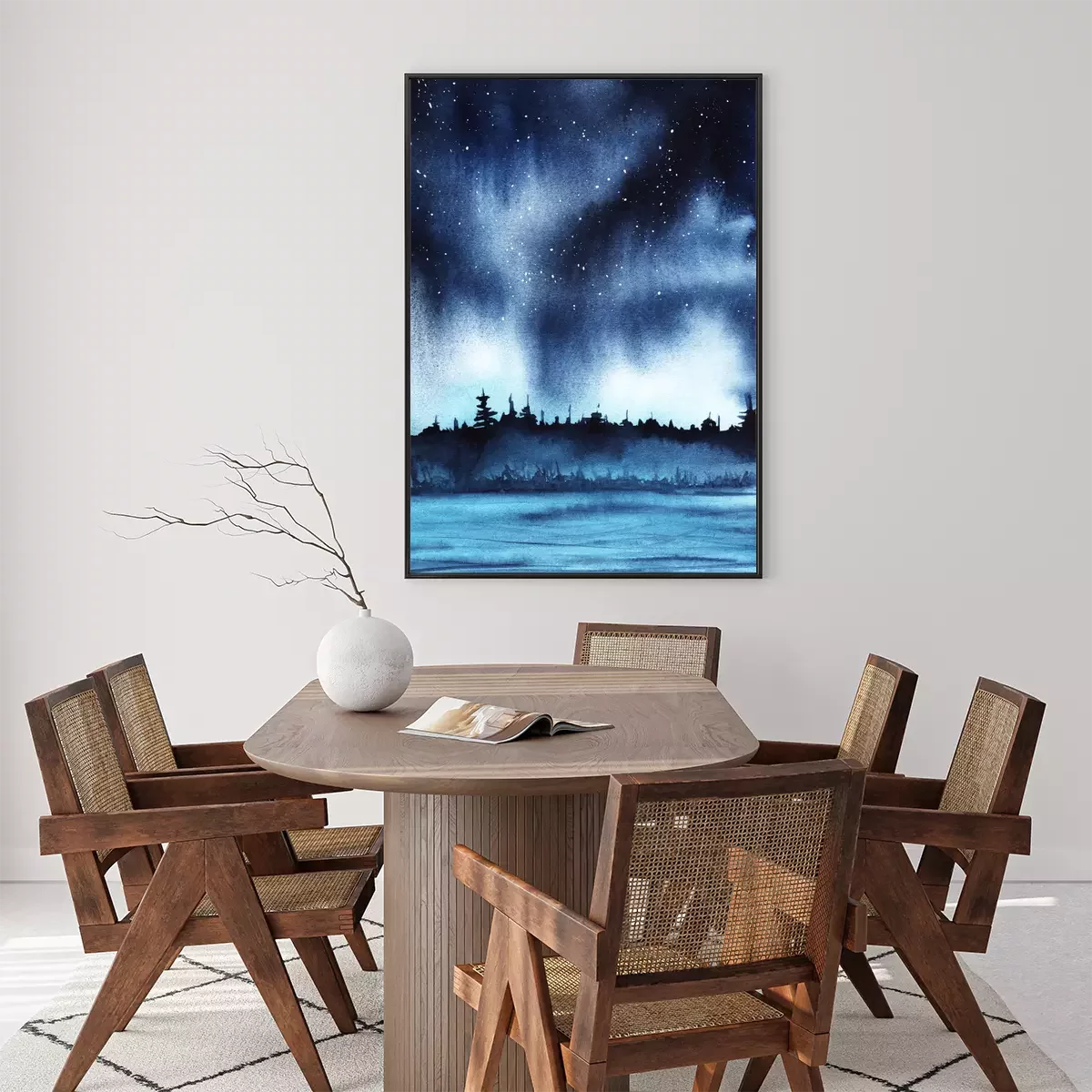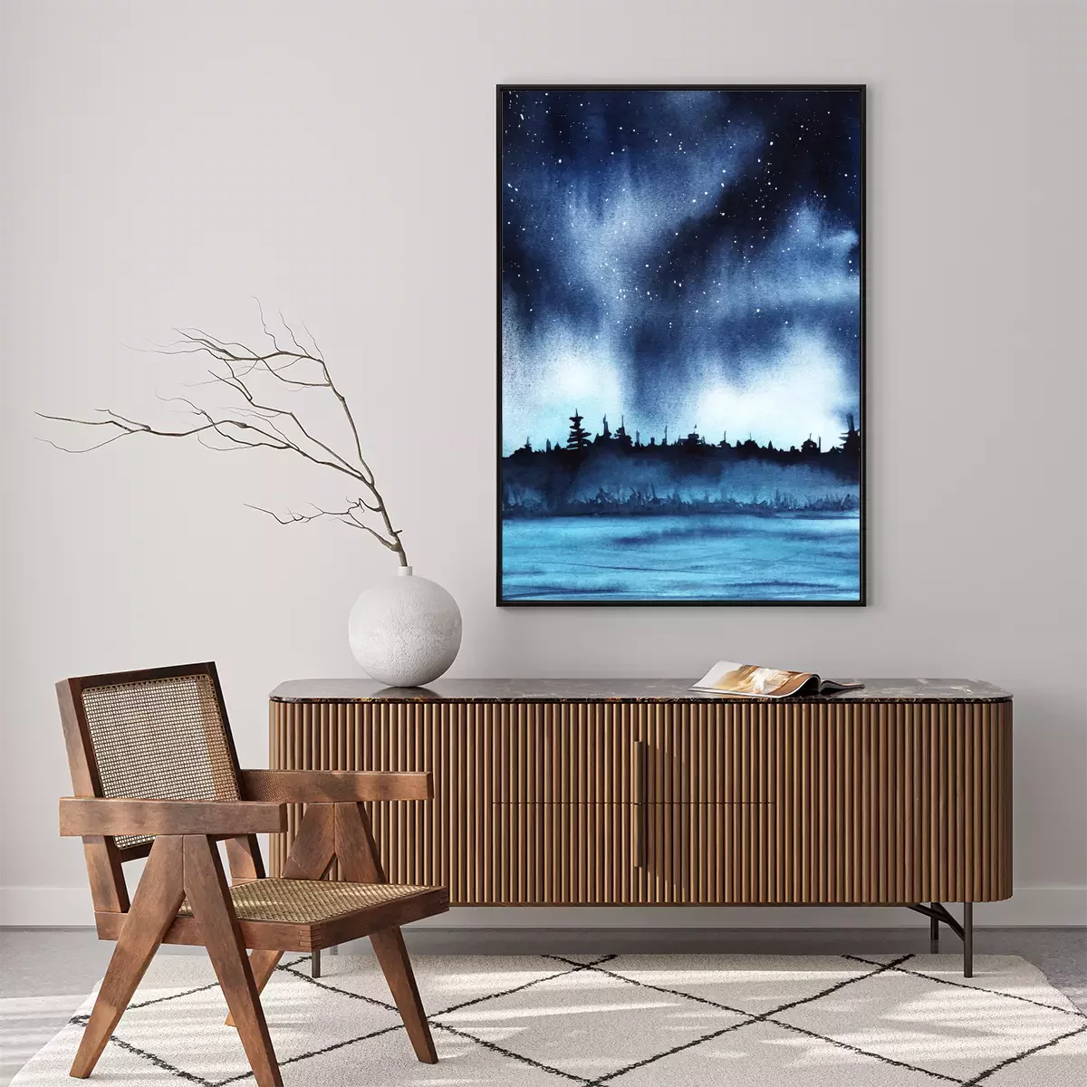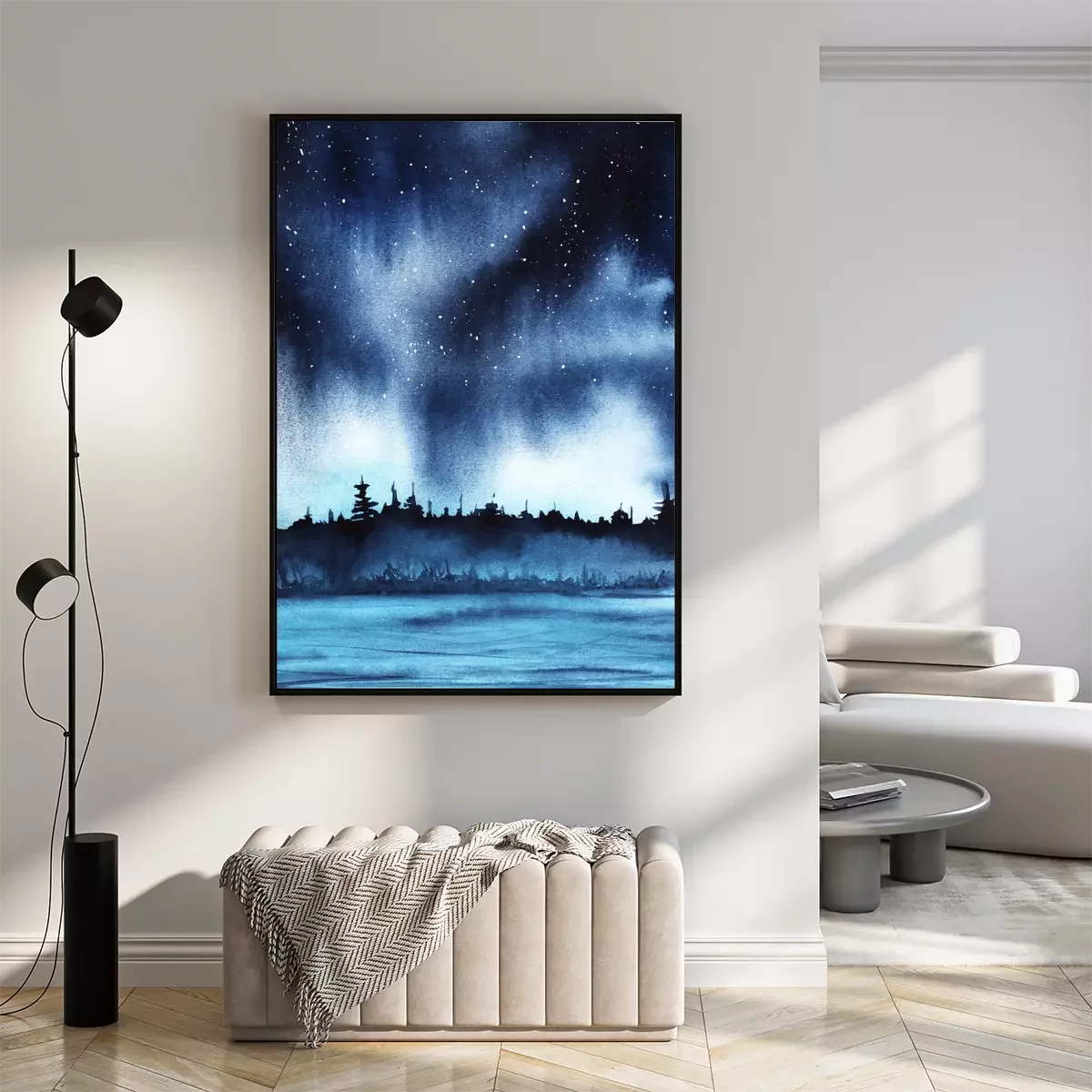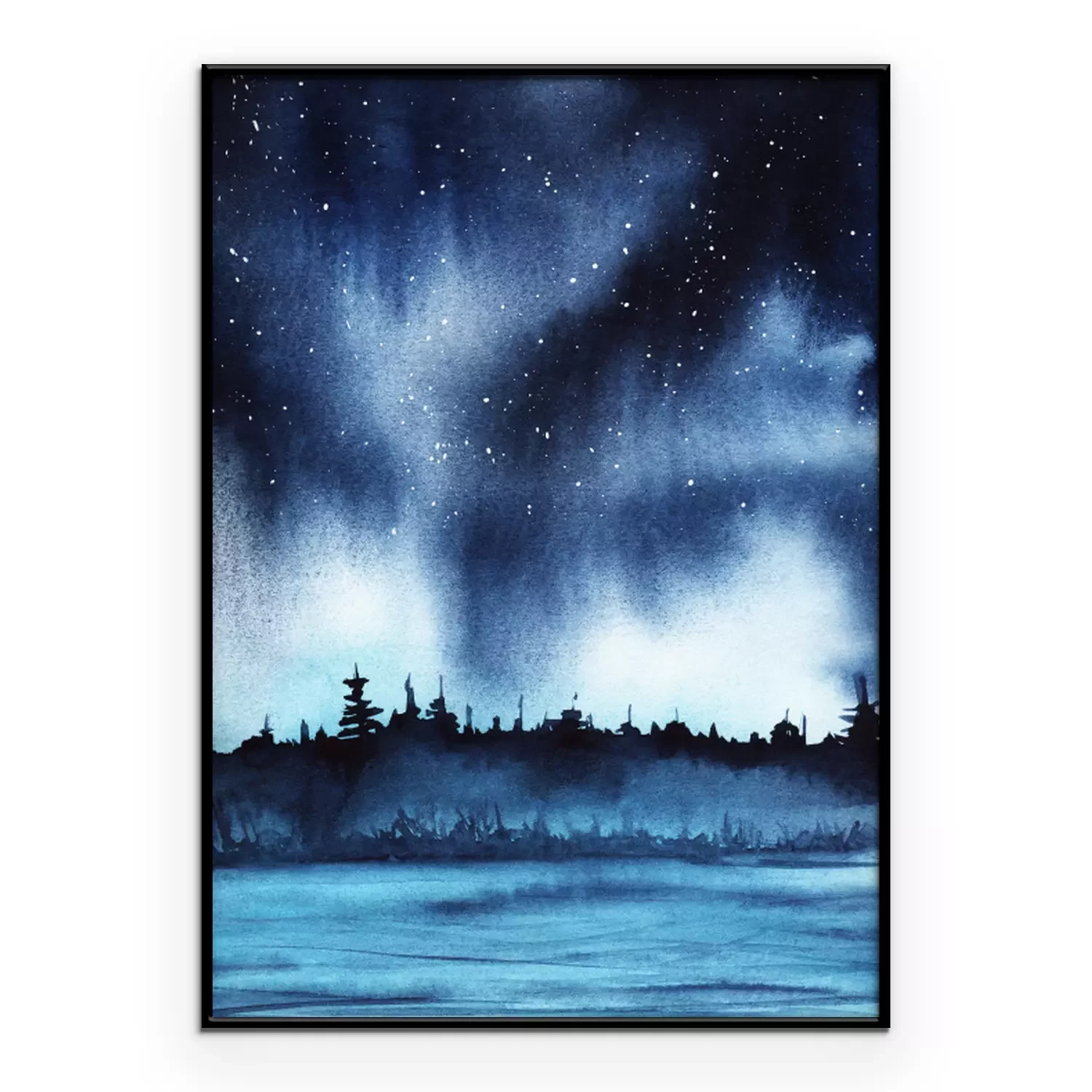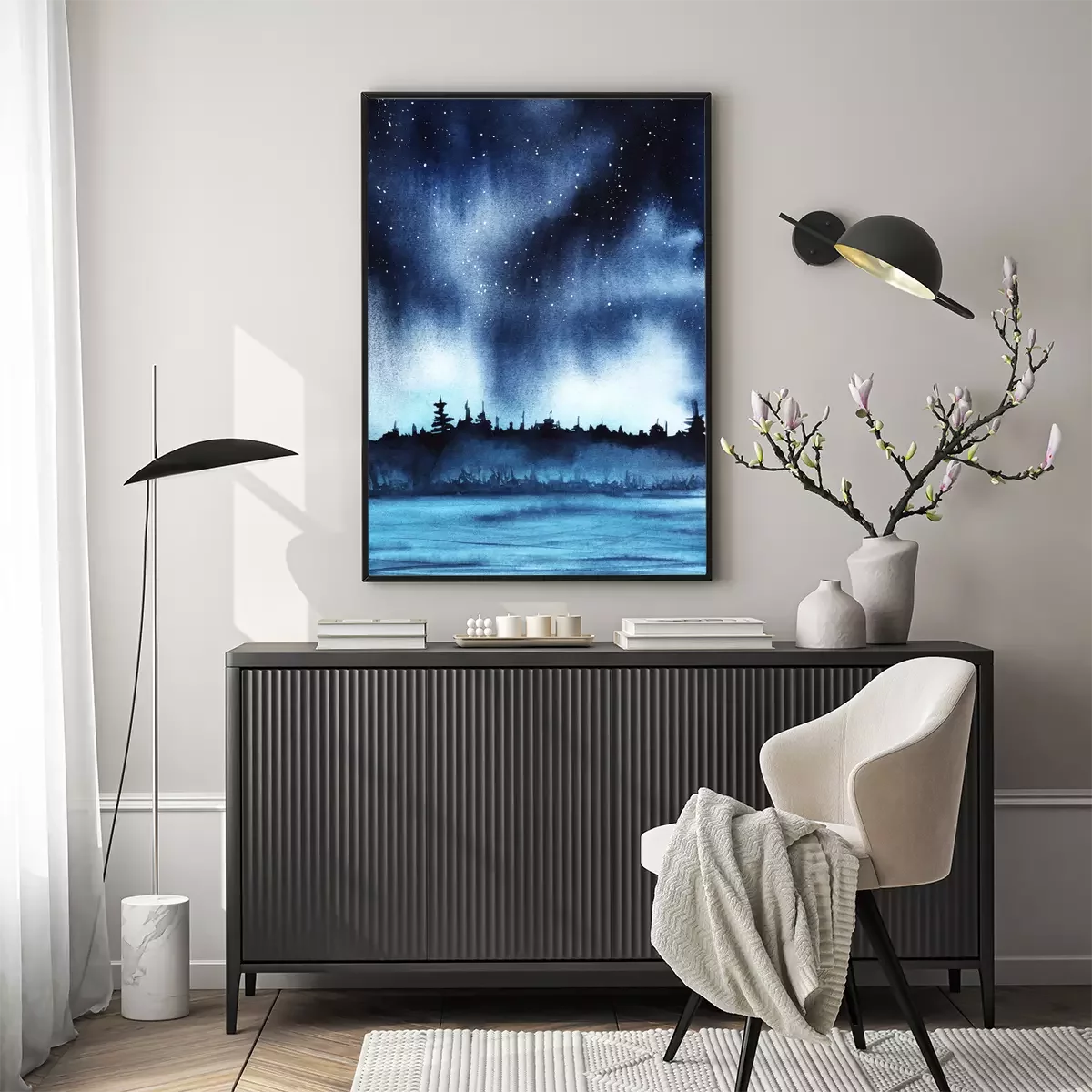 Les décorations murales imprimées peuvent évoquer de véritables petites œuvres d'art. C’est le cas du poster nuit étoilée que nous vous proposons. Ce motif rappelle une peinture à l'aquarelle en reflétant parfaitement les caractéristiques de cette technique, où les couleurs ne forment pas de taches intenses, mais se fondent délicatement sur la toile, créant par endroits un effet de transparence subtile. D'une part, ce poster nuit étoilée est expressif et peut devenir un point focal fort dans la pièce. D'autre part, avec son style inspiré de l'aquarelle, il dégage une légèreté qui lui permet de s'intégrer harmonieusement même dans une petite pièce. La tonalité bleue du motif ouvre de nombreuses possibilités de décoration, se mariant aussi bien avec des gris froids qu'avec des marrons ou des beiges chaleureux. Le ciel de ce poster étoiles sur lequel on voit des traînées lumineuses rappelant les aurores boréales capte immédiatement le regard. Ce motif s'intègrera ainsi parfaitement dans un style scandinave, apportant à la décoration l'atmosphère apaisante de la nature sauvage du Nord. Un autre aspect remarquable de ce poster lac est son caractère minimaliste. L'eau au premier plan qui se dévoile subtilement n’est visible qu’après quelques instants. La tonalité monochromatique et les formes épurées lui confèrent un aspect artistique, éloigné du réalisme. Avec sa surface doucement ondulée, il introduit une atmosphère apaisante, et sa tonalité bleue, empreinte de sérénité, en fait une décoration idéale pour une chambre à coucher. Ce poster étoilé sera parfaitement mis en valeur par un cadre en aluminium noir au design sobre, qui ajoutera une touche d'élégance et soulignera les détails de l'illustration aquarellée, créant ainsi une décoration murale des plus séduisantes.