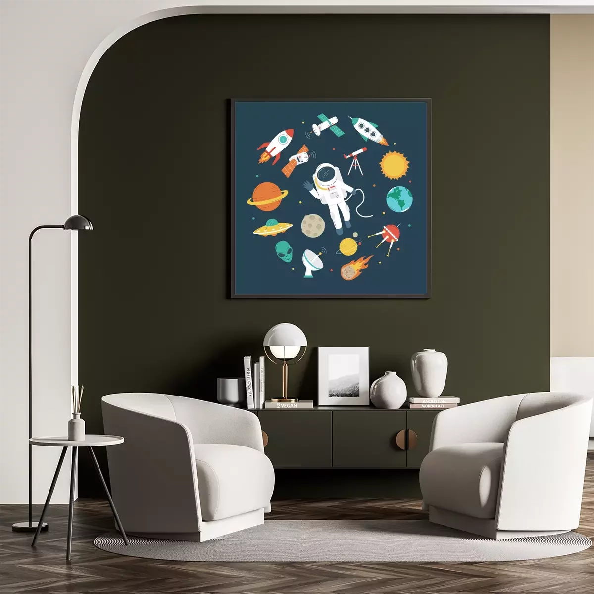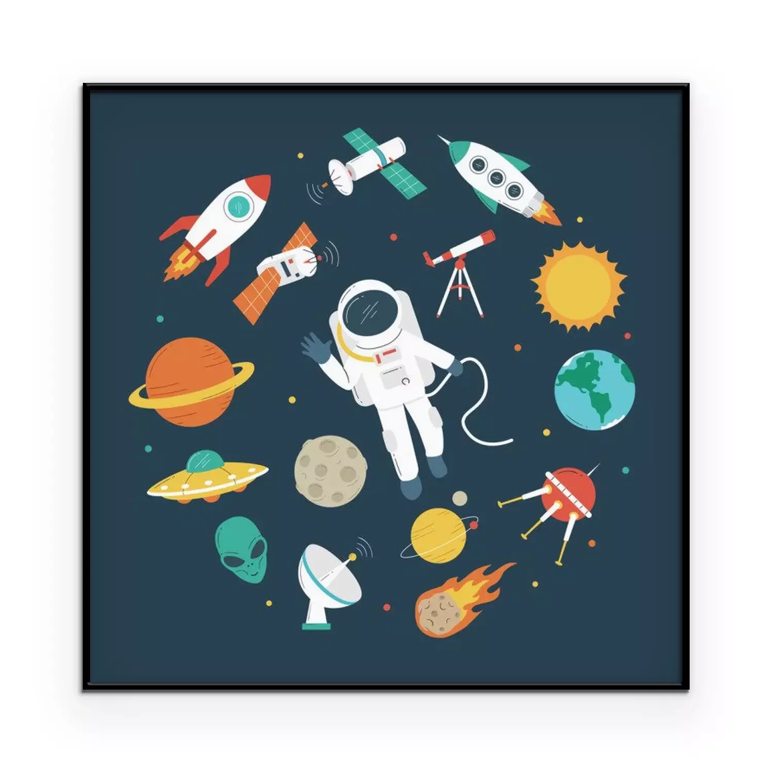 Poster  Objets spatiaux. Astronaute, fusée, planètes, ovnis, satellite, etc.