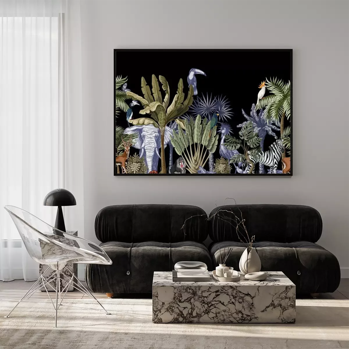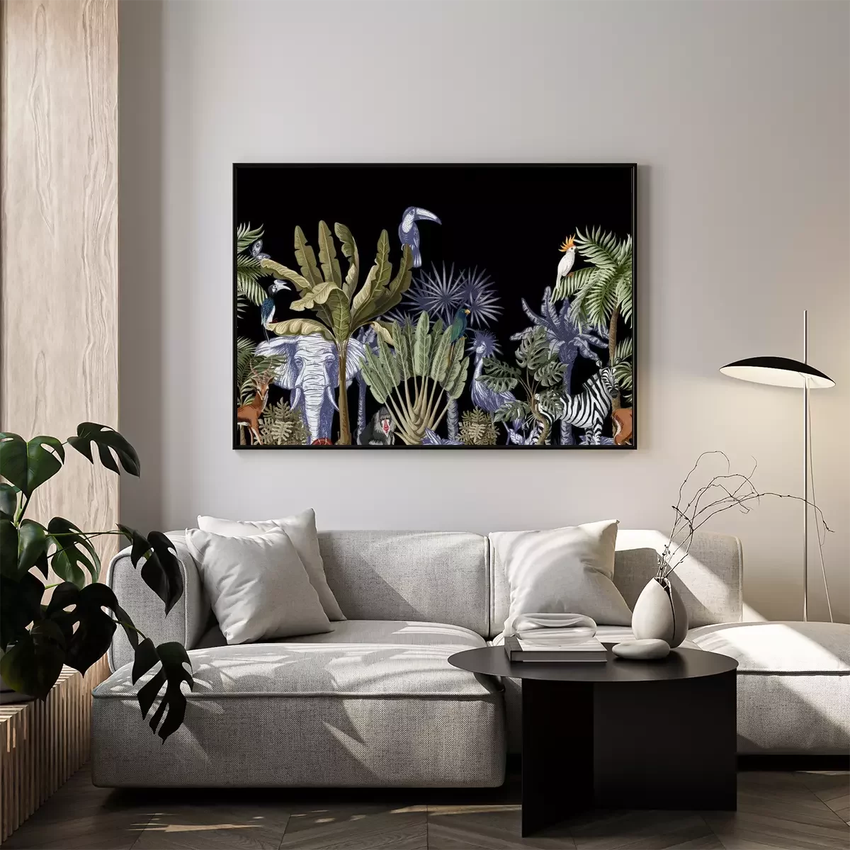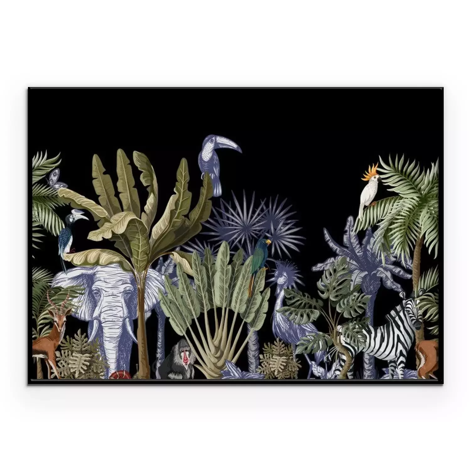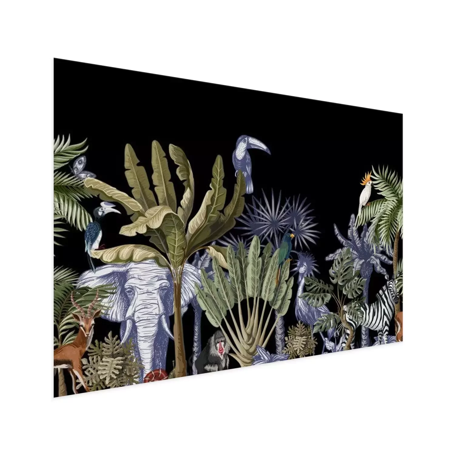 Seamless pattern with graphic tropical treees and jungle animals. Vector.