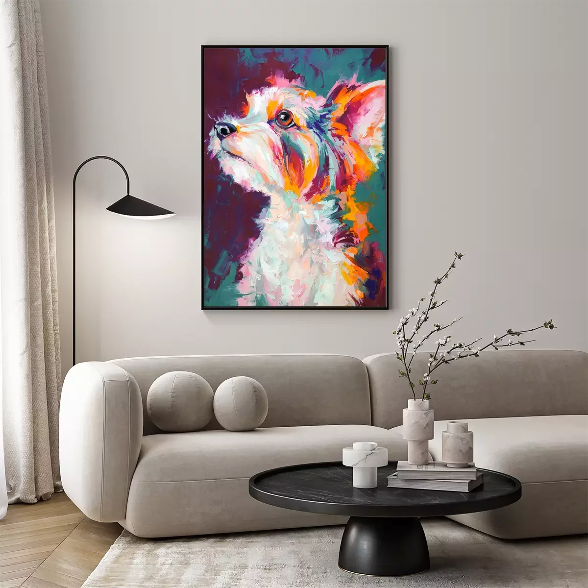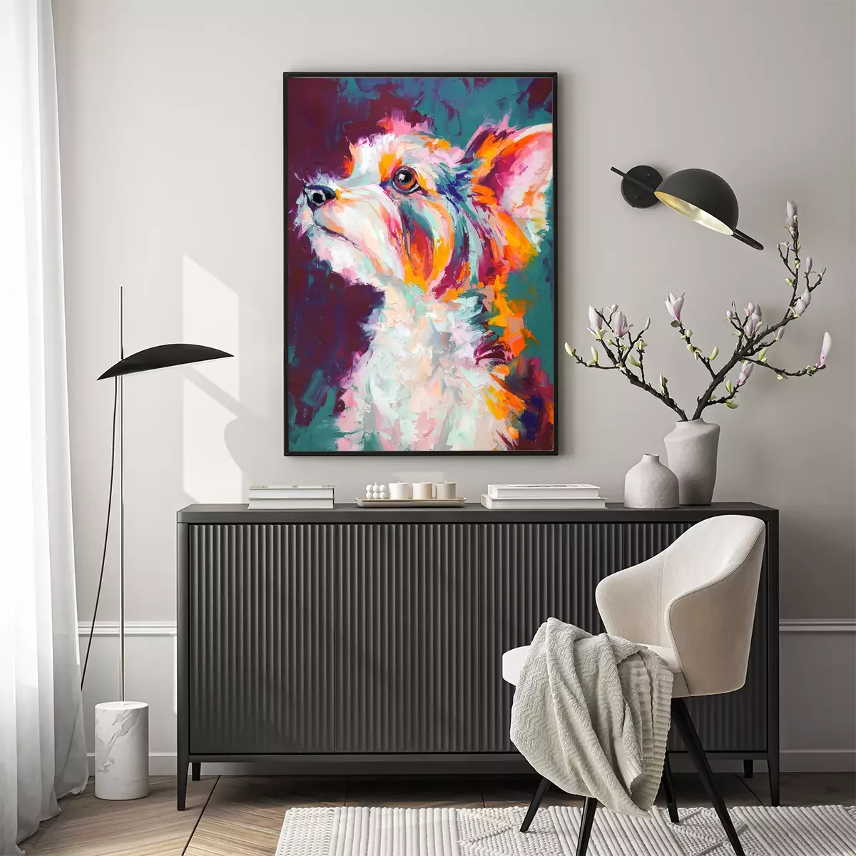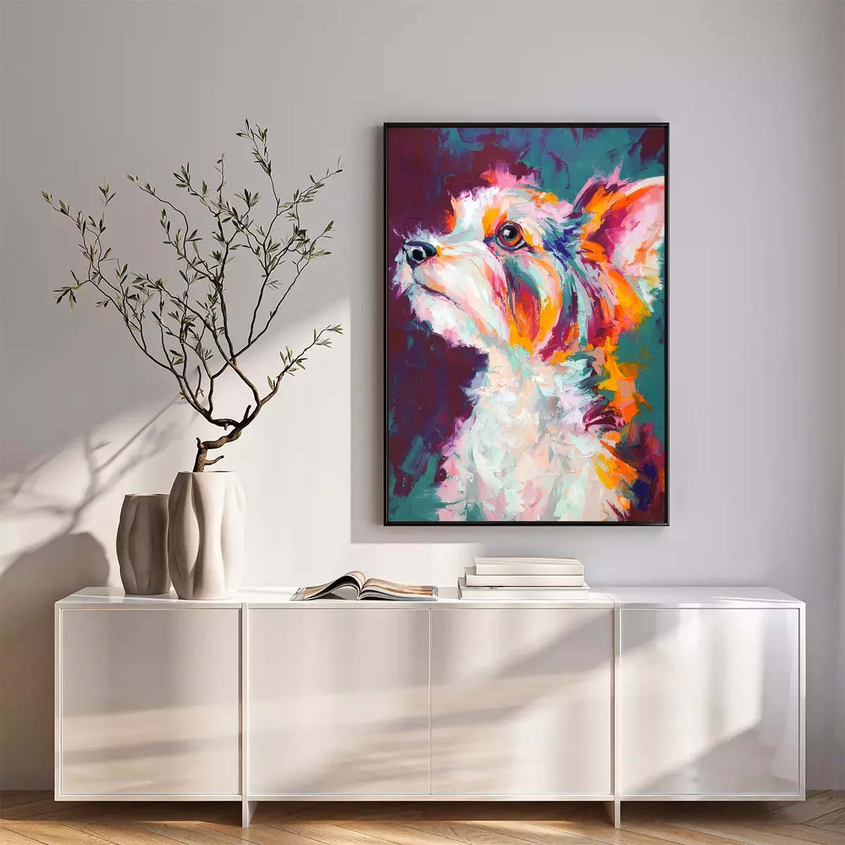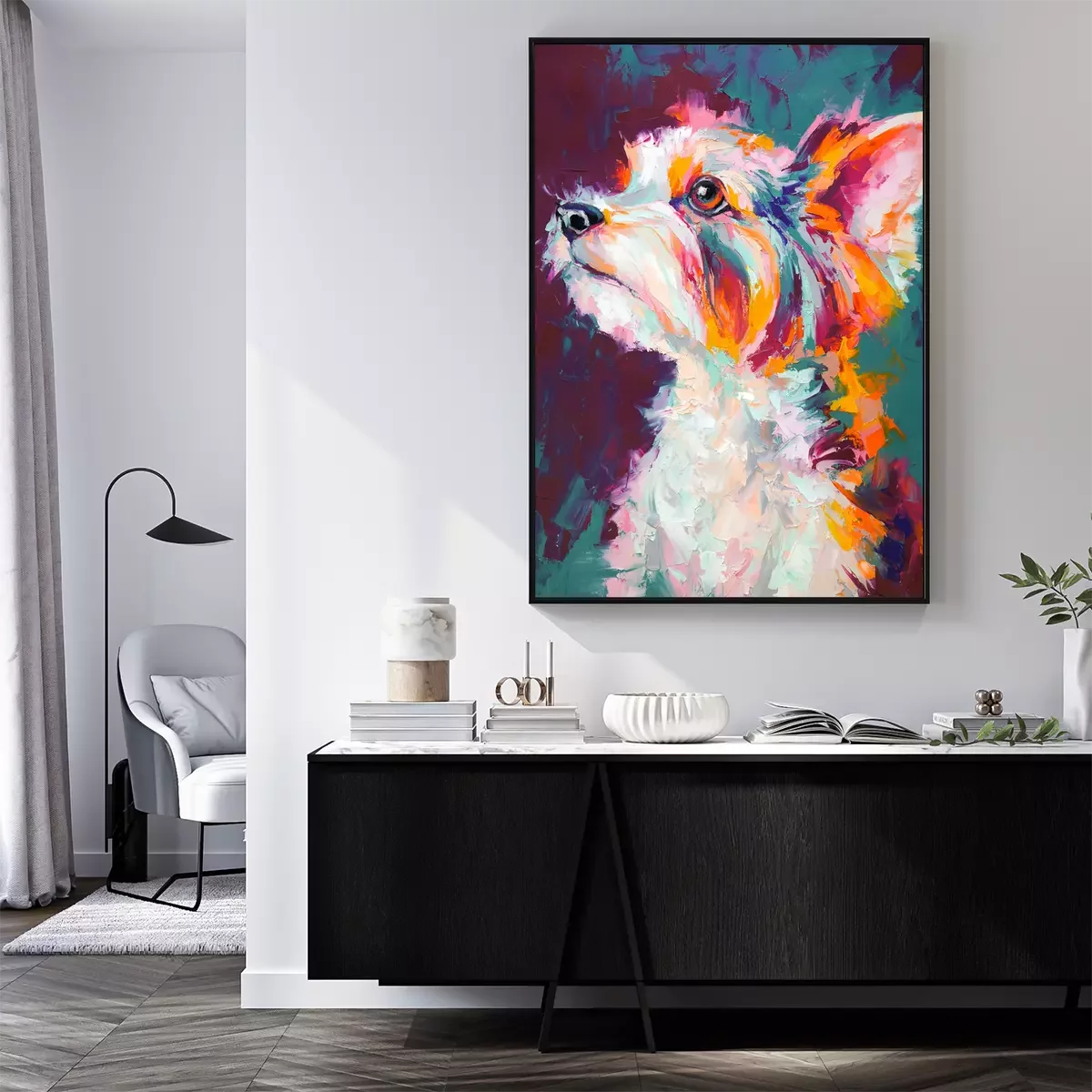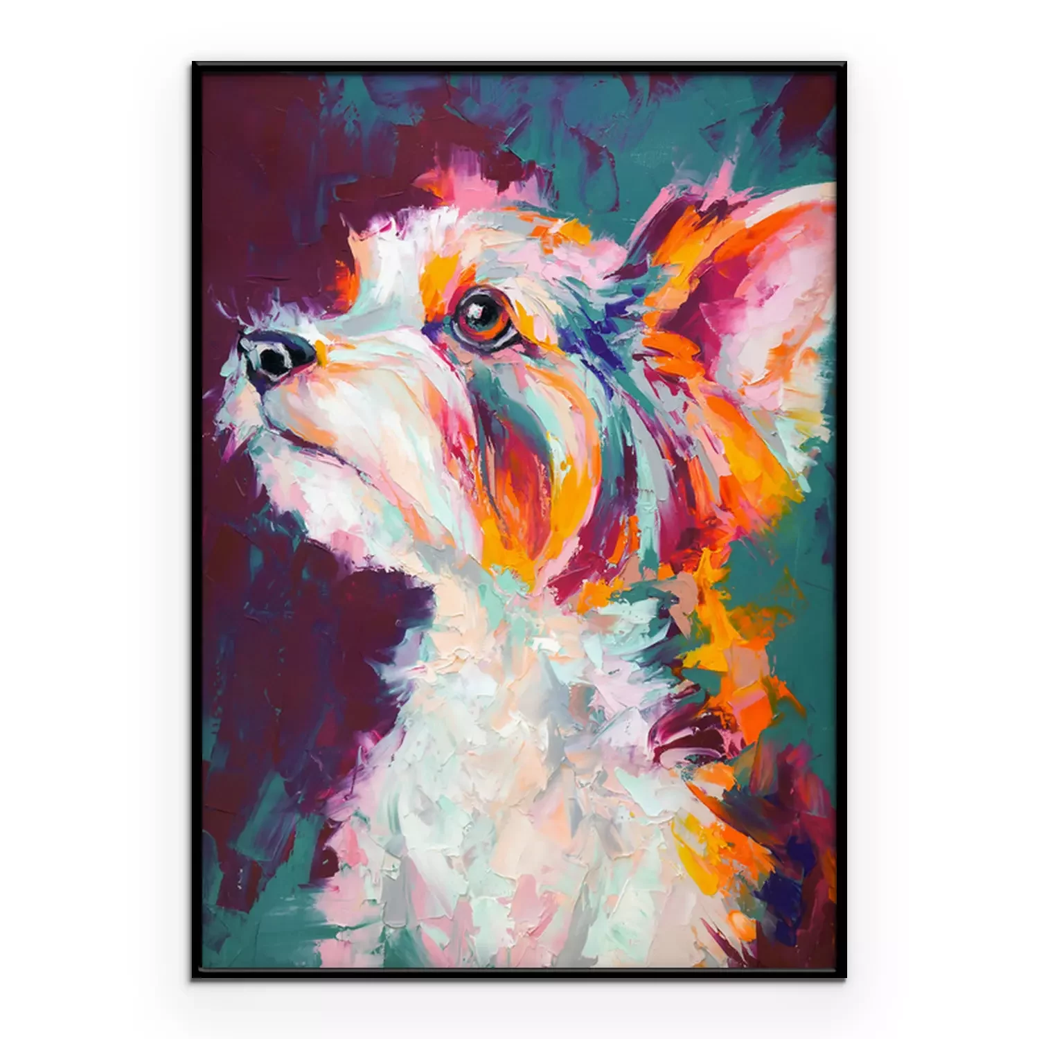 Poster : Oil dog portrait painting in multicolored tones. Conceptual abstract painting of a biewer terrier muzzle. Closeup of a painting by oil and palette knife on canvas.