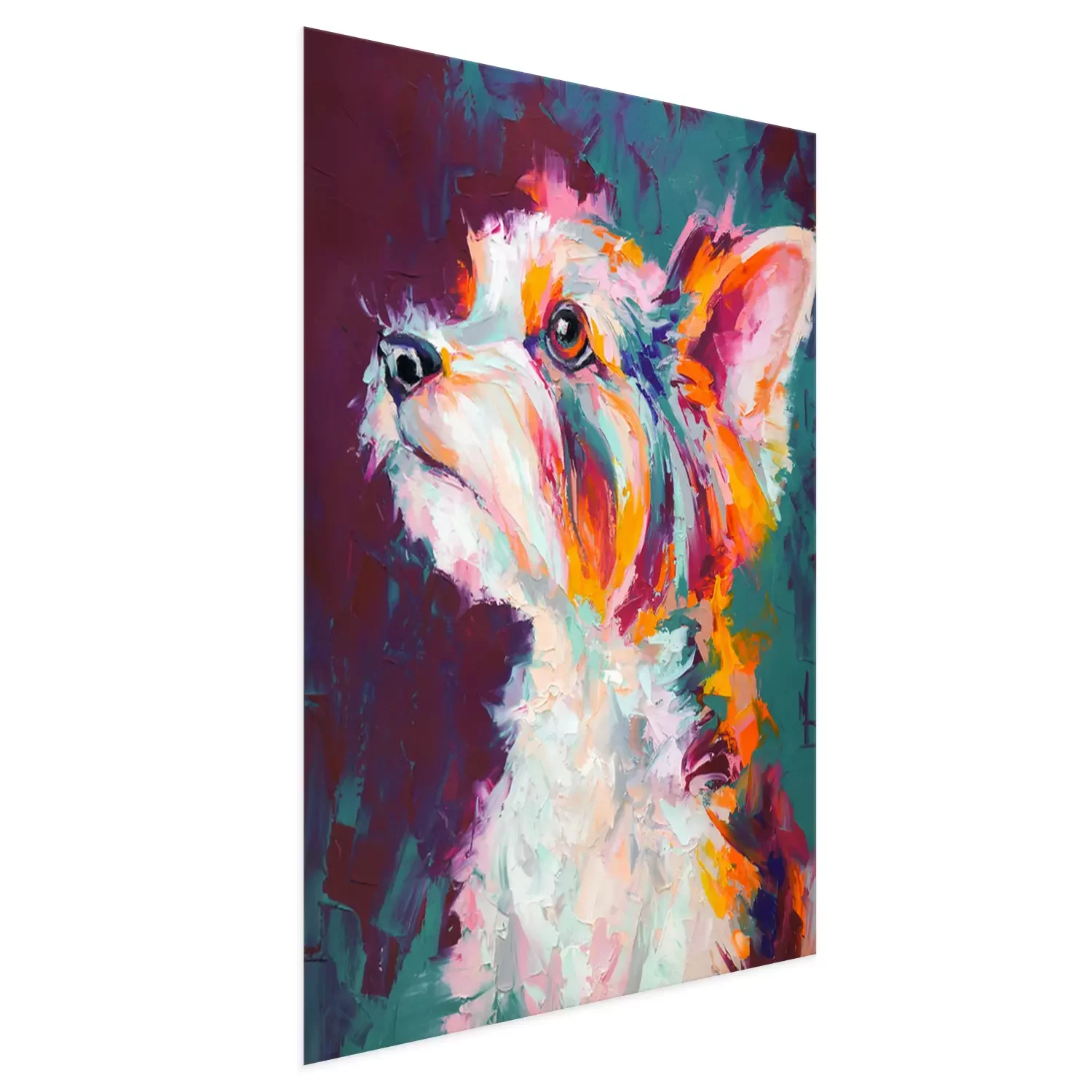 Poster  Oil dog portrait painting in multicolored tones. Conceptual abstract painting of a biewer terrier muzzle. Closeup of a painting by oil and palette knife on canvas.