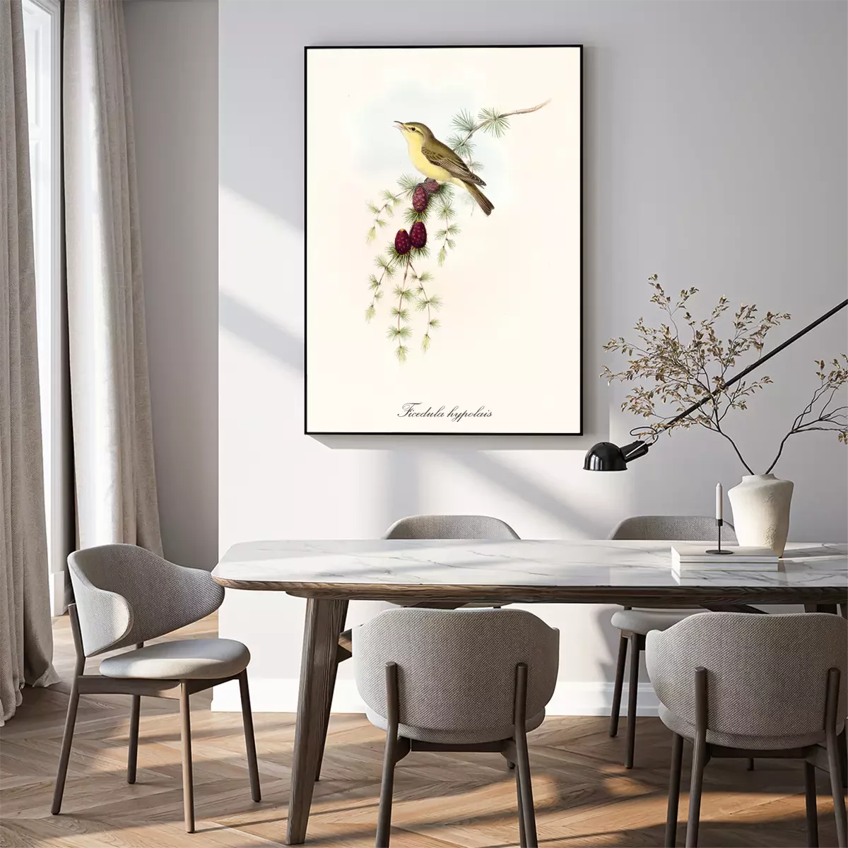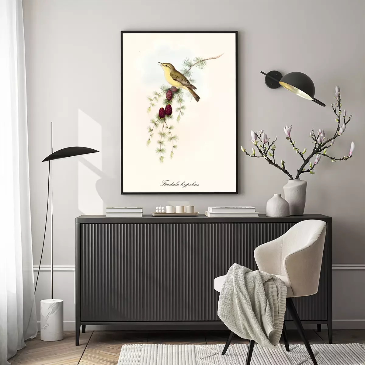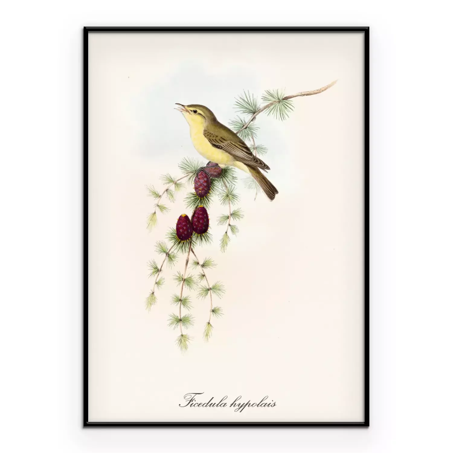 Two little cute brownish birds on a blade of grass. Old detailed and colorful illustration of Sedge Warbler (Acrocephalus schoenobaenus). By John Gould publ. In London 1862 - 1873