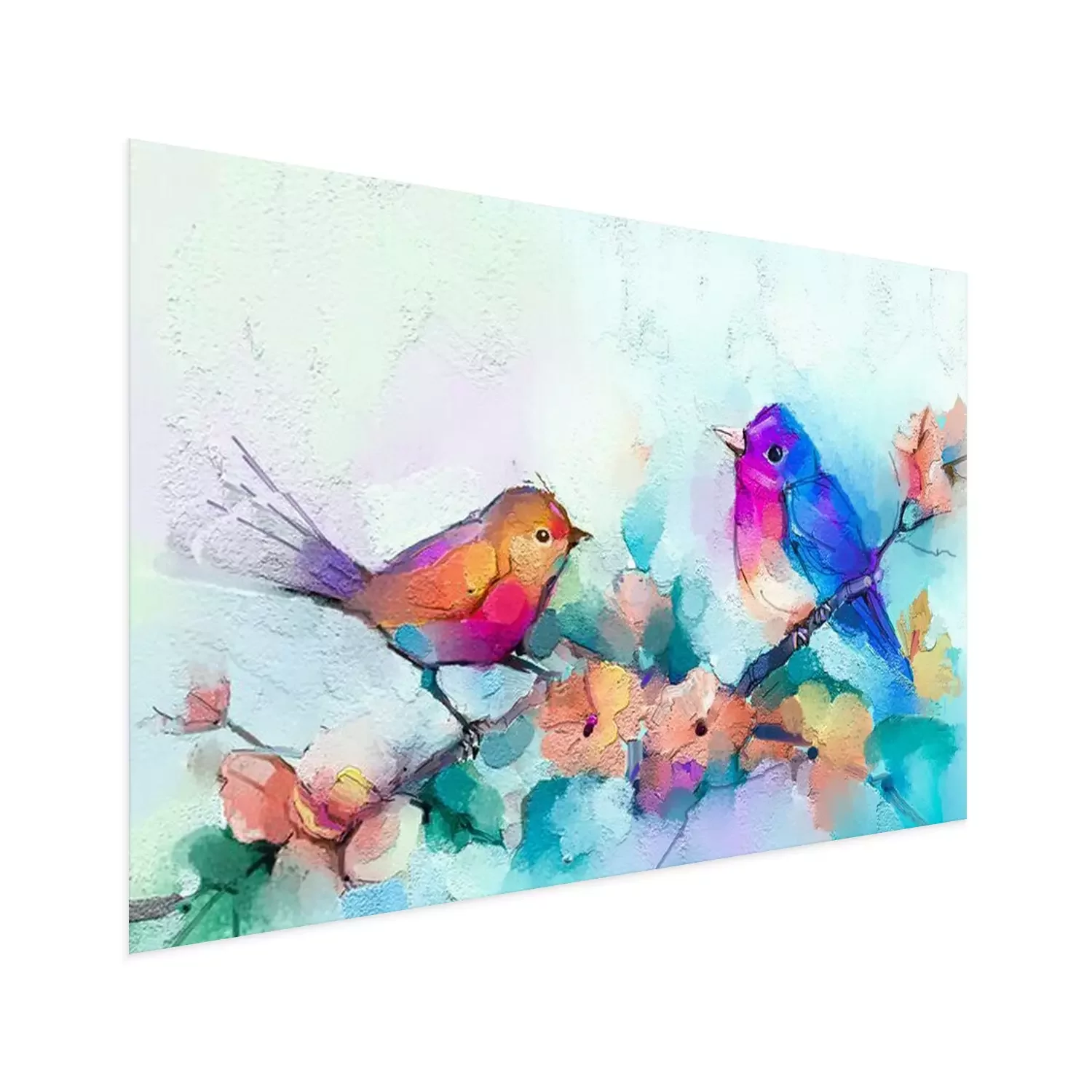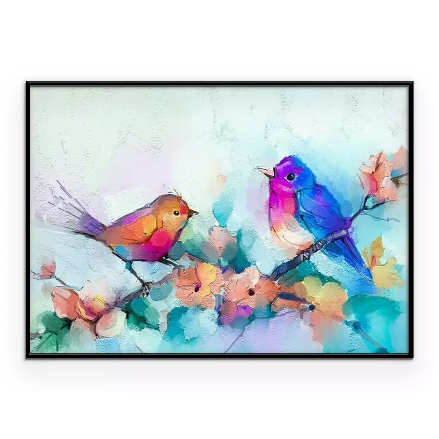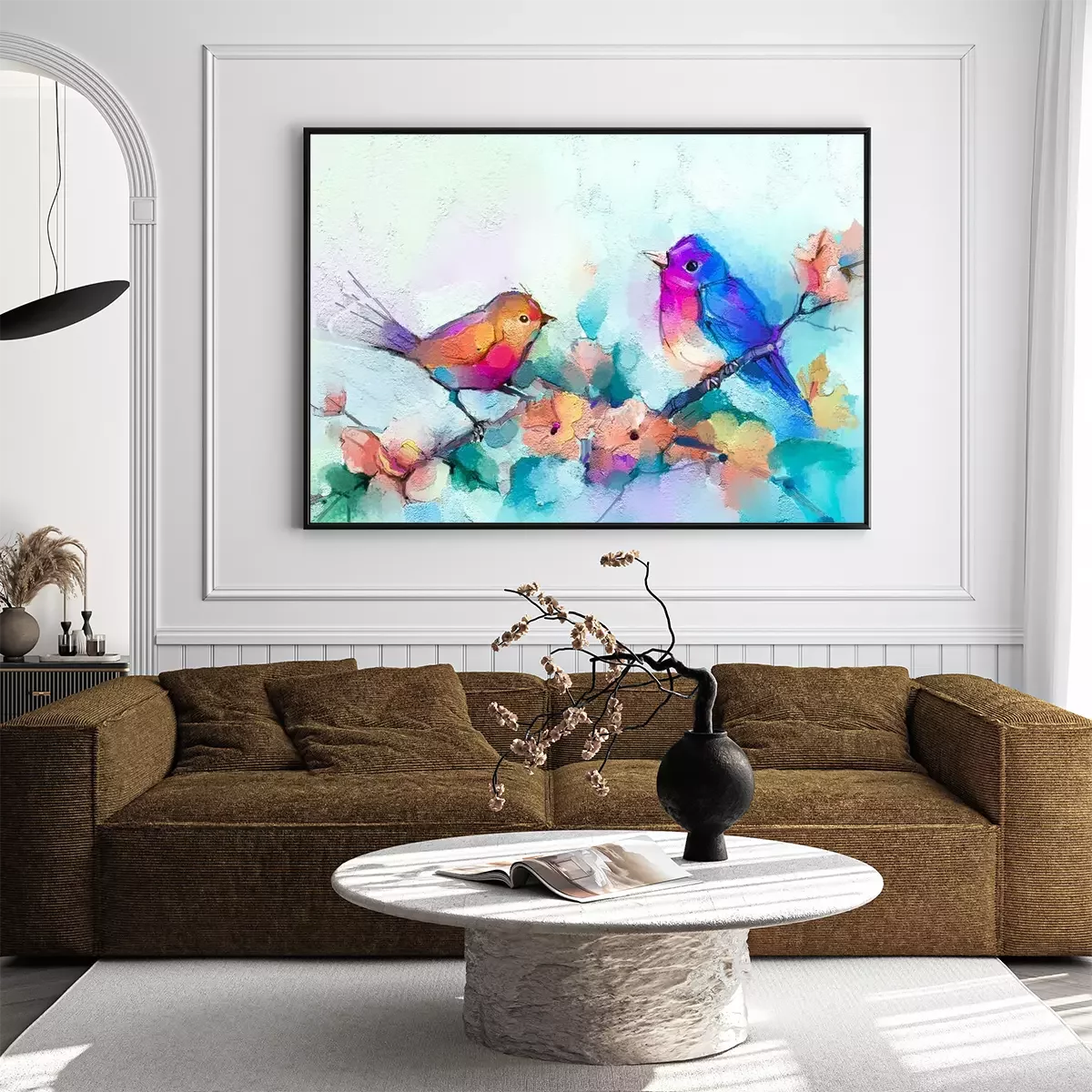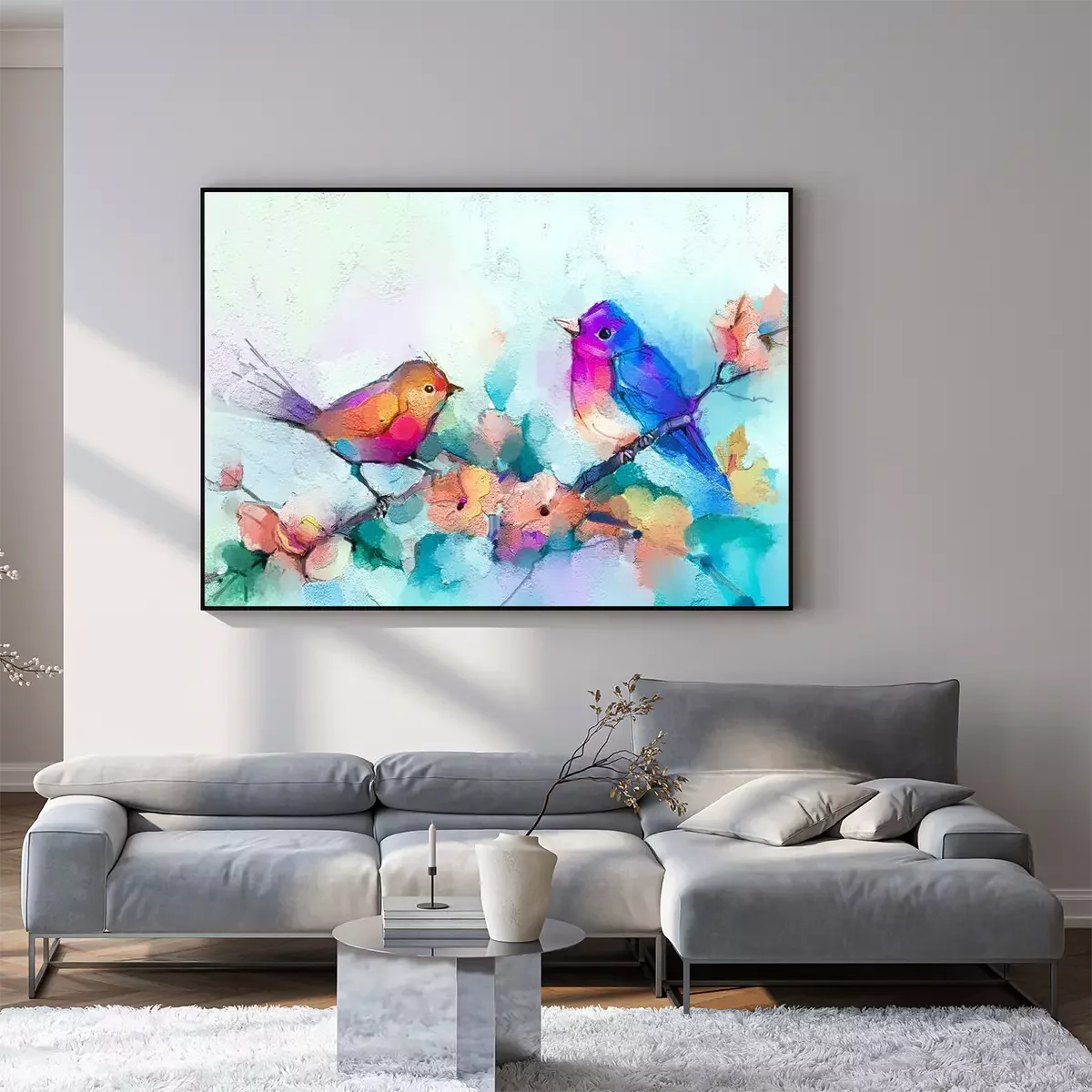 Abstract colorful oil, acrylic painting of bird and spring flower. Modern art paintings brush stroke on canvas. Illustration oil painting, animal and floral for background.