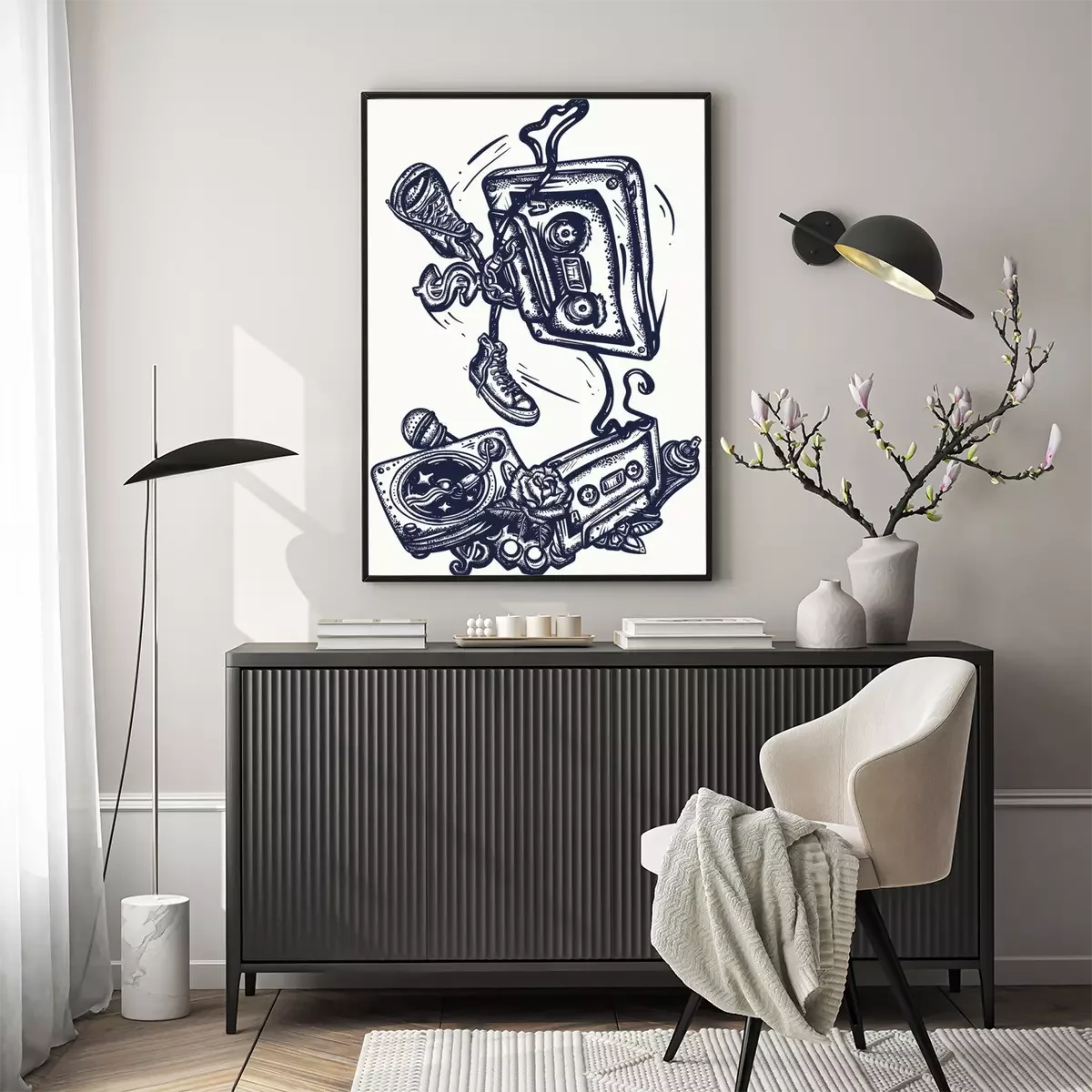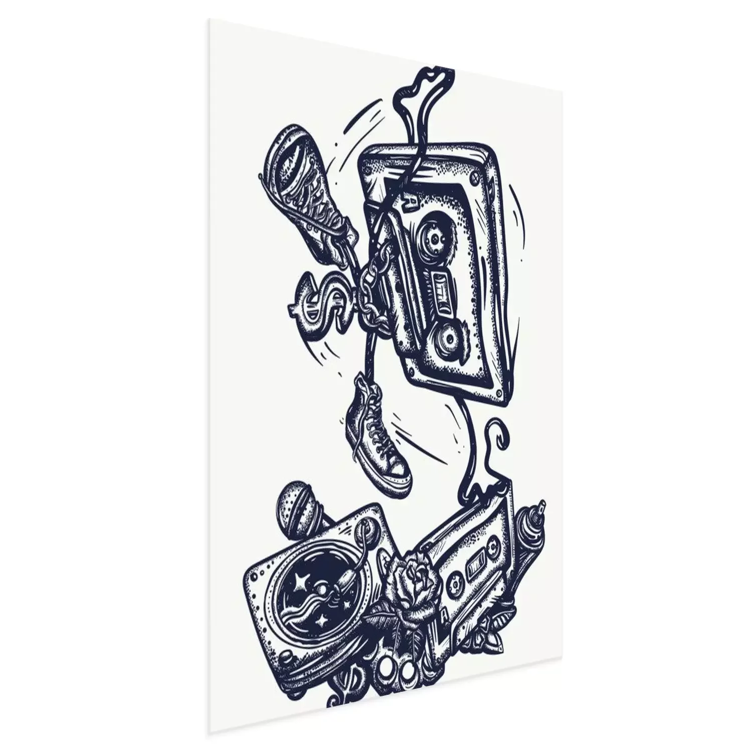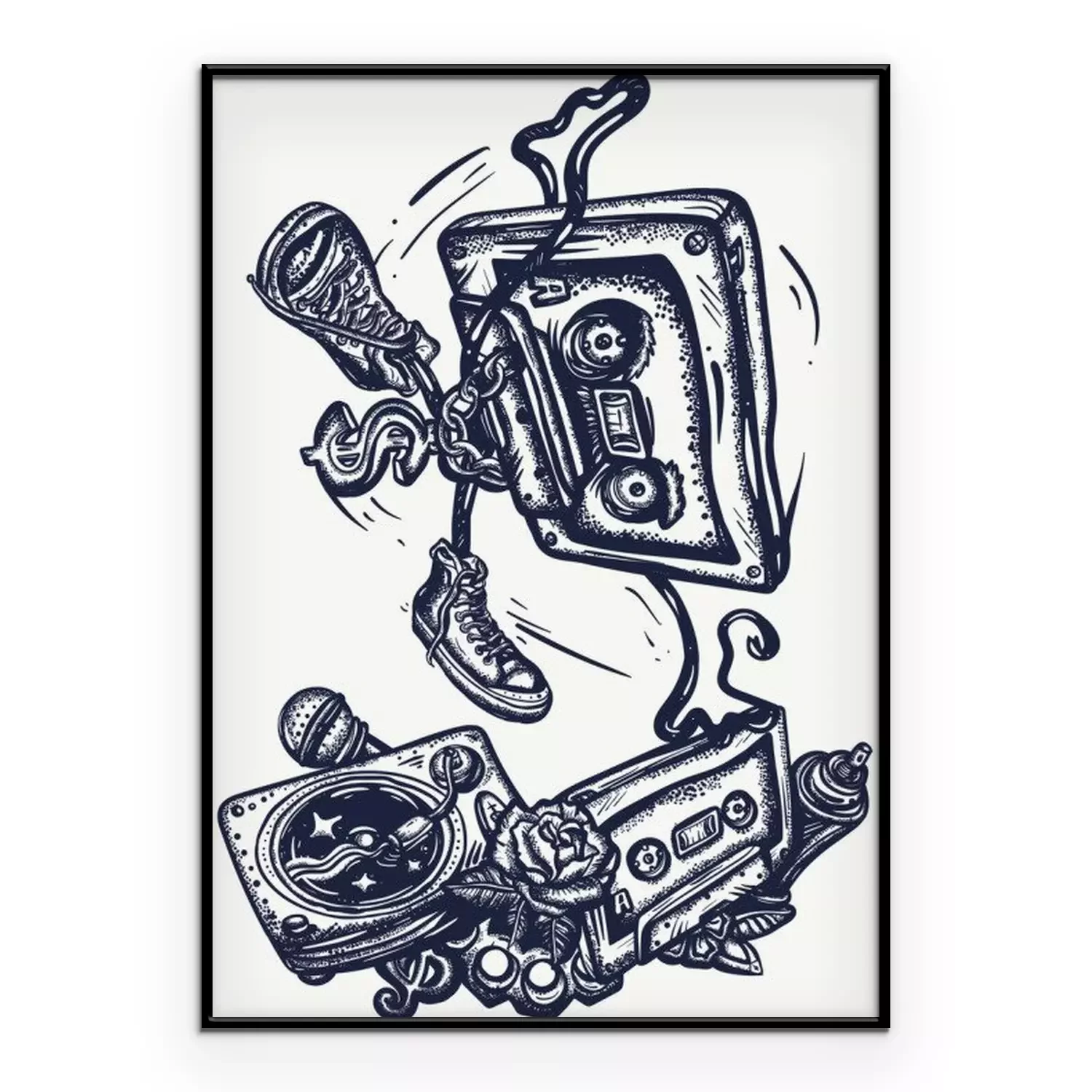 Poster  Old school music. Audio cassette dances break dance. Funny art. Musical street culture. Cool hip hop break dancer. Tattoo and t-shirt design. Vinyl, microphone, rap battle
