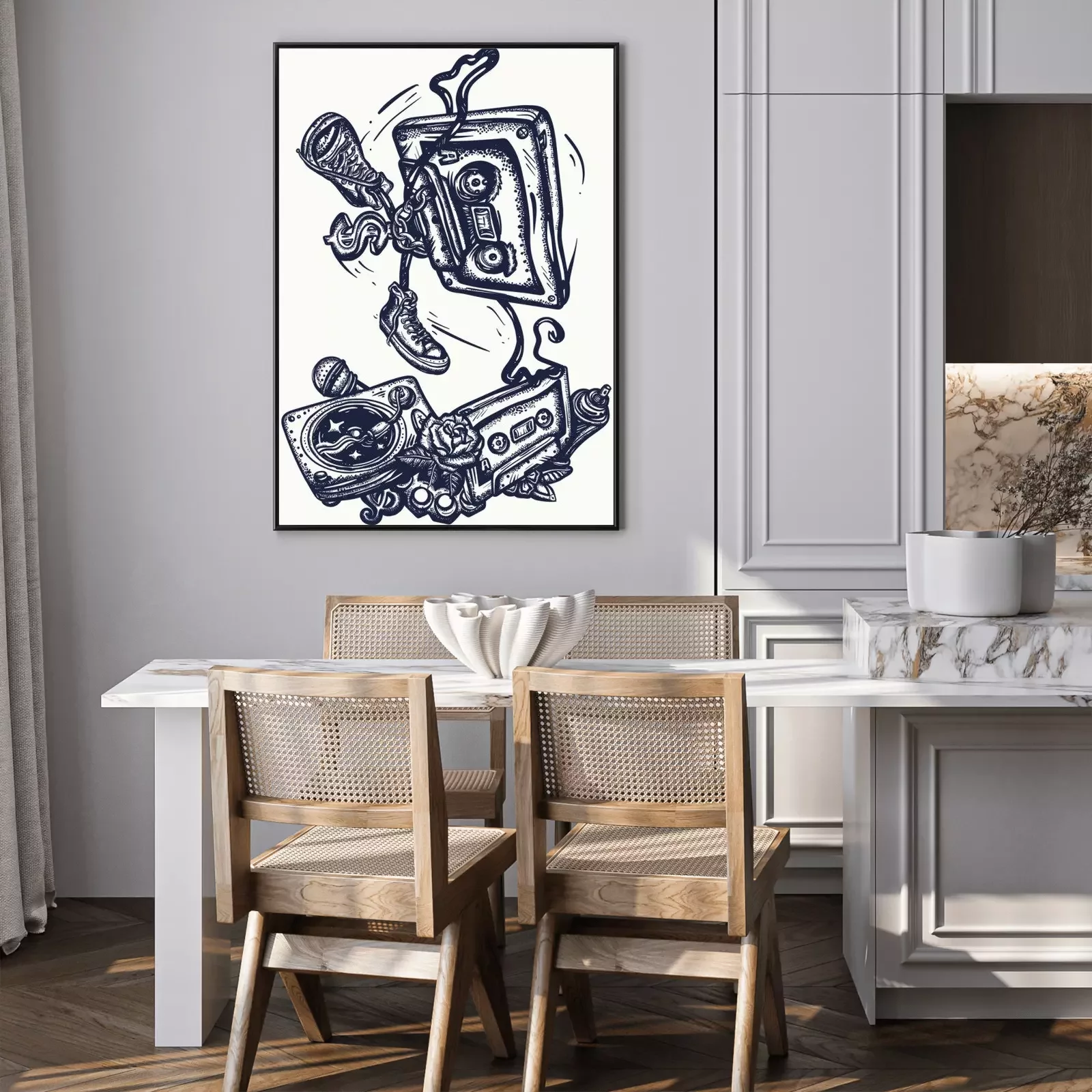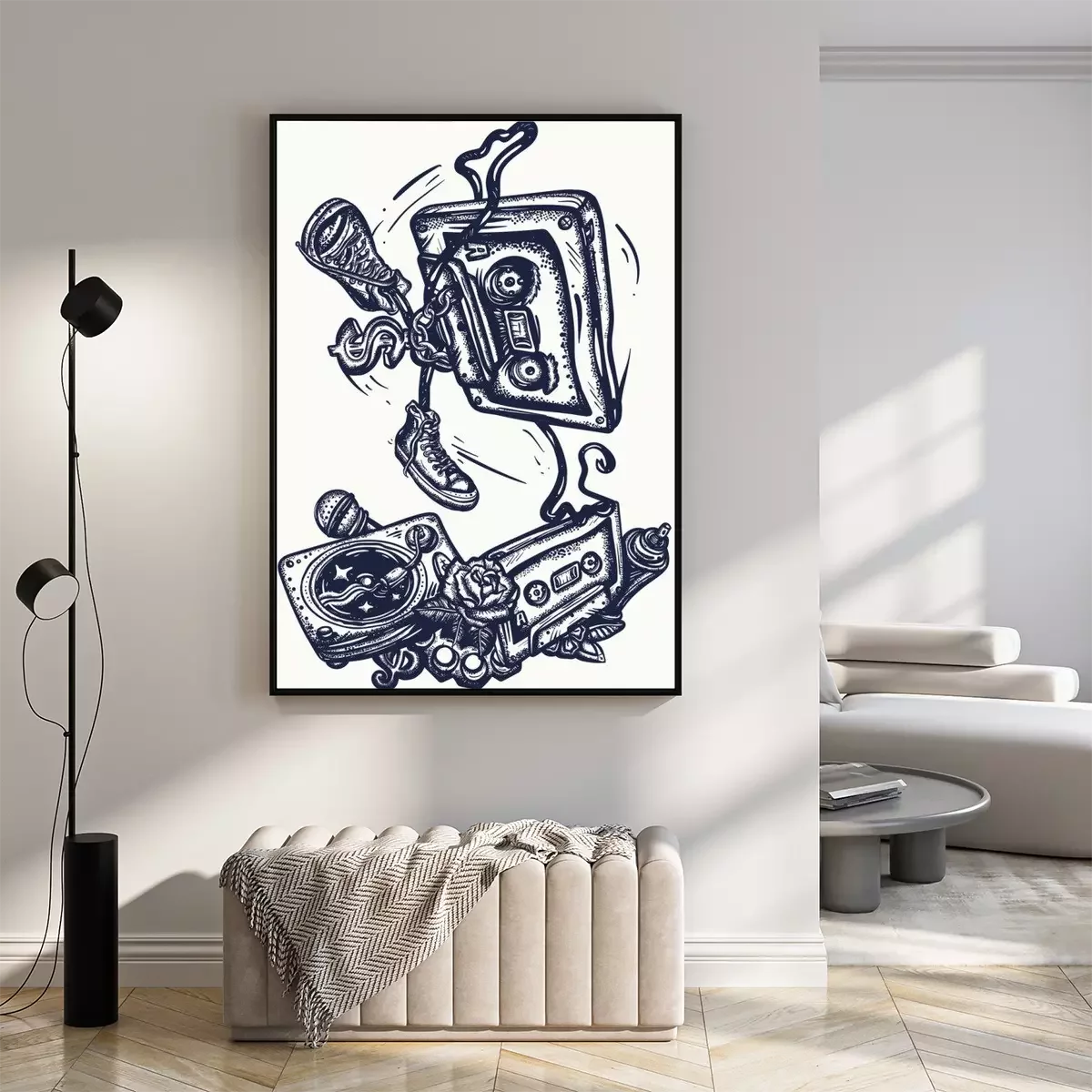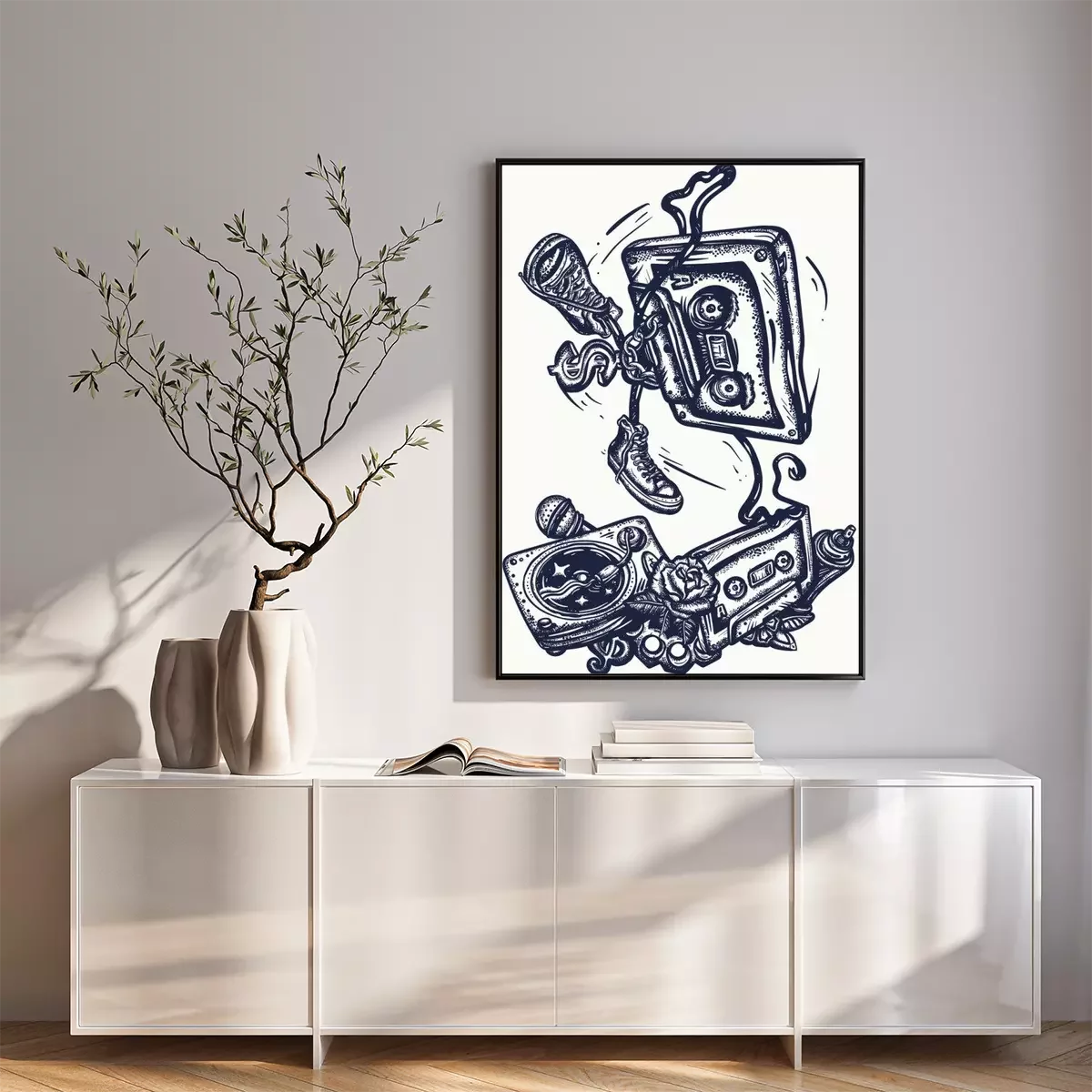 Poster  Old school music. Audio cassette dances break dance. Funny art. Musical street culture. Cool hip hop break dancer. Tattoo and t-shirt design. Vinyl, microphone, rap battle