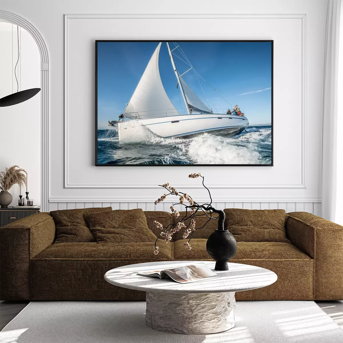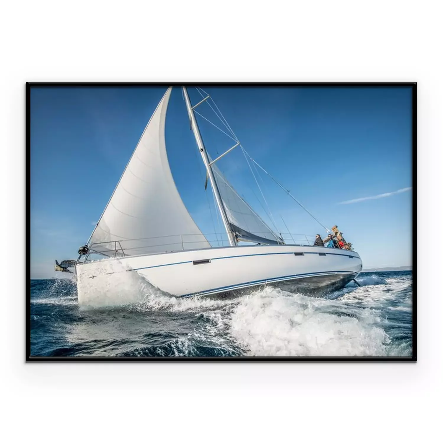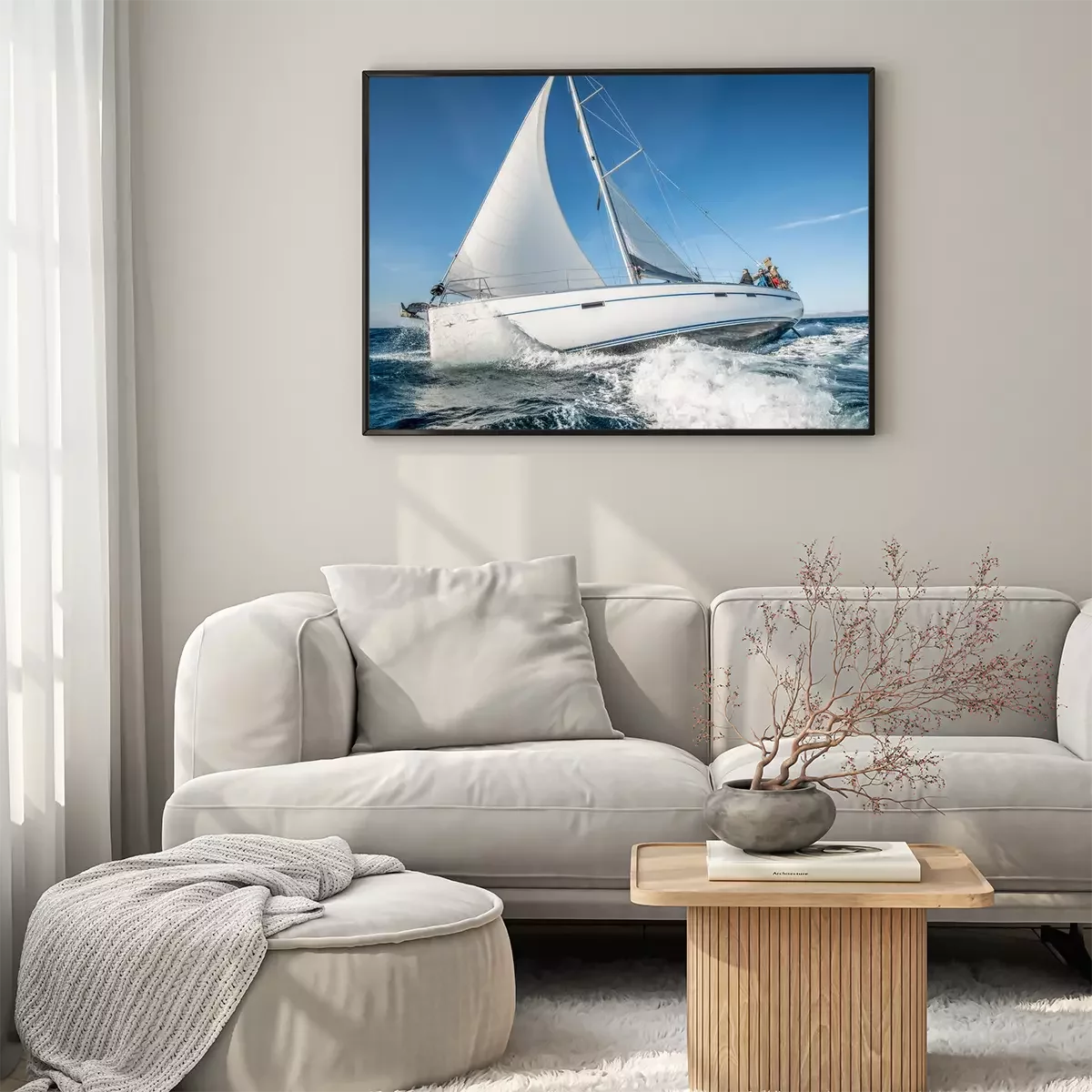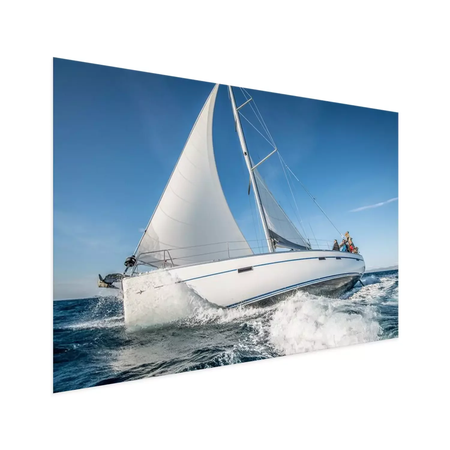 Poster  One white sailing yacht floats on the sea with waves and spray. The view from the side
