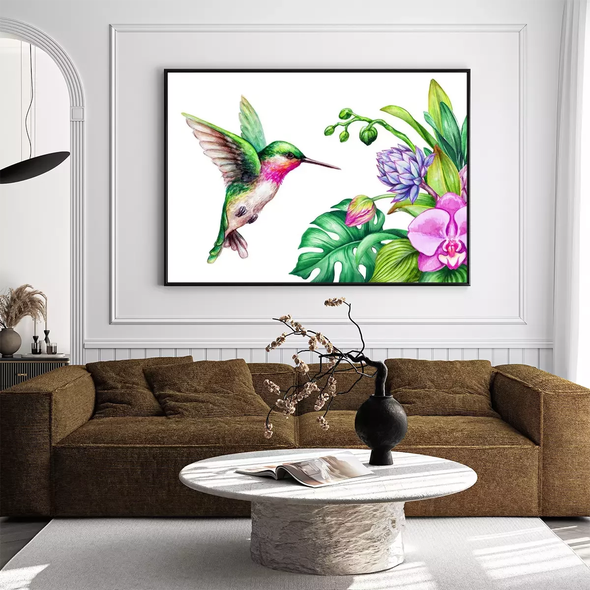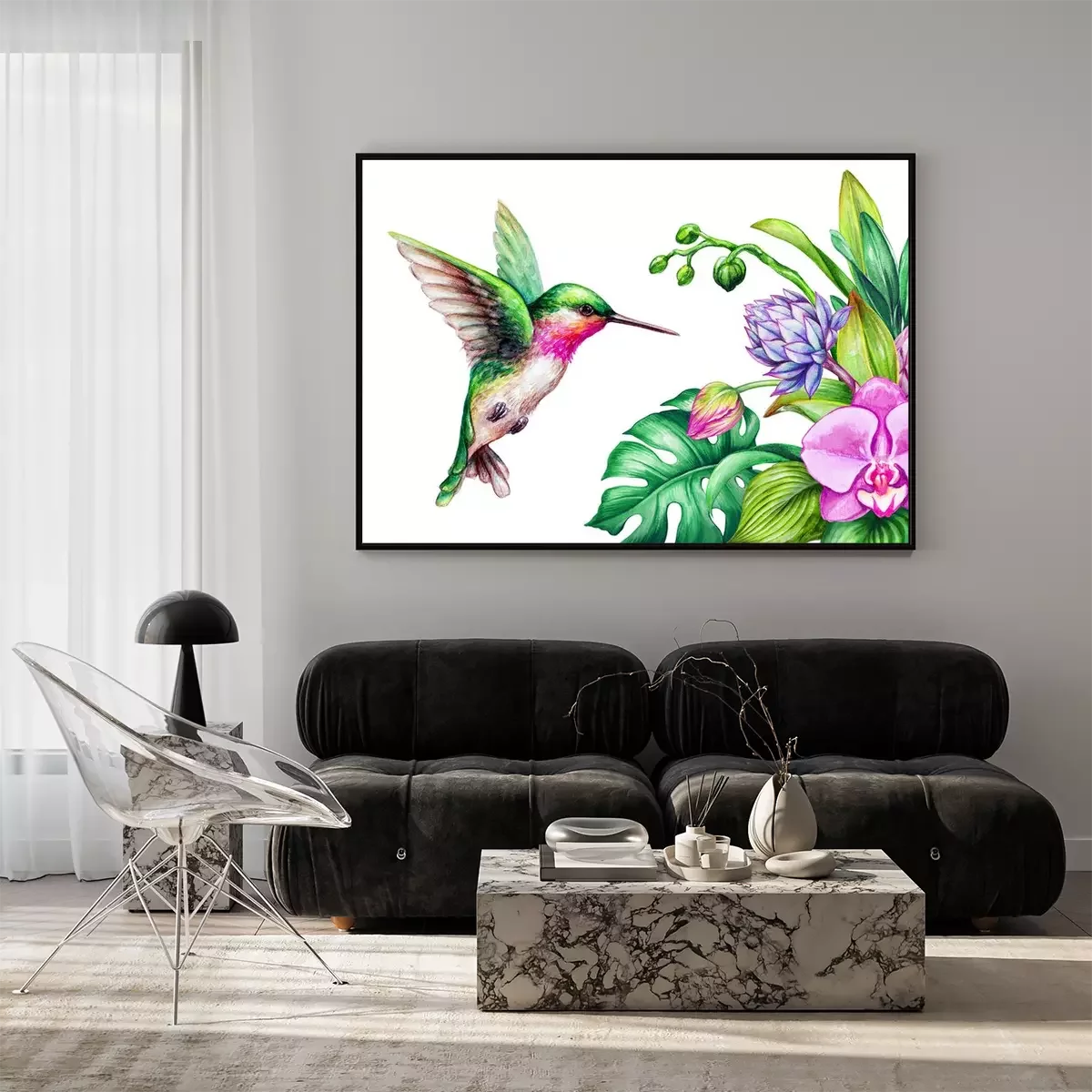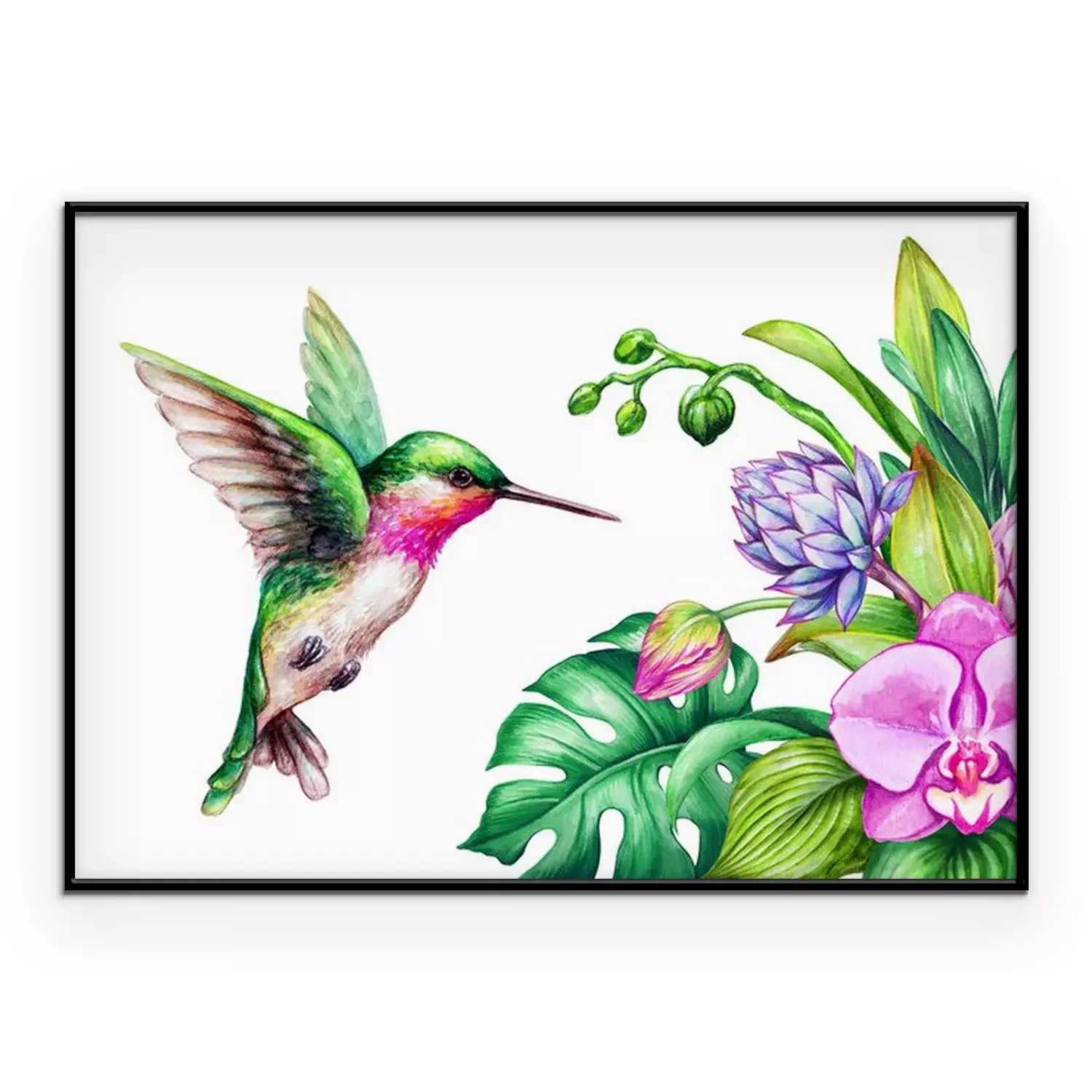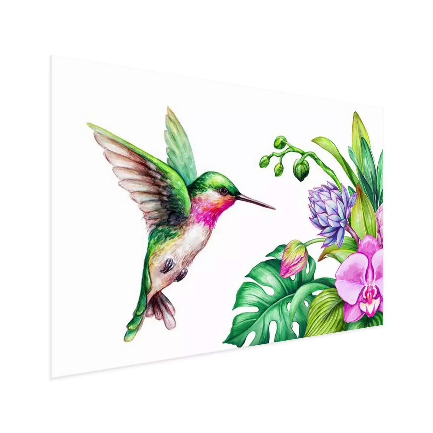 Poster : Orchidee in een boeket en een kleurrijke kolibrie