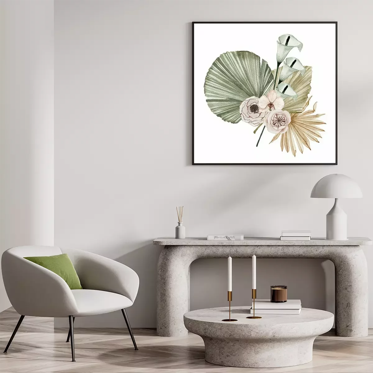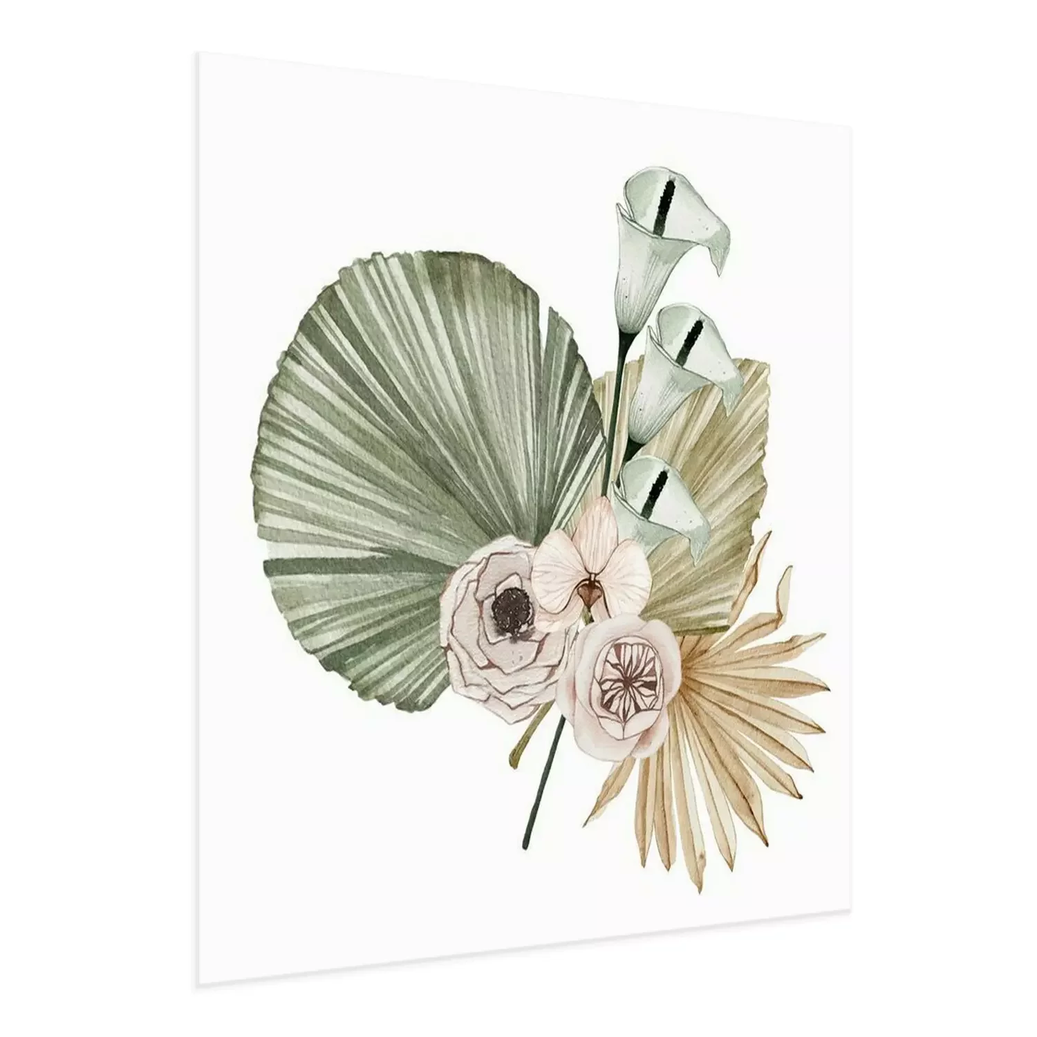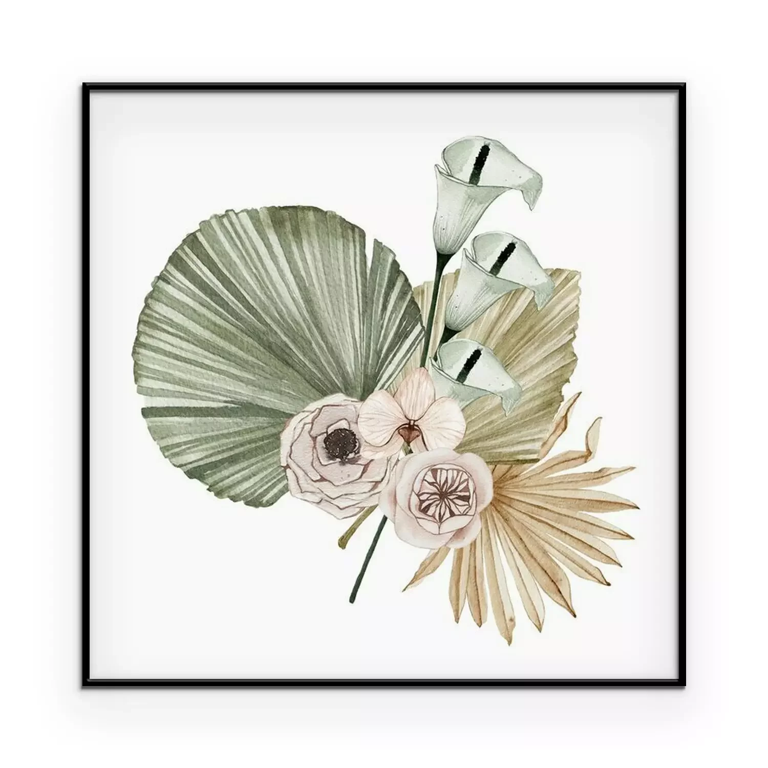 Watercolor summer floral tropical bouquet with orchid rose flowers dried palm leaves isolated. Floral spring arrangement blossom boho wedding invitation save the date card illustration
