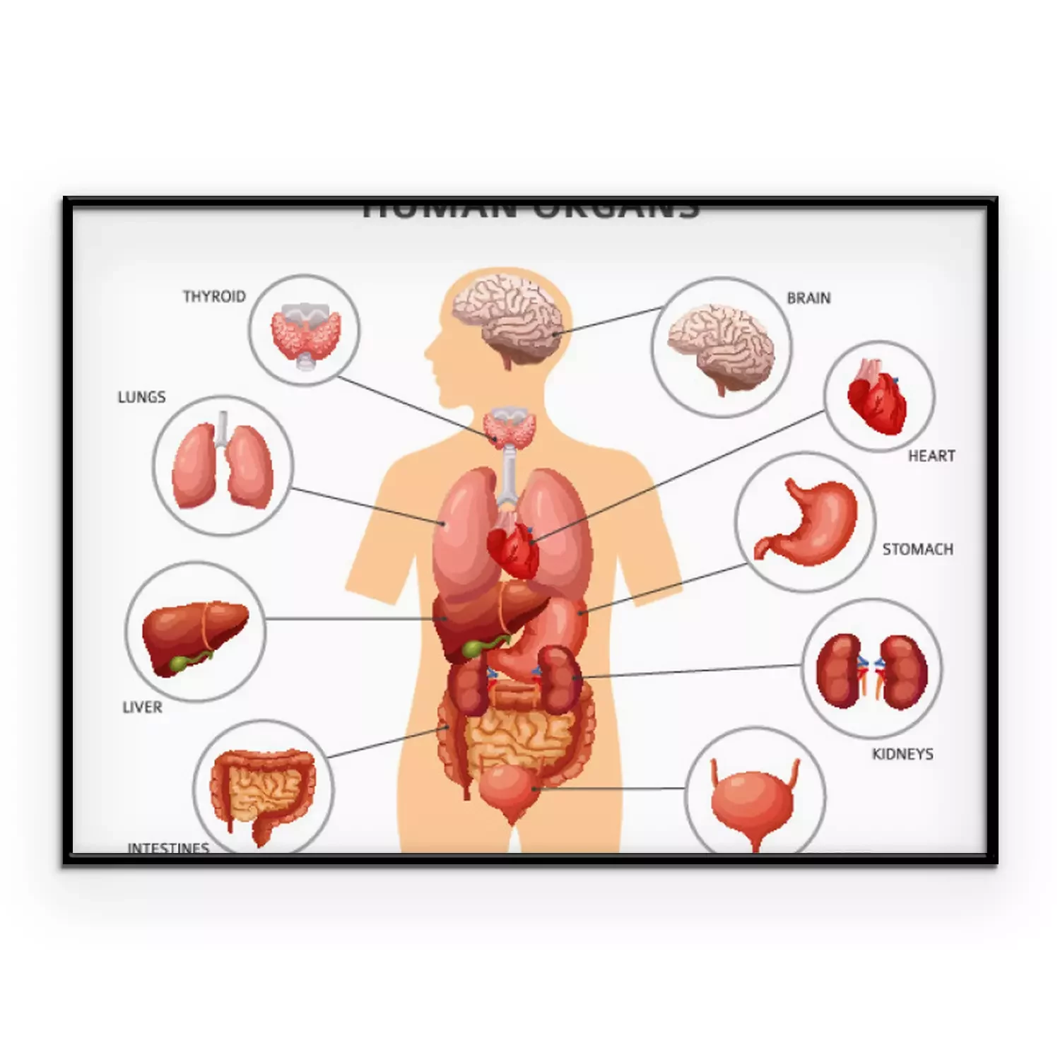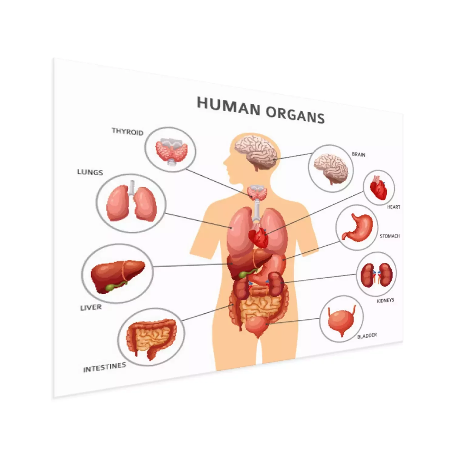 Poster : Organes internes du corps humain. Estomac et poumons, reins et coeur, cerveau et foie. Infographie vectorielle anatomie médicale. Illustration du corps humain, du foie et du cerveau, du cœur et des or