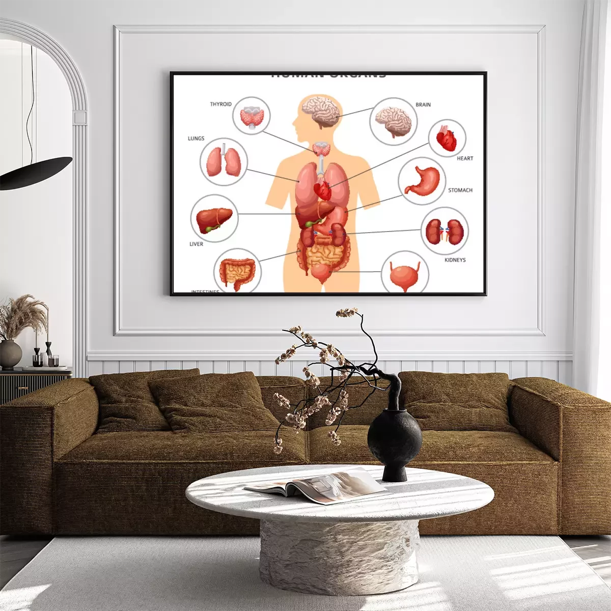 Poster  Organes internes du corps humain. Estomac et poumons, reins et coeur, cerveau et foie. Infographie vectorielle anatomie médicale. Illustration du corps humain, du foie et du cerveau, du cœur et des or