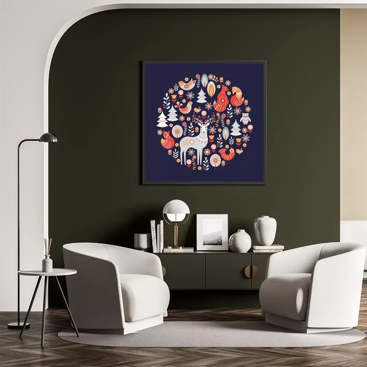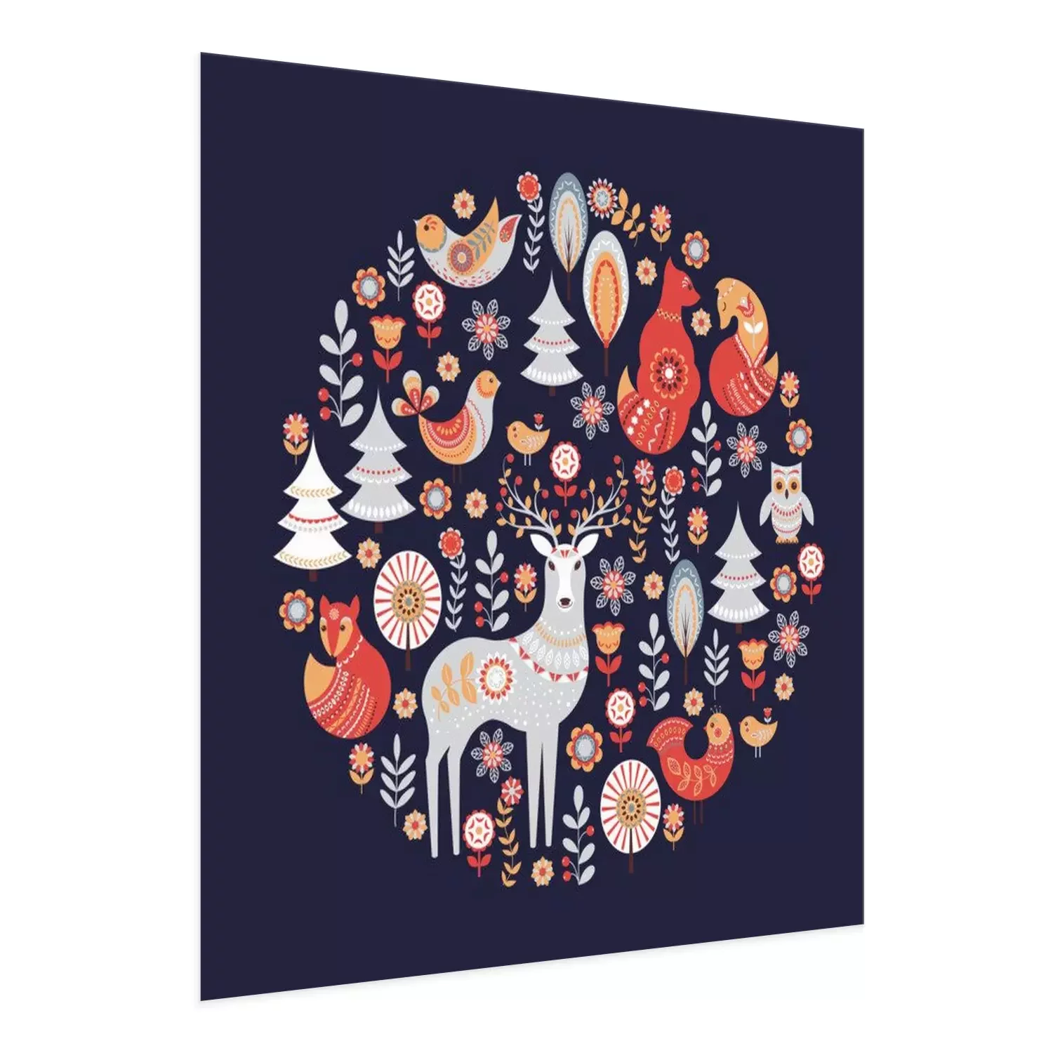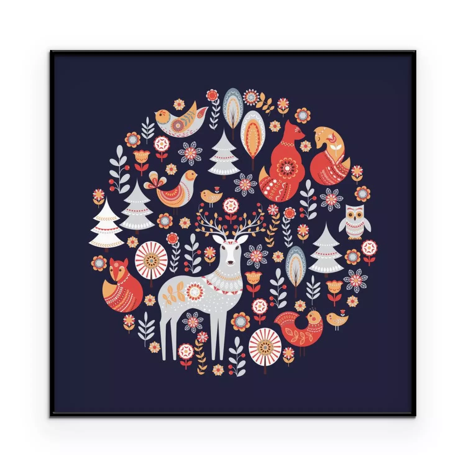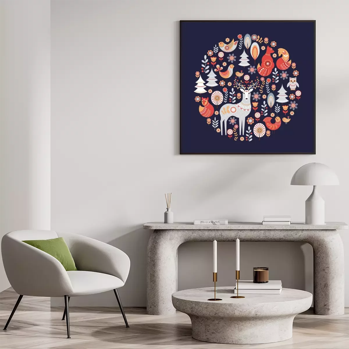 Poster  Ornement circulaire décoratif avec des animaux, des oiseaux, des fleurs et des arbres.