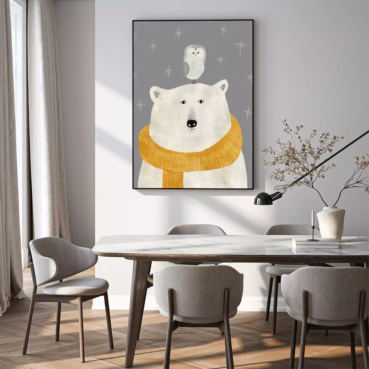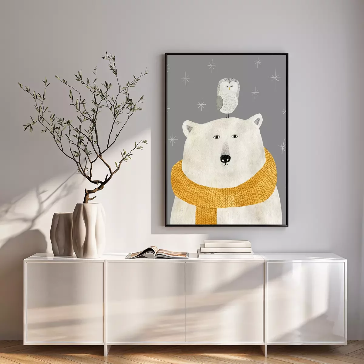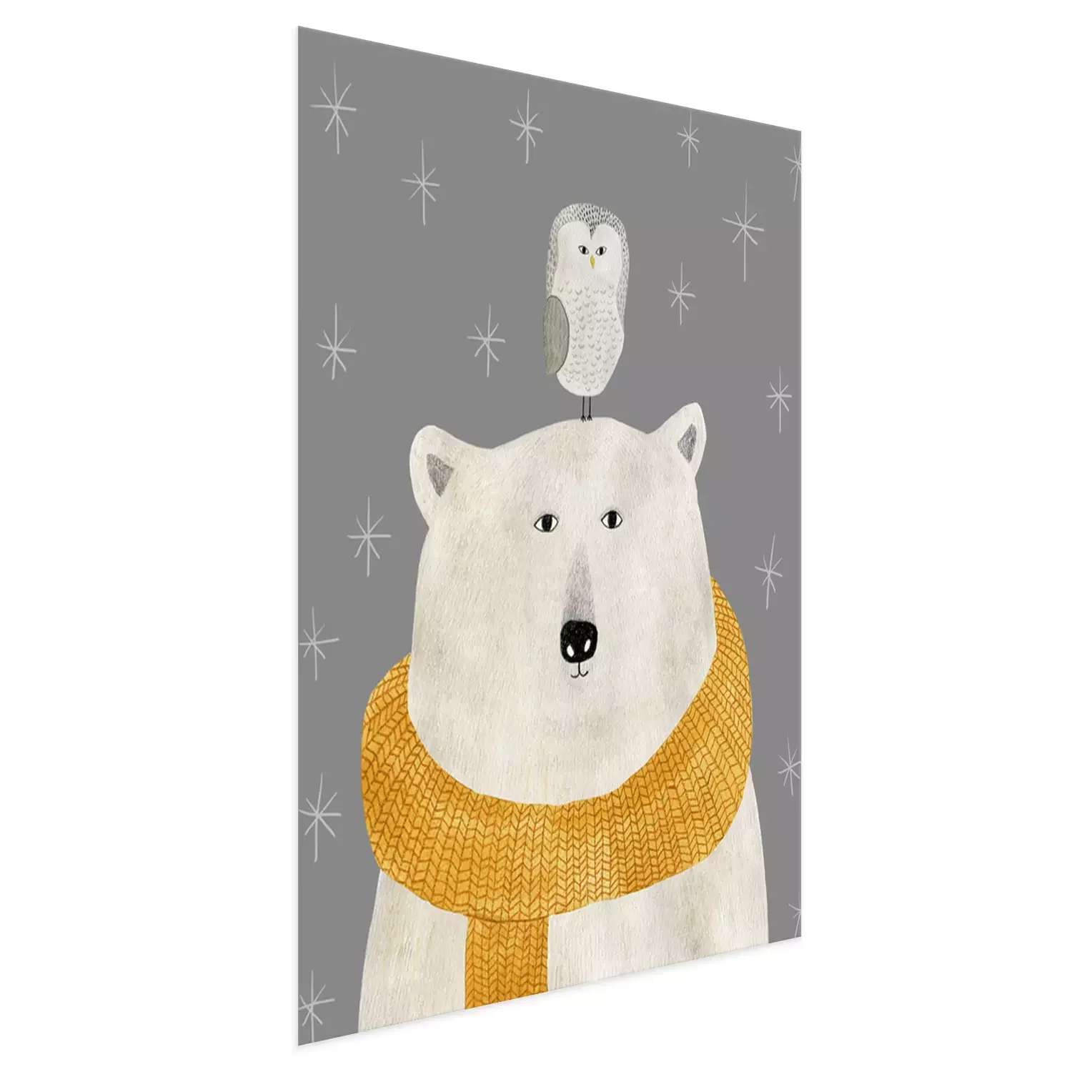 Poster : Ours blanc avec un hibou sur la tête