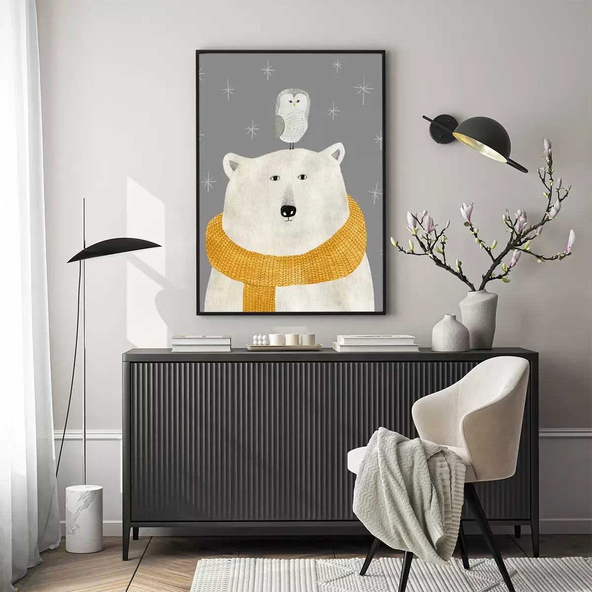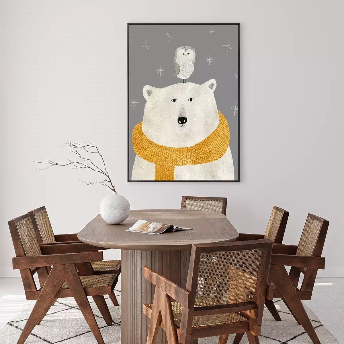 Poster  Ours blanc avec un hibou sur la tête