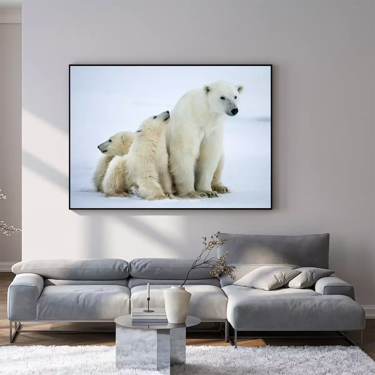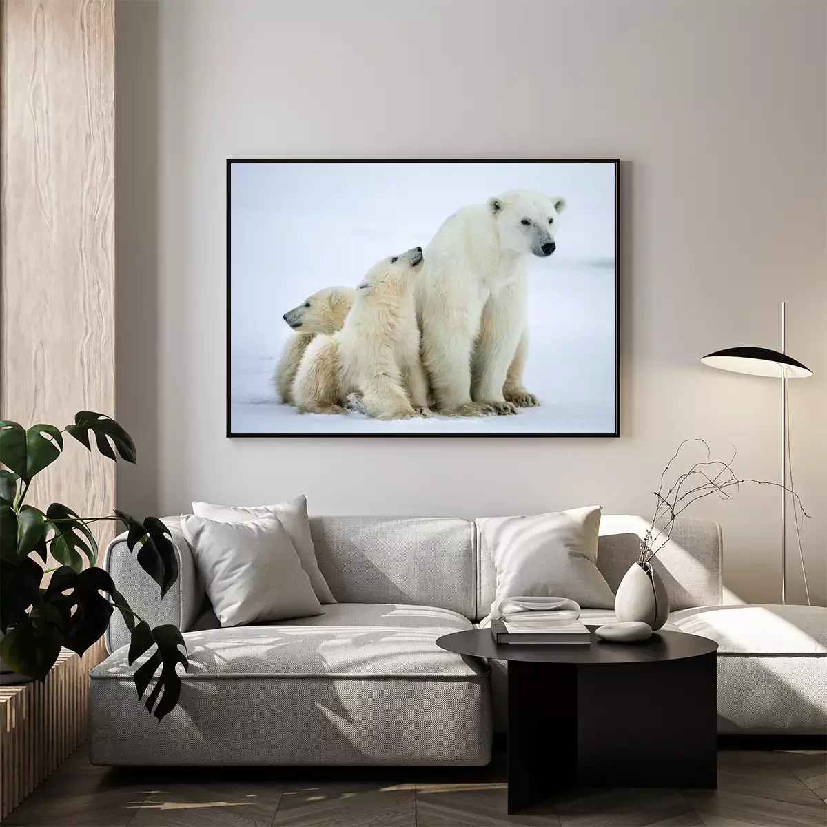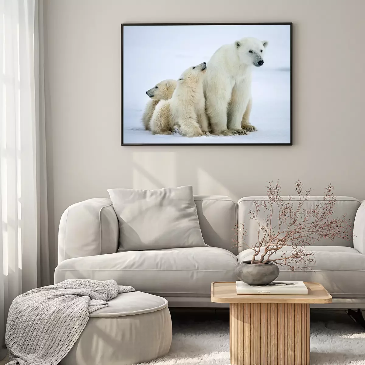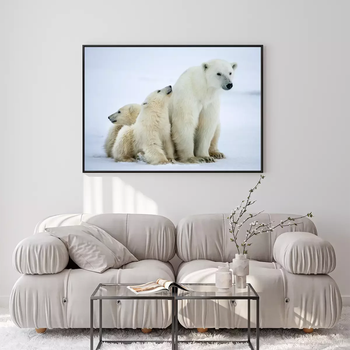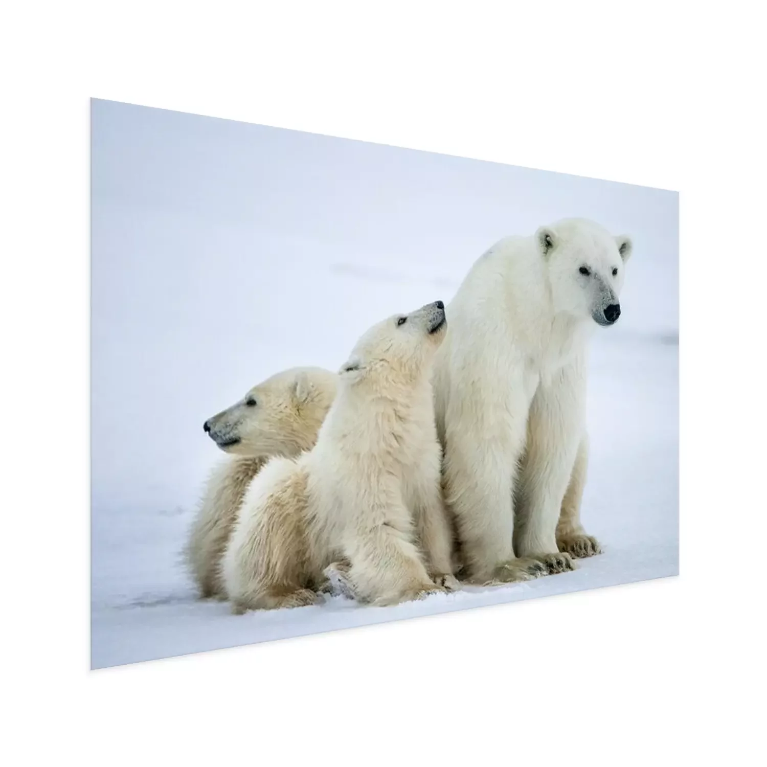 Poster : Ours polaire avec des oursons. Une ours polaire avec deux petits oursons sur la neige.