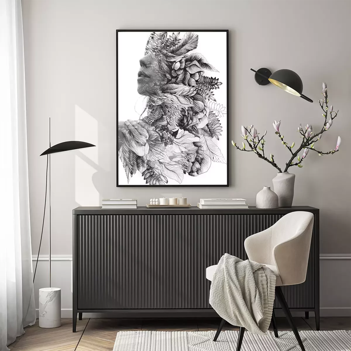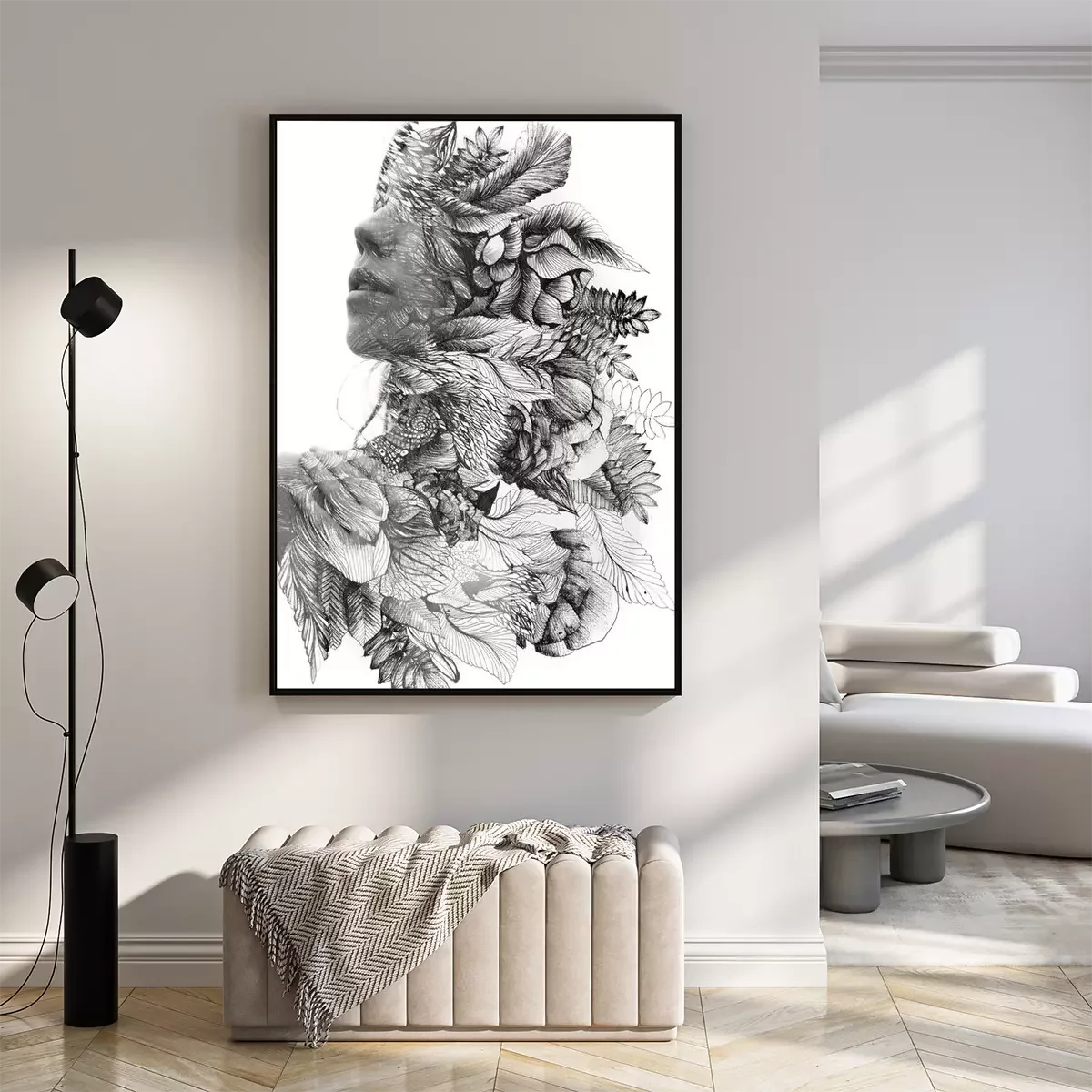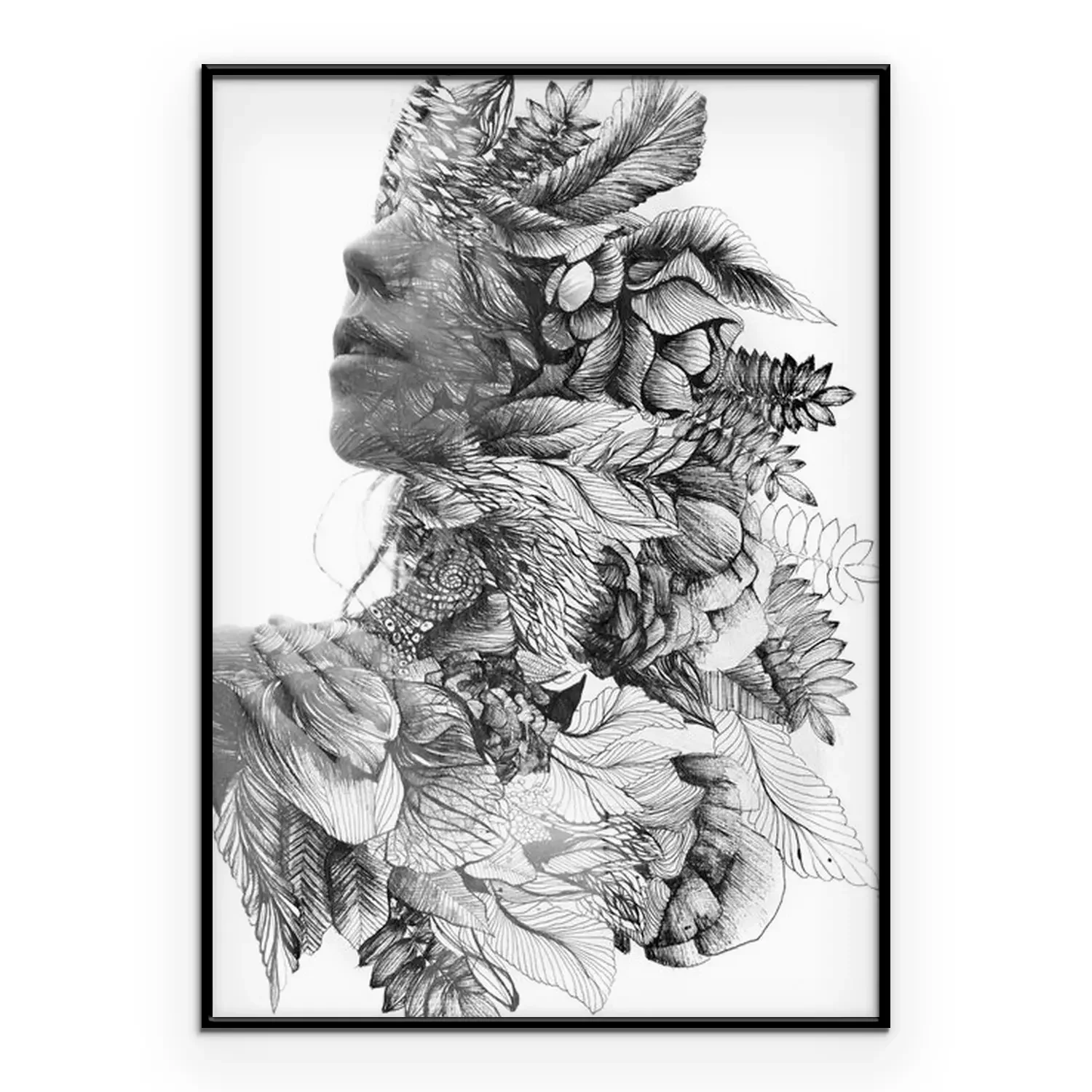 Poster  Paintography. Double exposure close up portrait of a young natural beauty, with face and hair combined with hand drawn leaves and flowers dissolving into the background, black and white