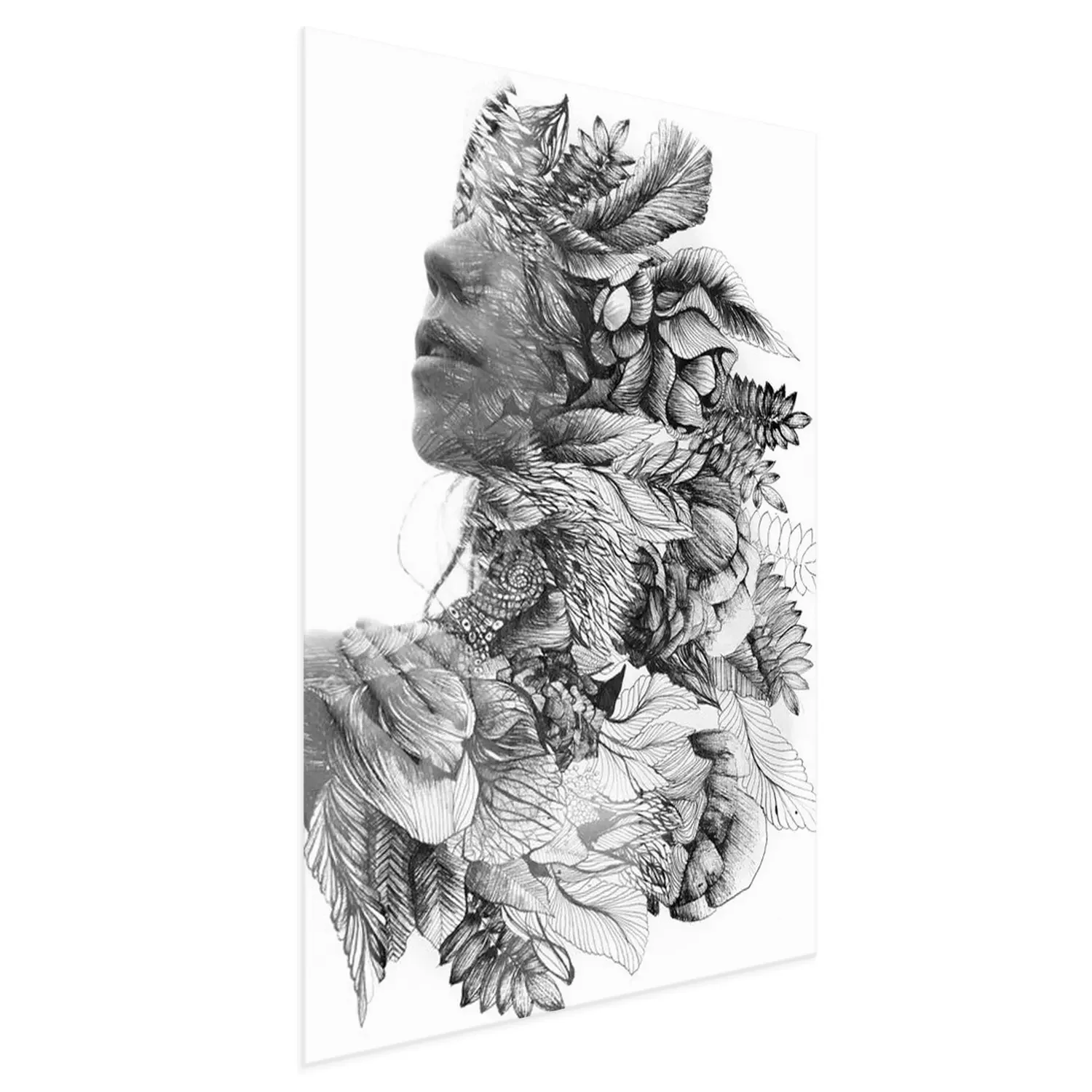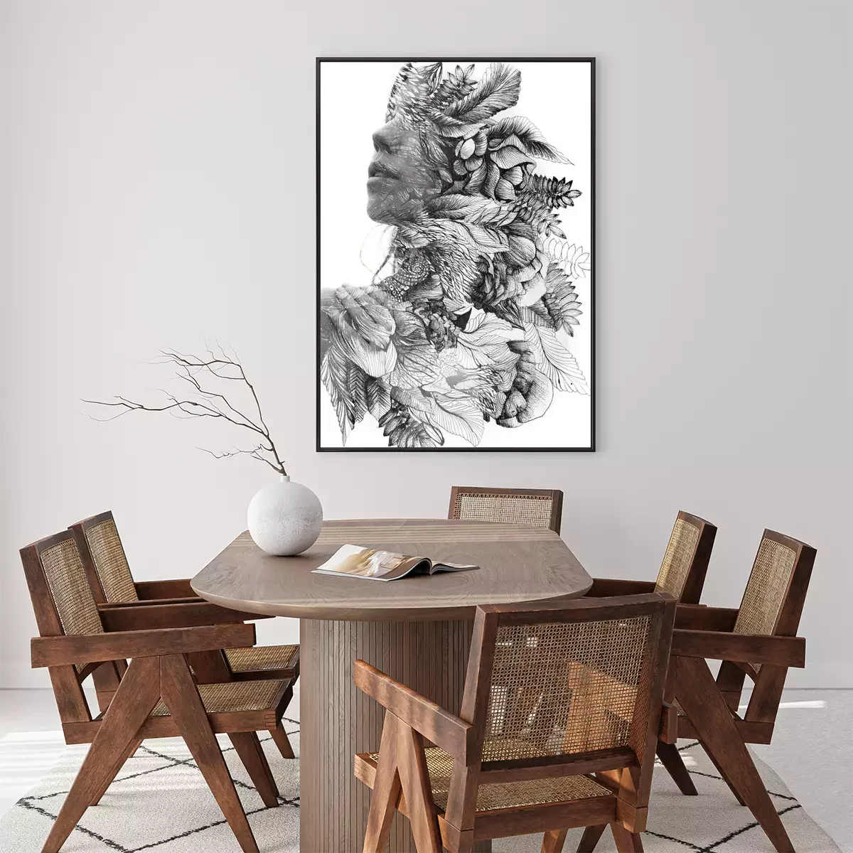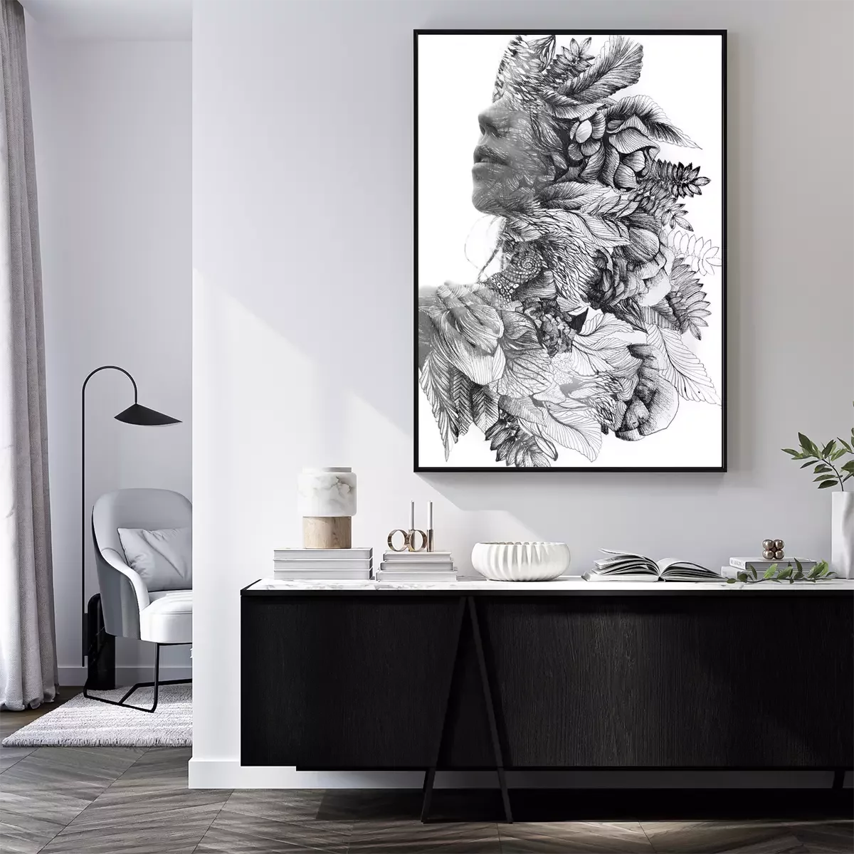 Poster  Paintography. Double exposure close up portrait of a young natural beauty, with face and hair combined with hand drawn leaves and flowers dissolving into the background, black and white