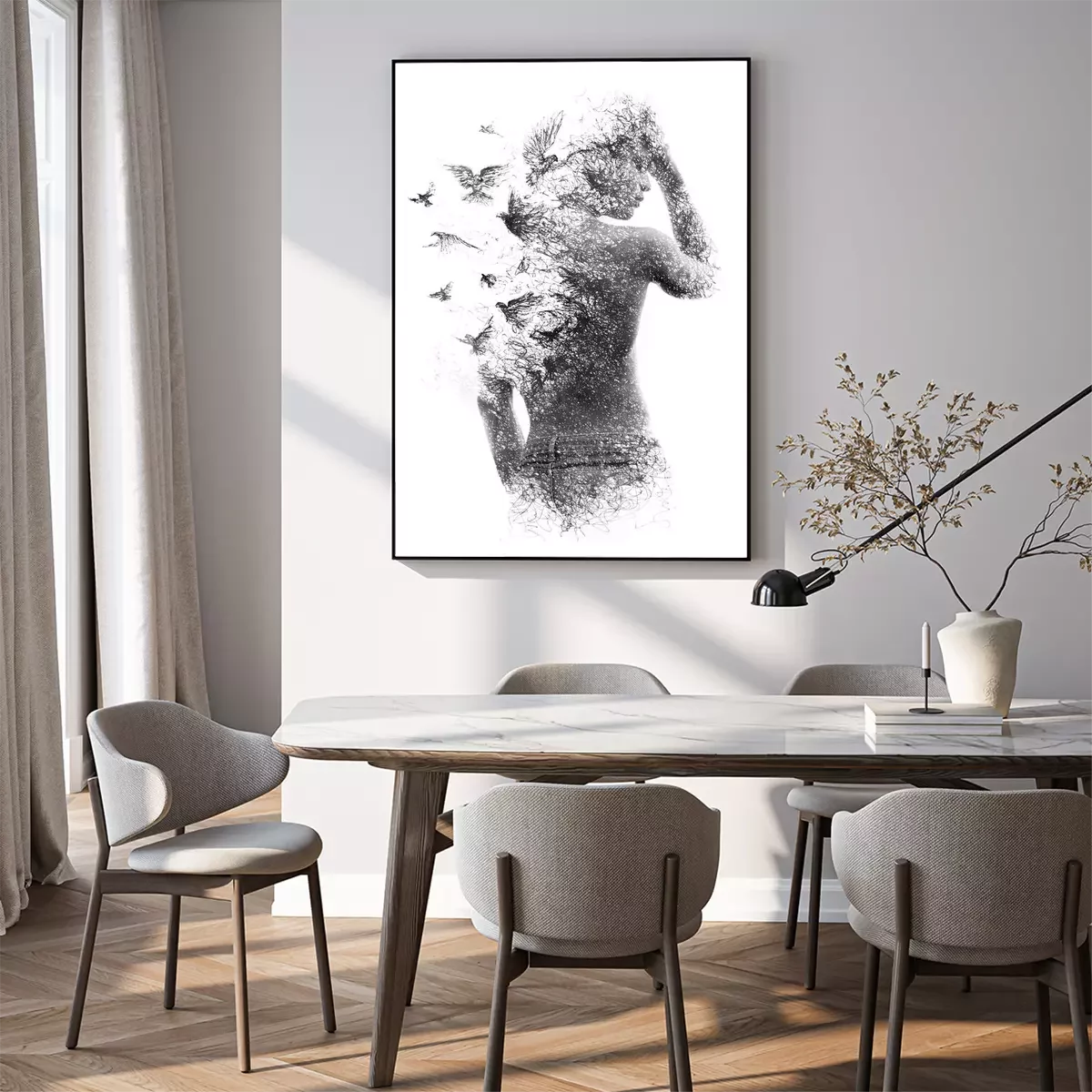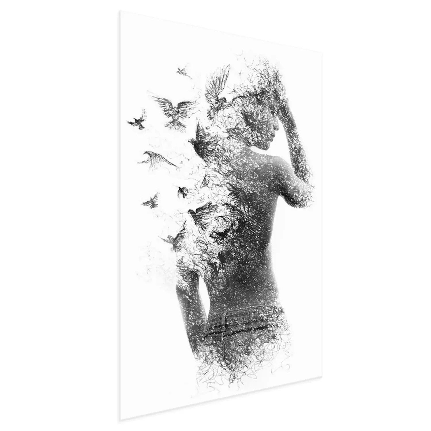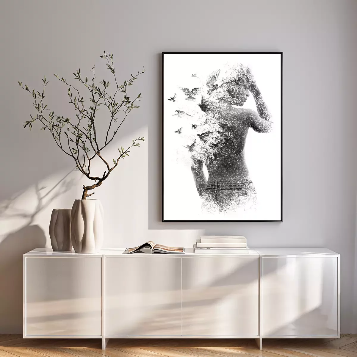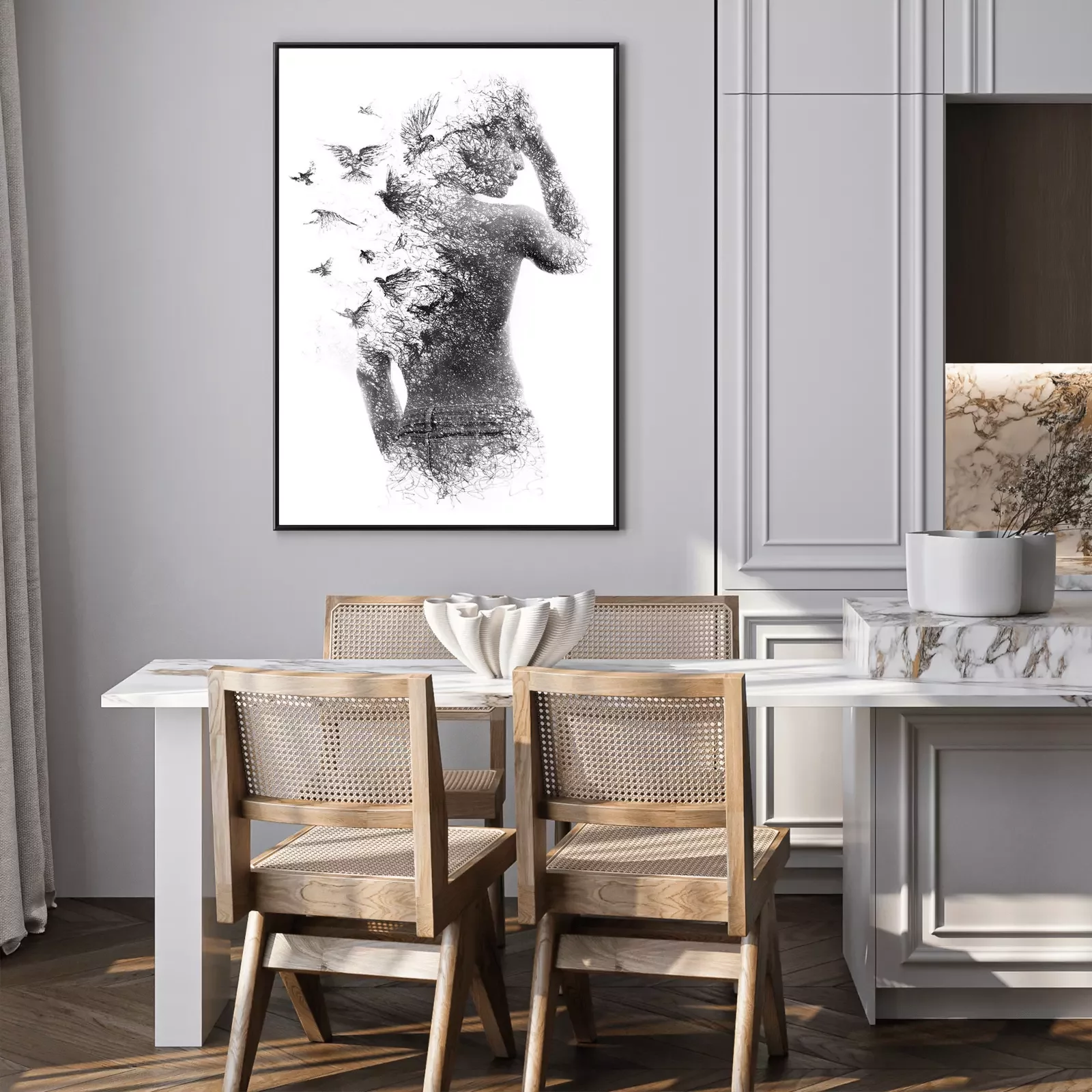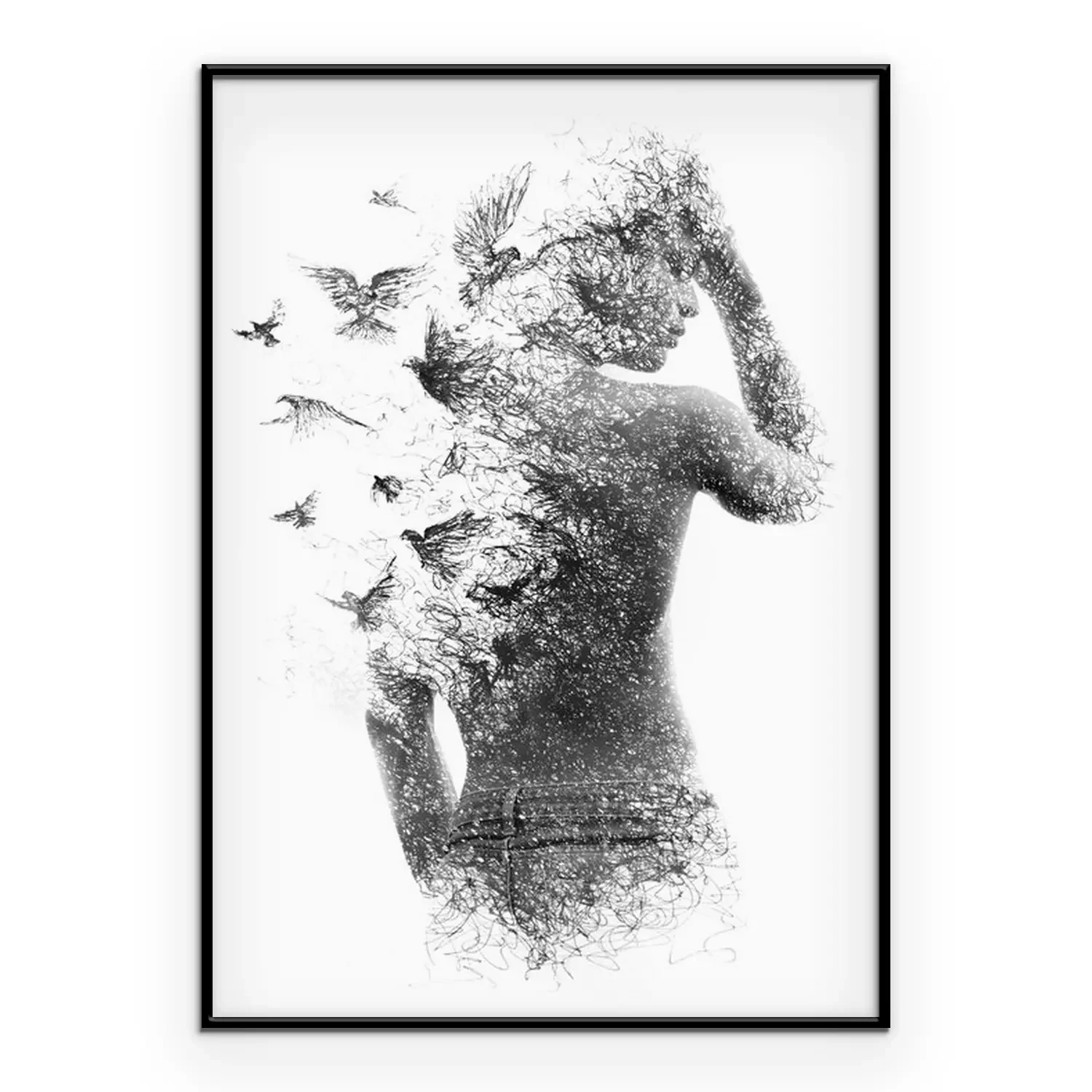 Poster  Paintography. Double exposure of a shirtless male model combined with handmade pen drawing of birds flying away and disintegrating, black and white