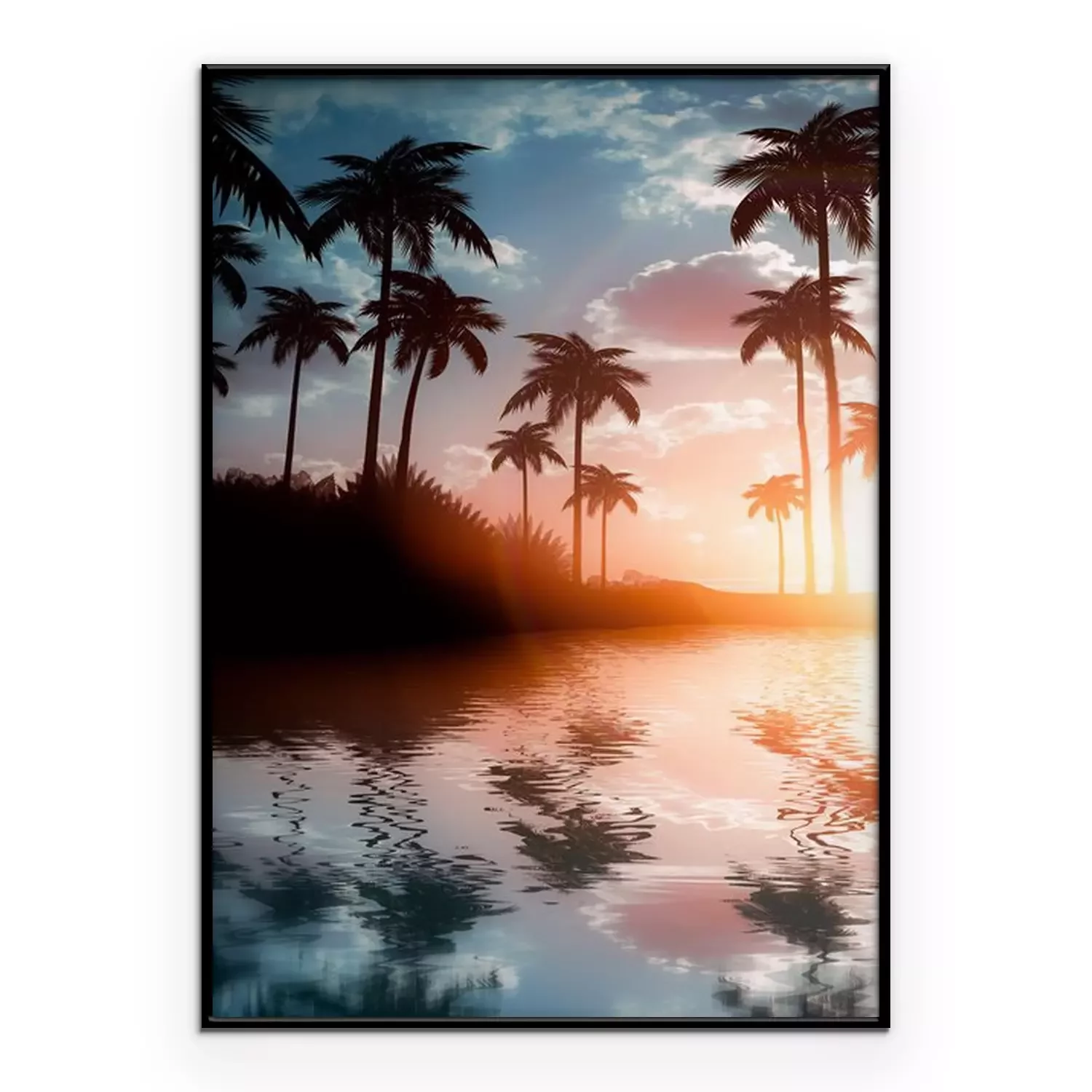 Poster  Palmiers au coucher du soleil reflétés dans l'eau