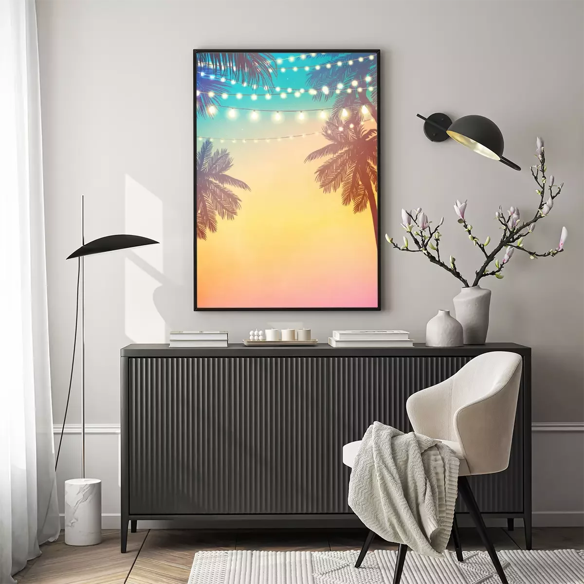 Poster  Palmiers et lampes au coucher du soleil