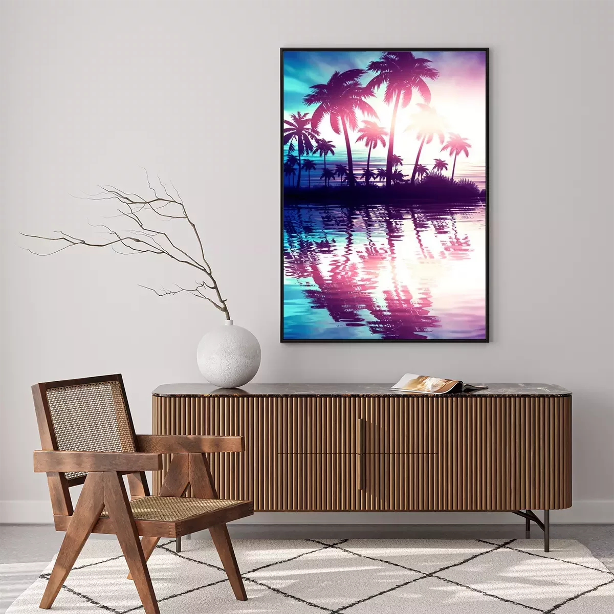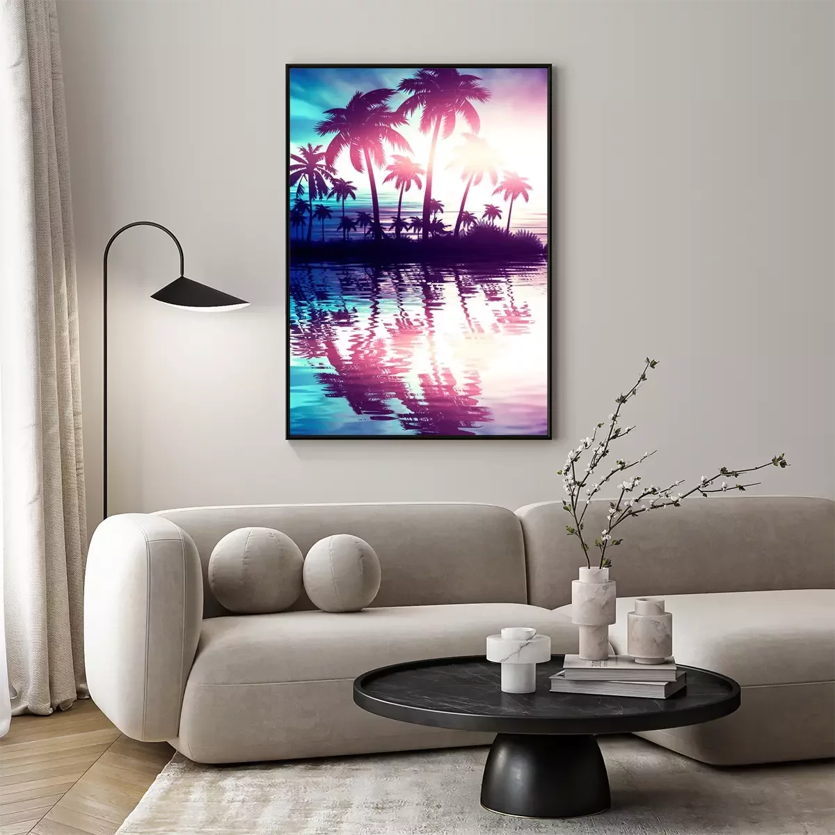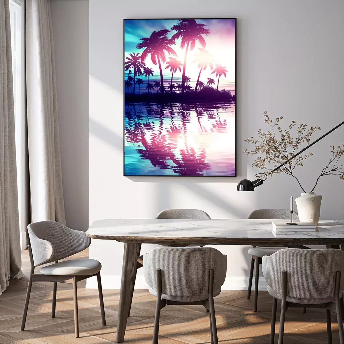 Empty tropical background of night sea beach. Silhouettes of tropical palm trees on a background of bright sunset. 3d illustration