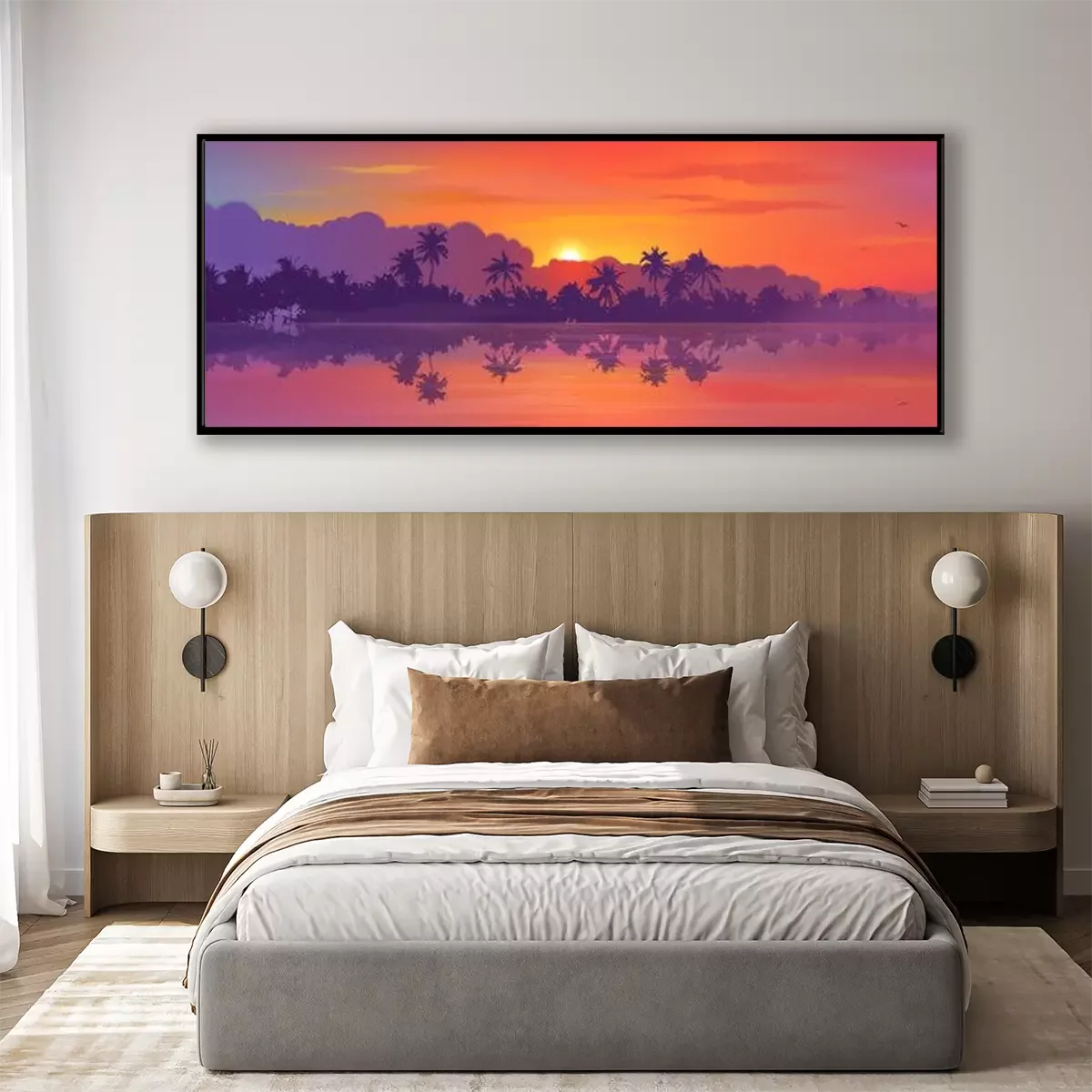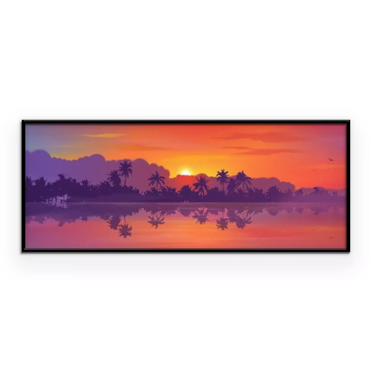 Dark palm trees silhouettes on colorful tropical ocean sunset background, vector illustration