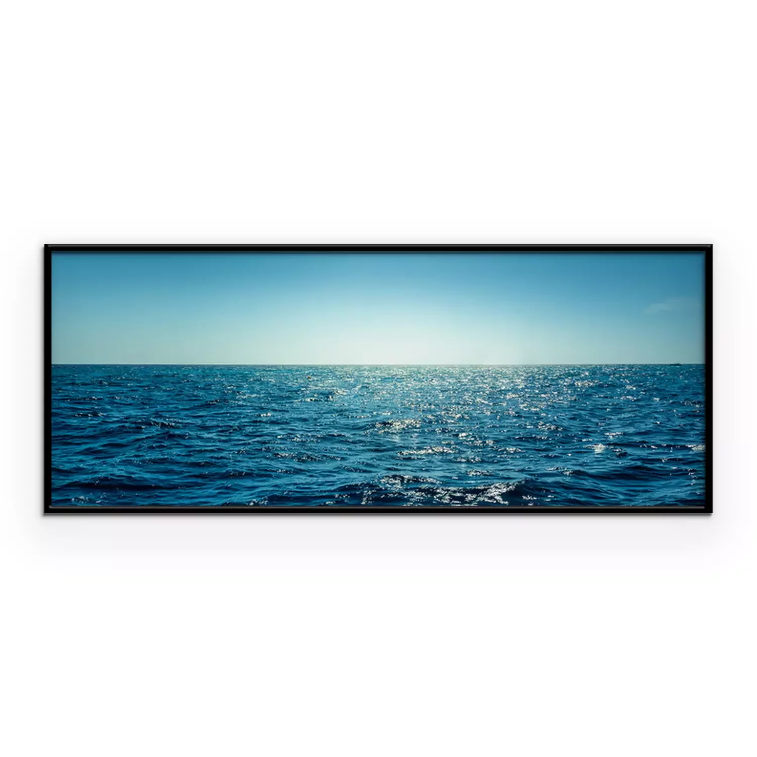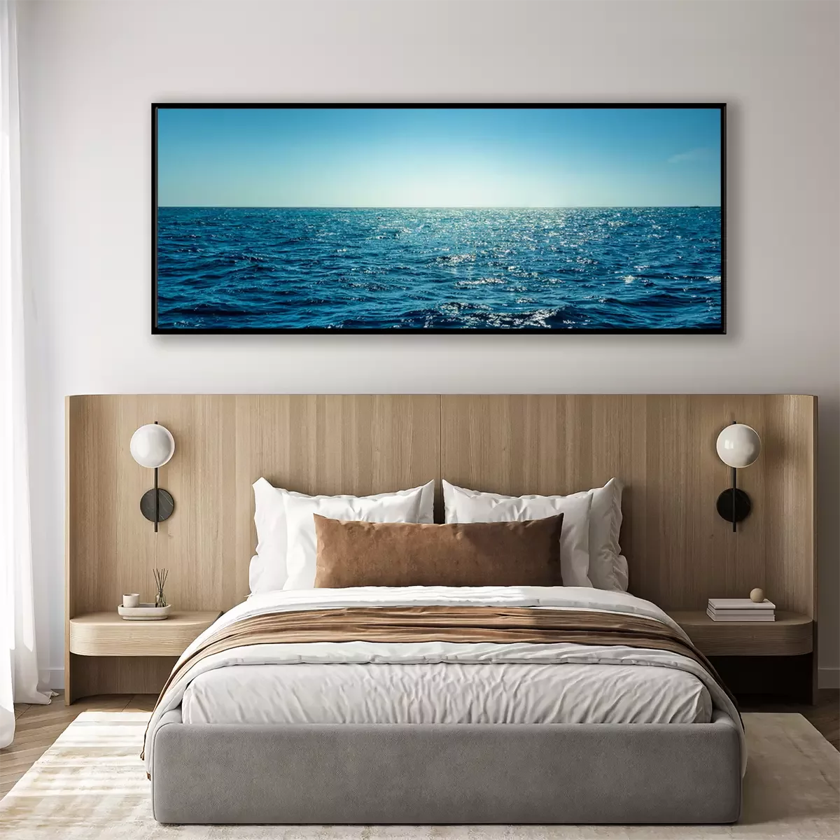 Poster : Panorama de l'océan bleu avec reflet du soleil, La vaste mer ouverte avec ciel dégagé, Ondulation et Mer calme avec une belle lumière du soleil