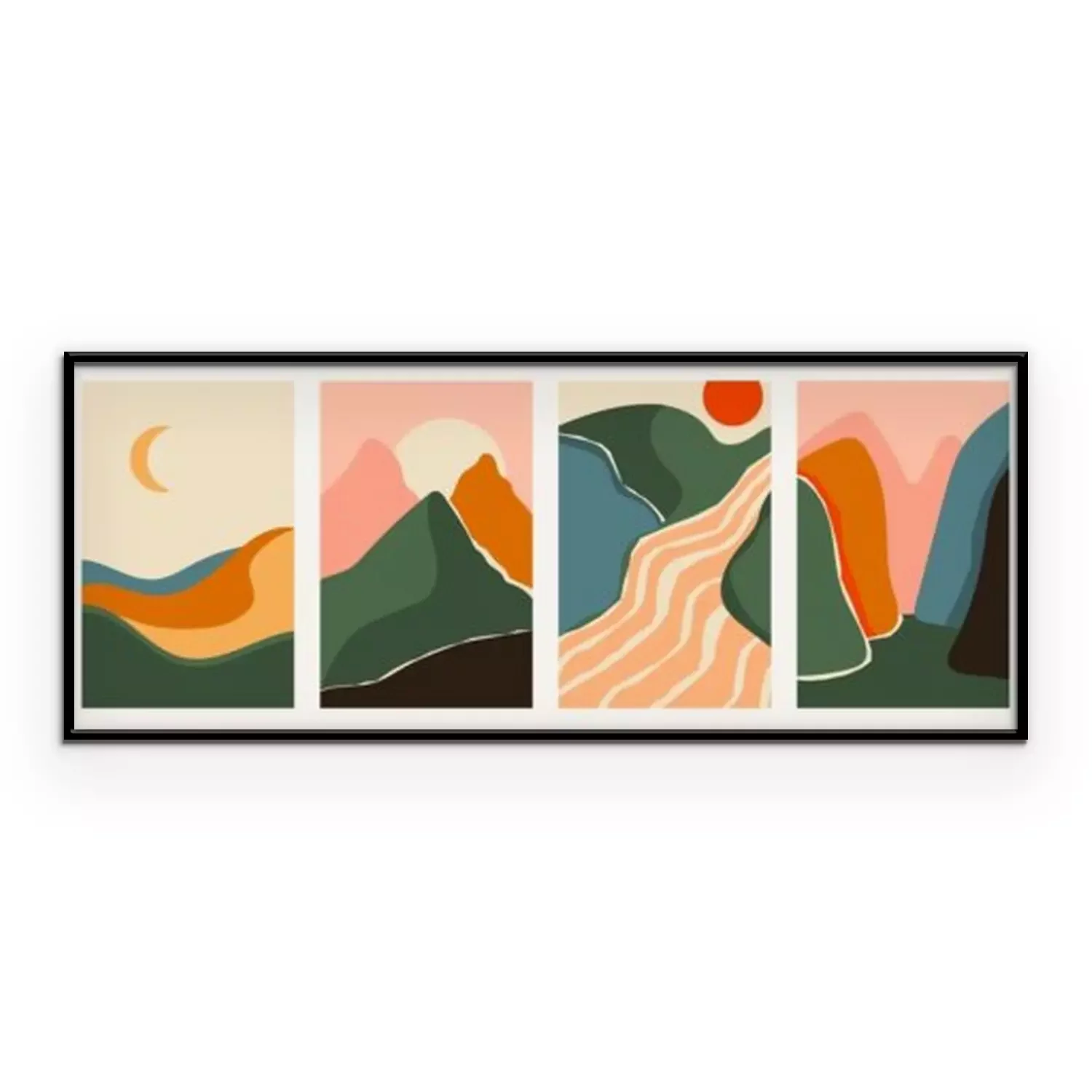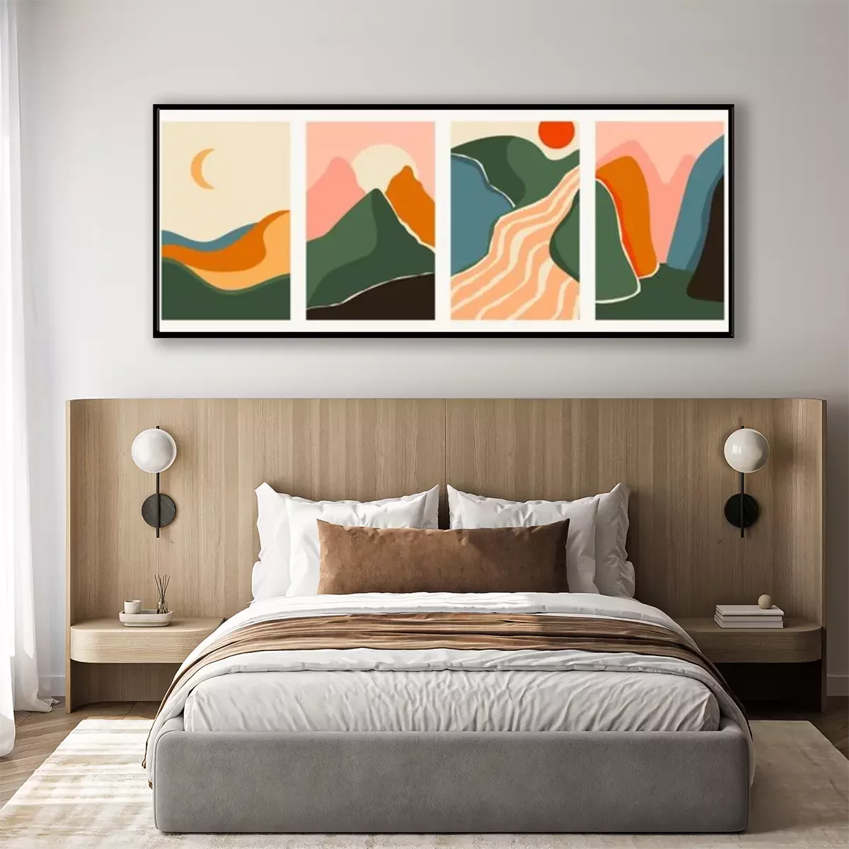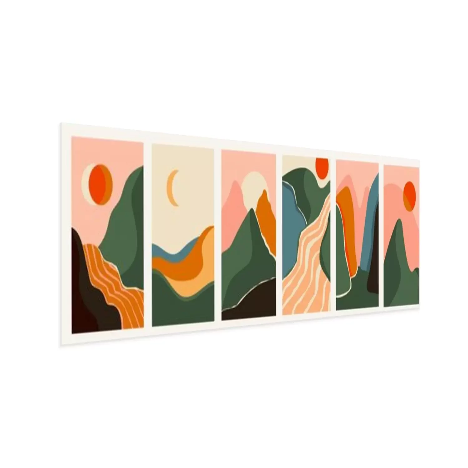 Mountain view. Mountains, hills, clouds, sun. Paper cut style. Flat abstract design. Scandinavian style illustration. Stamp texture. Hand drawn trendy vector seamless pattern