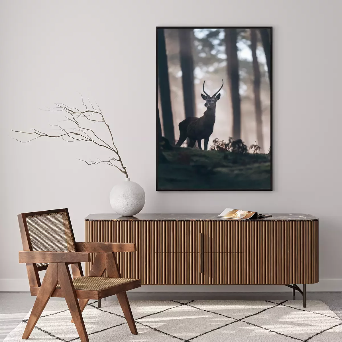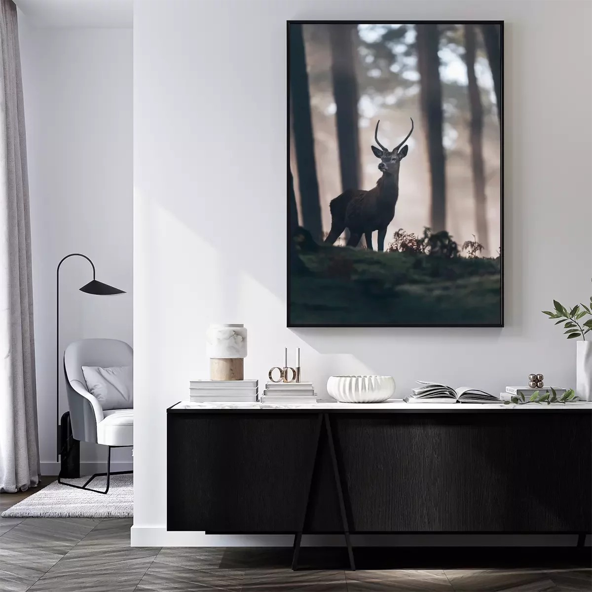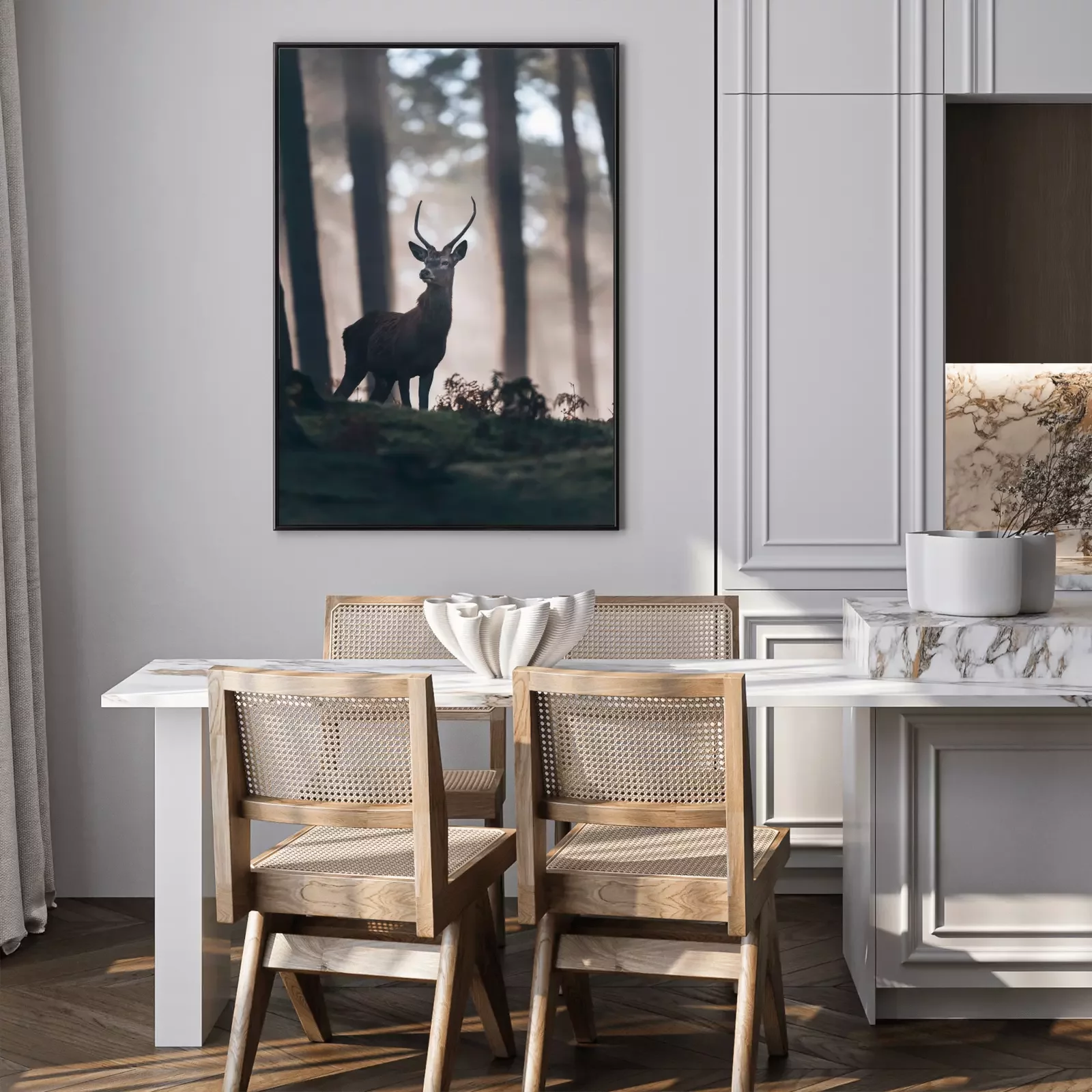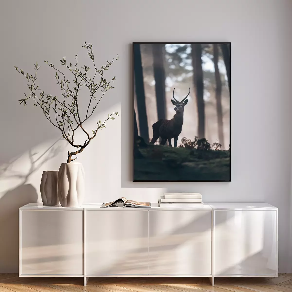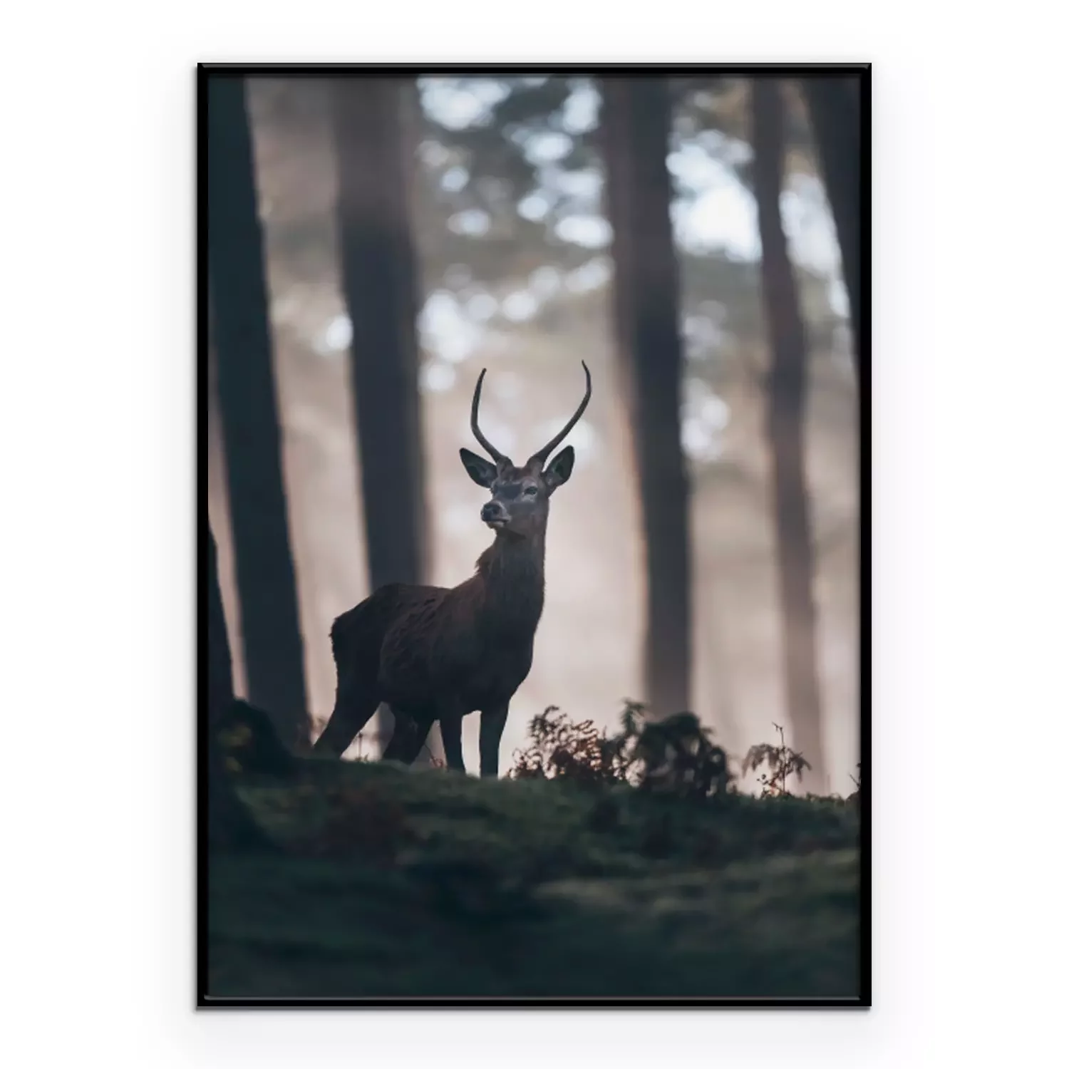Poster : Paysage brumeux avec un cerf élaphe dans une forêt