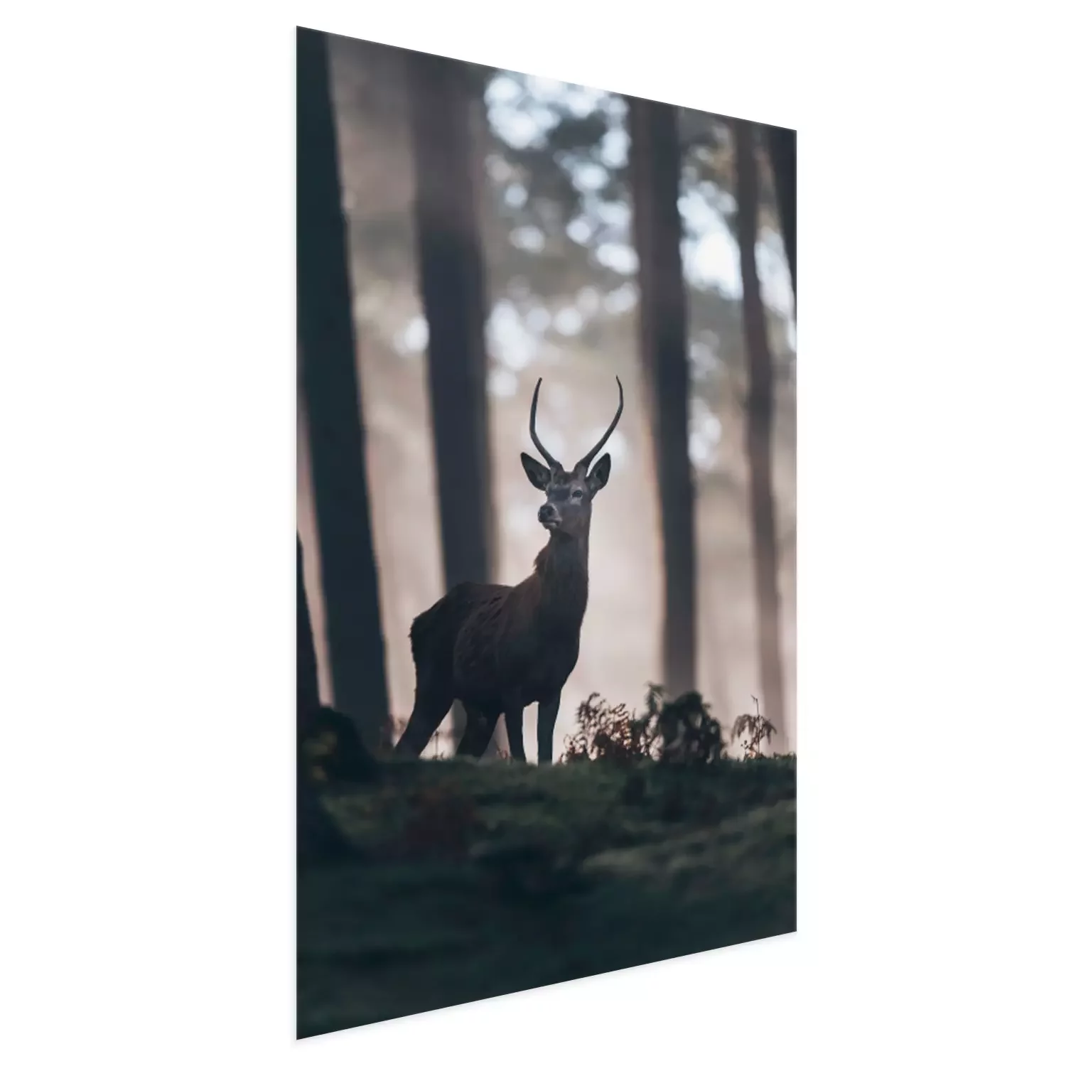 Poster  Paysage brumeux avec un cerf élaphe dans une forêt