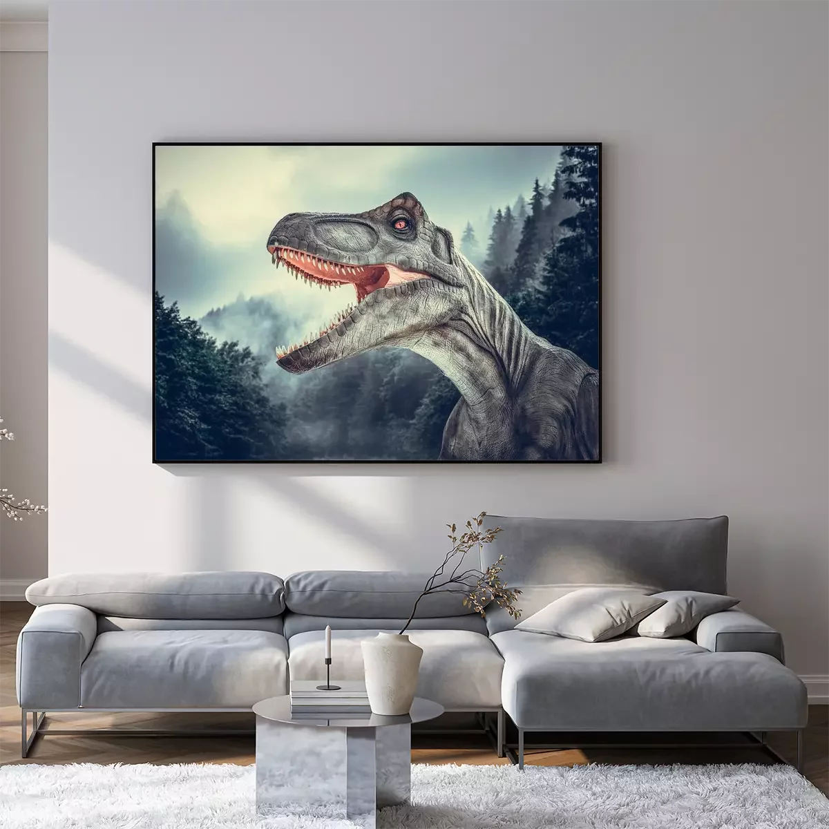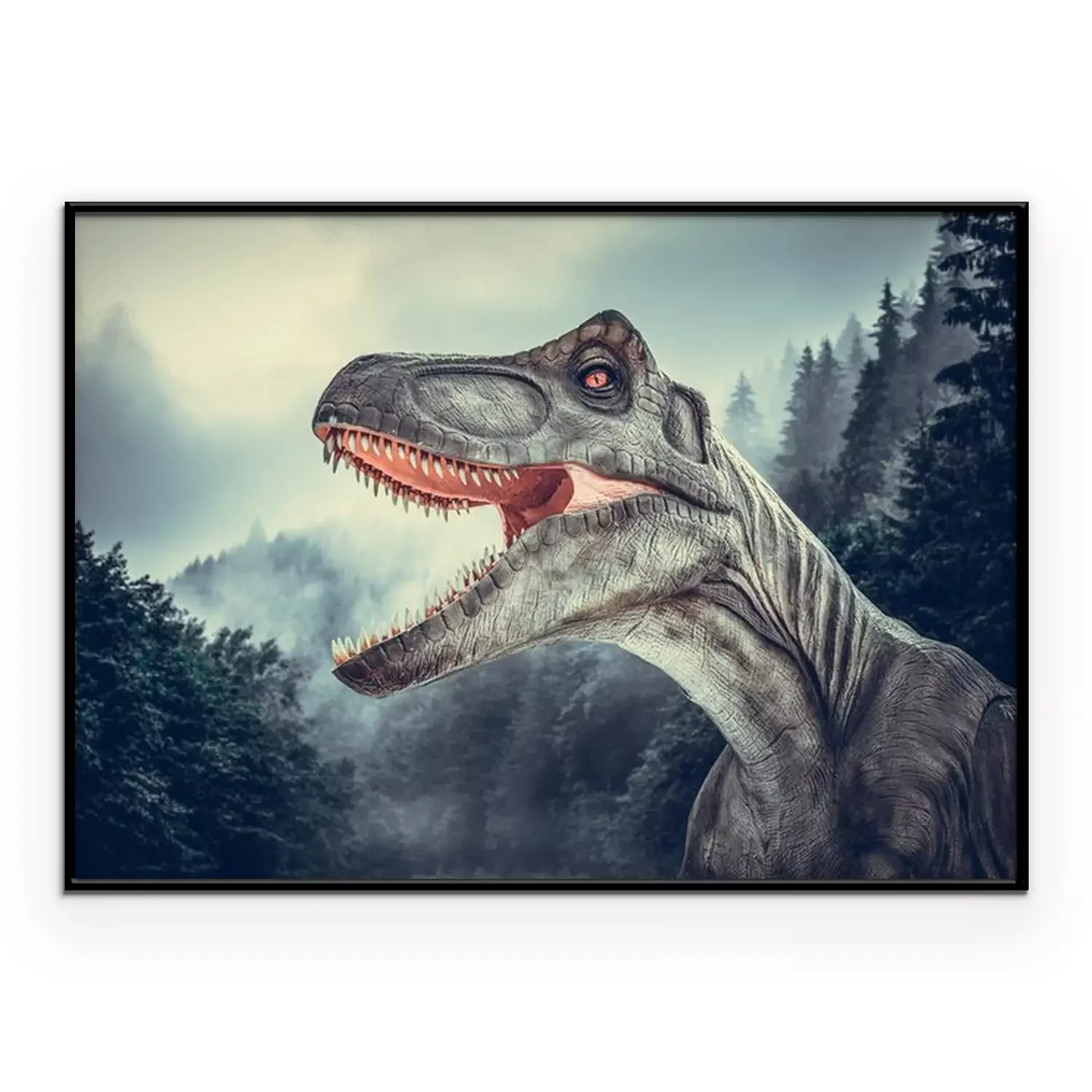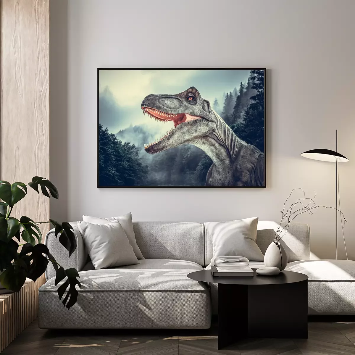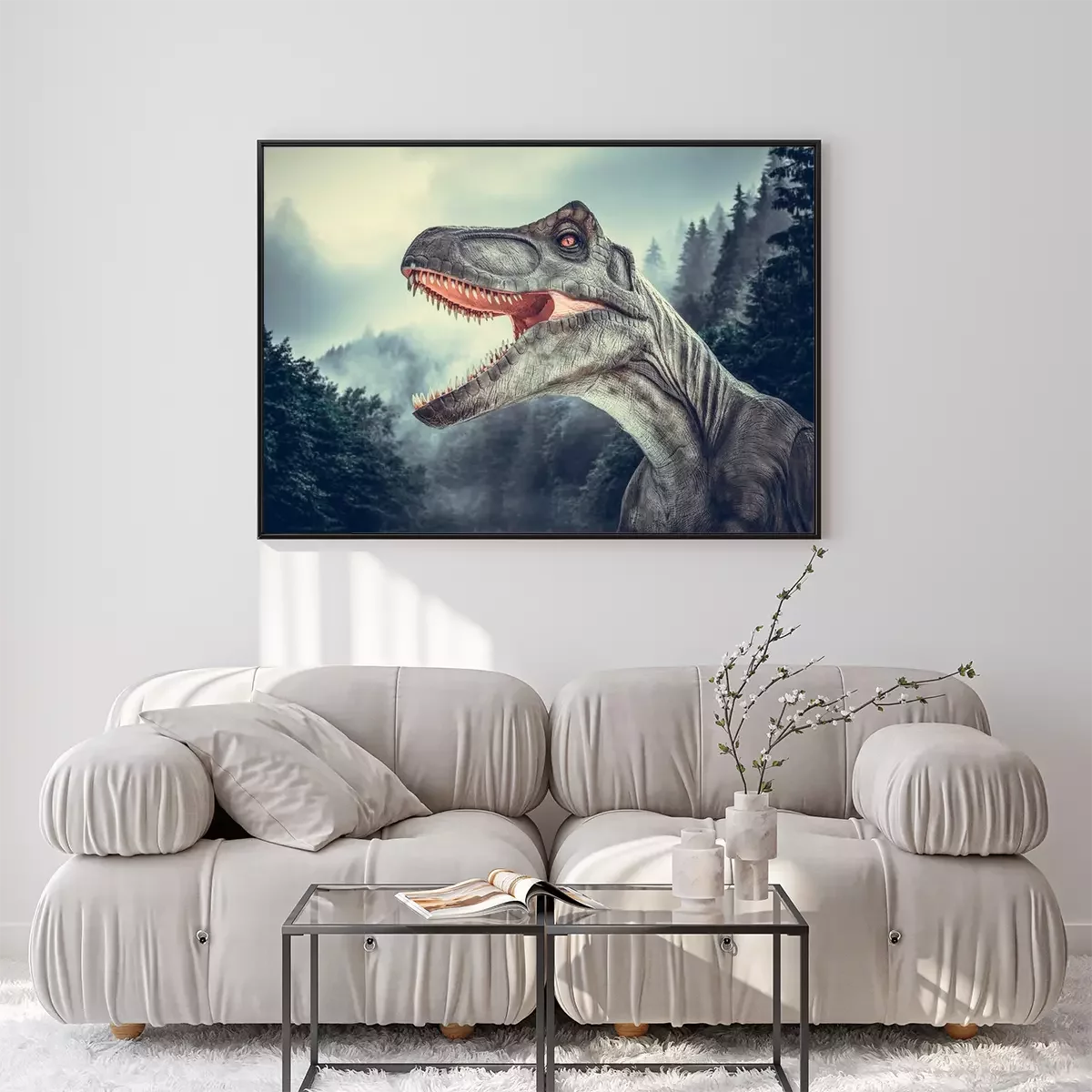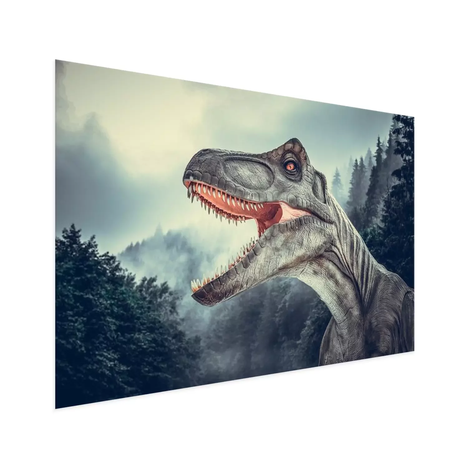 Poster : Paysage forestier avec de la brume et un dinosaure