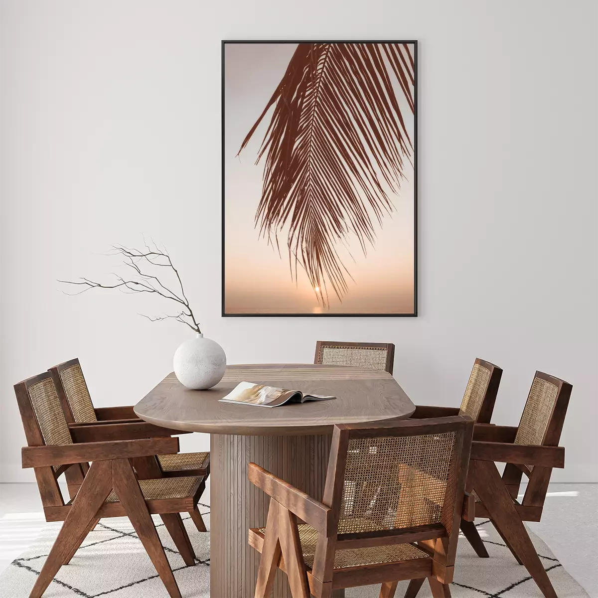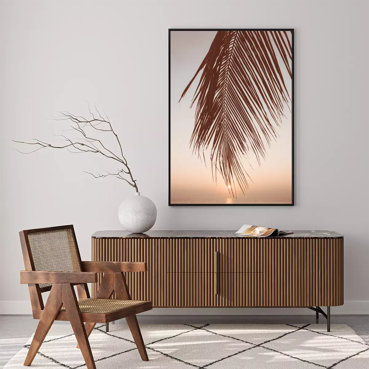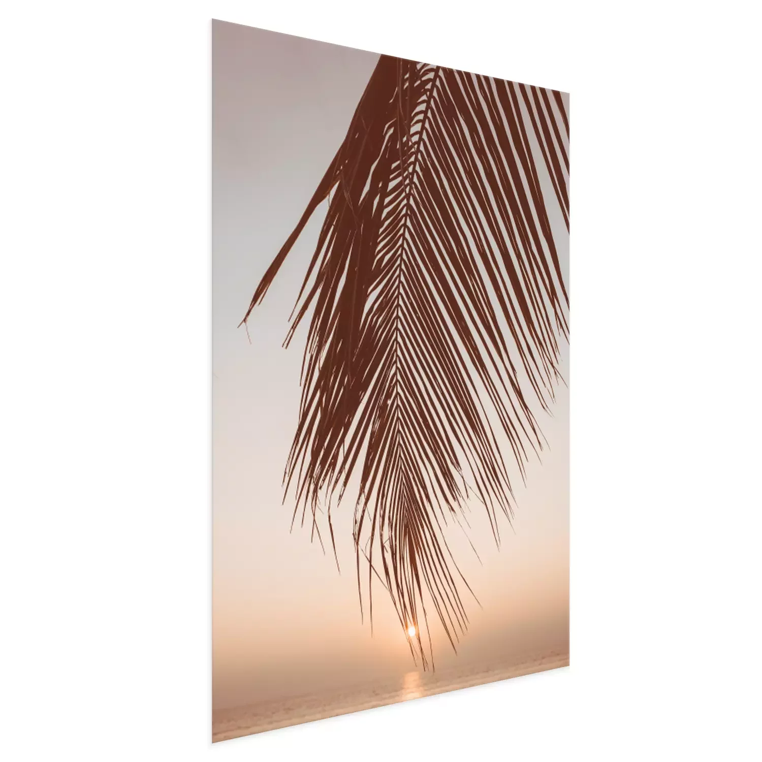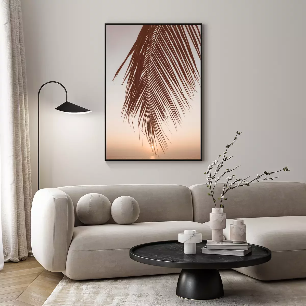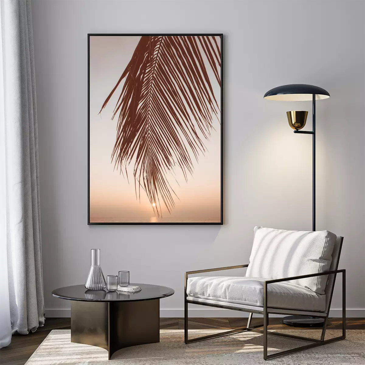 Paysage marin au coucher du soleil avec une feuille de palmier