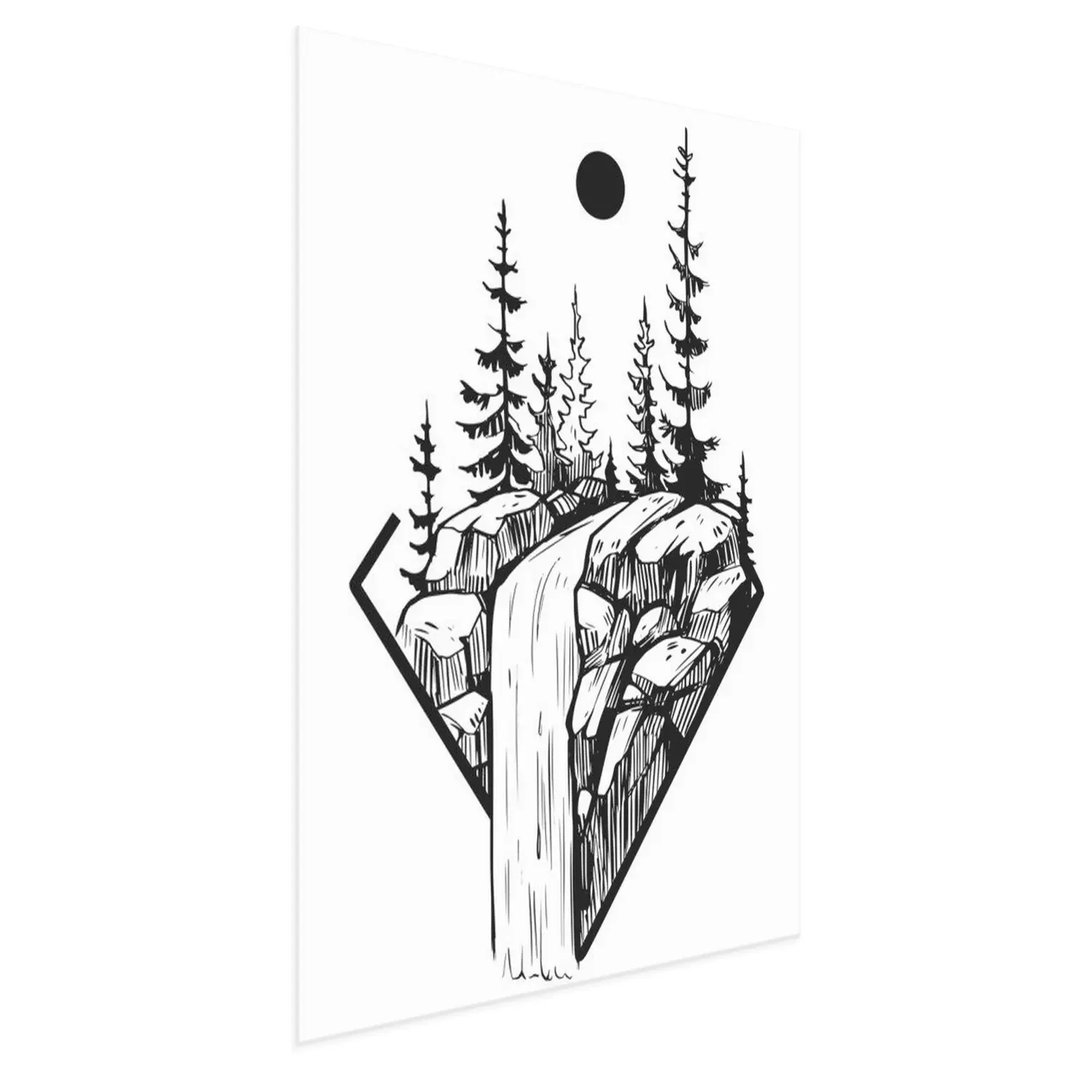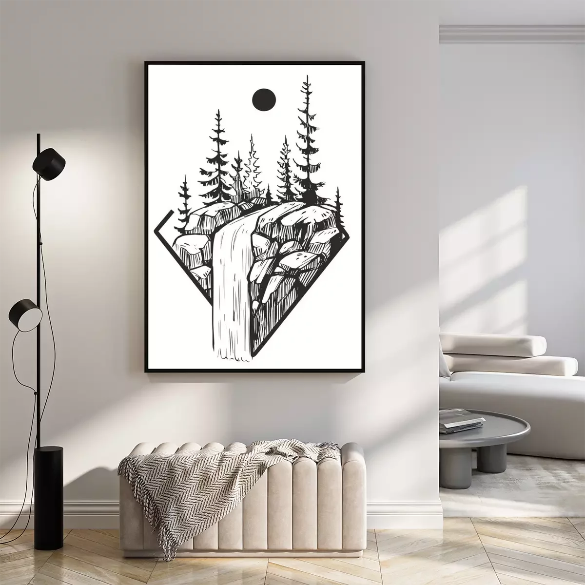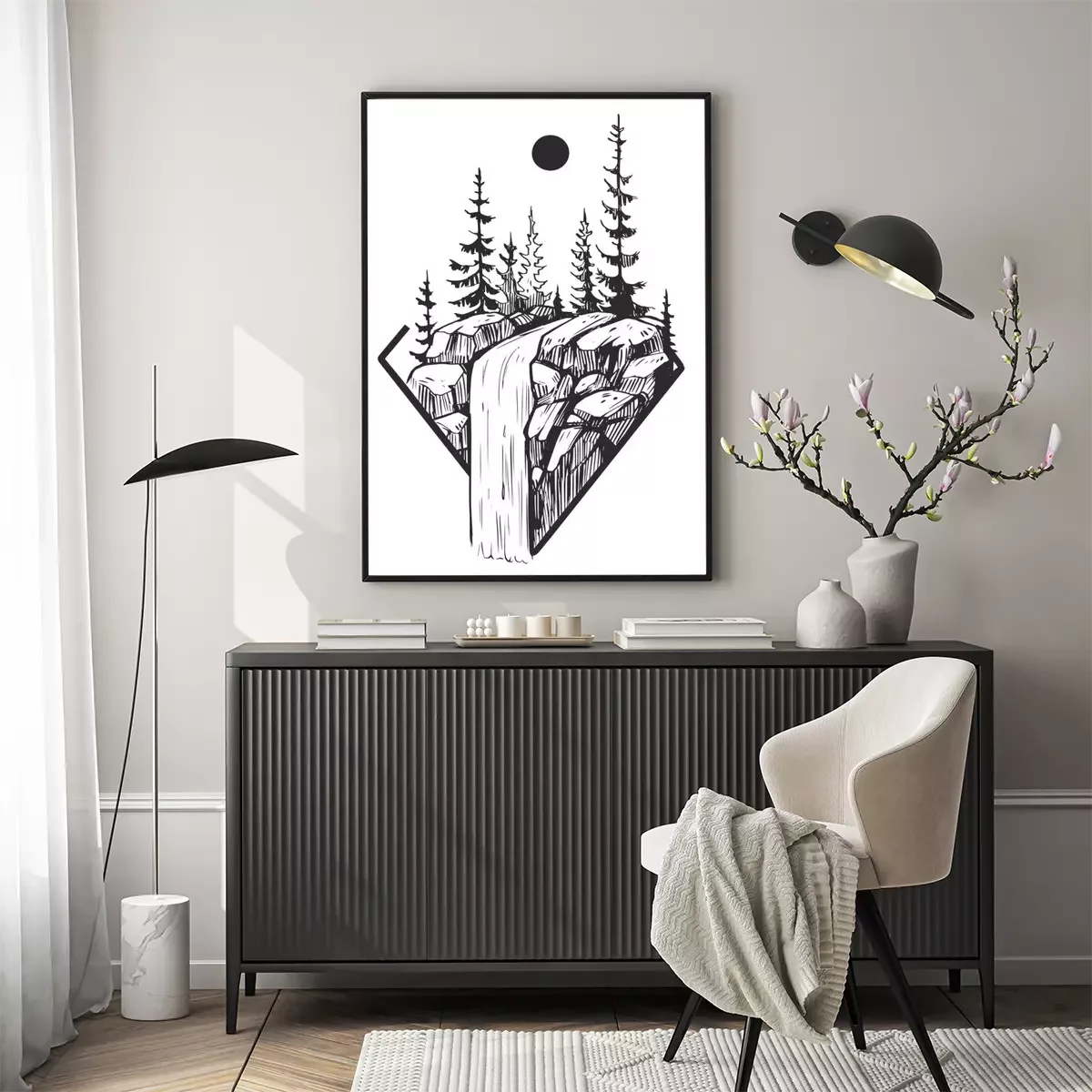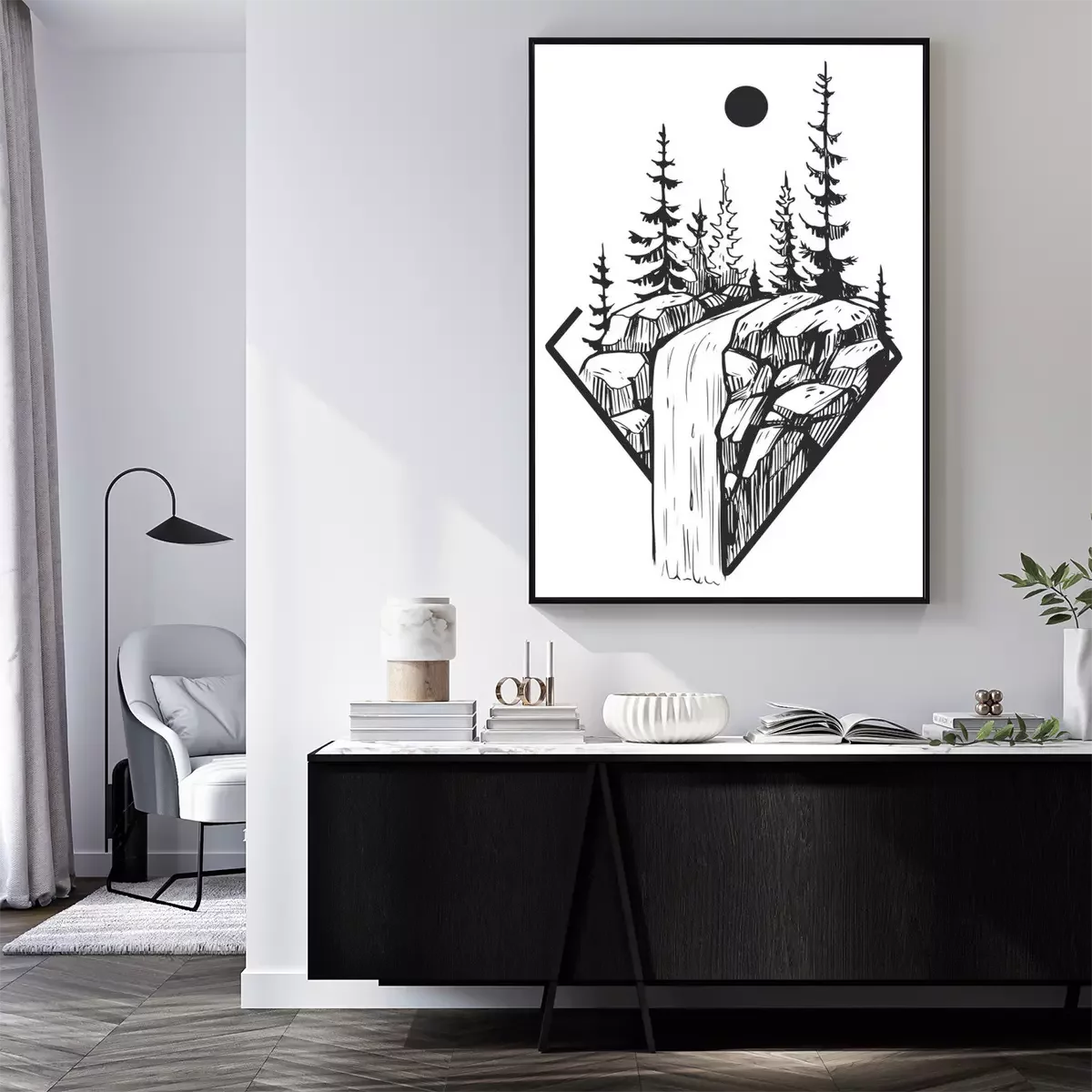 Dessin noir et blanc d'un paysage de montagne avec une cascade