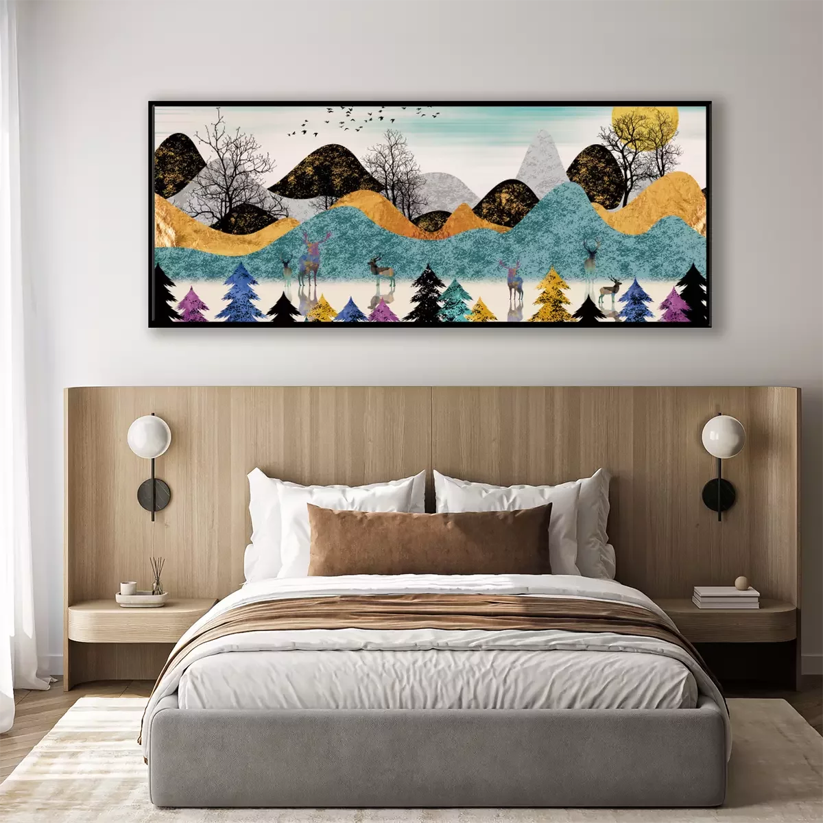 3d modern art mural wallpaper with dark blue Jungle , forest background . golden deer, christmas tree , mountains , clouds with white birds . Suitable for use as a frame on walls .