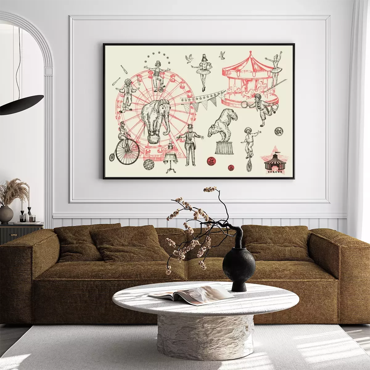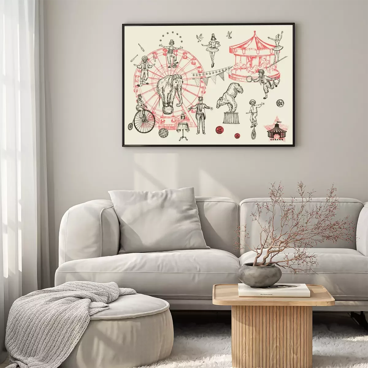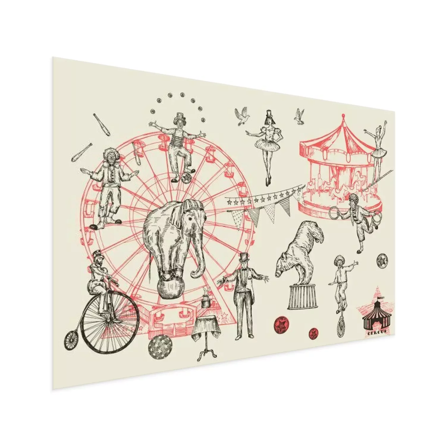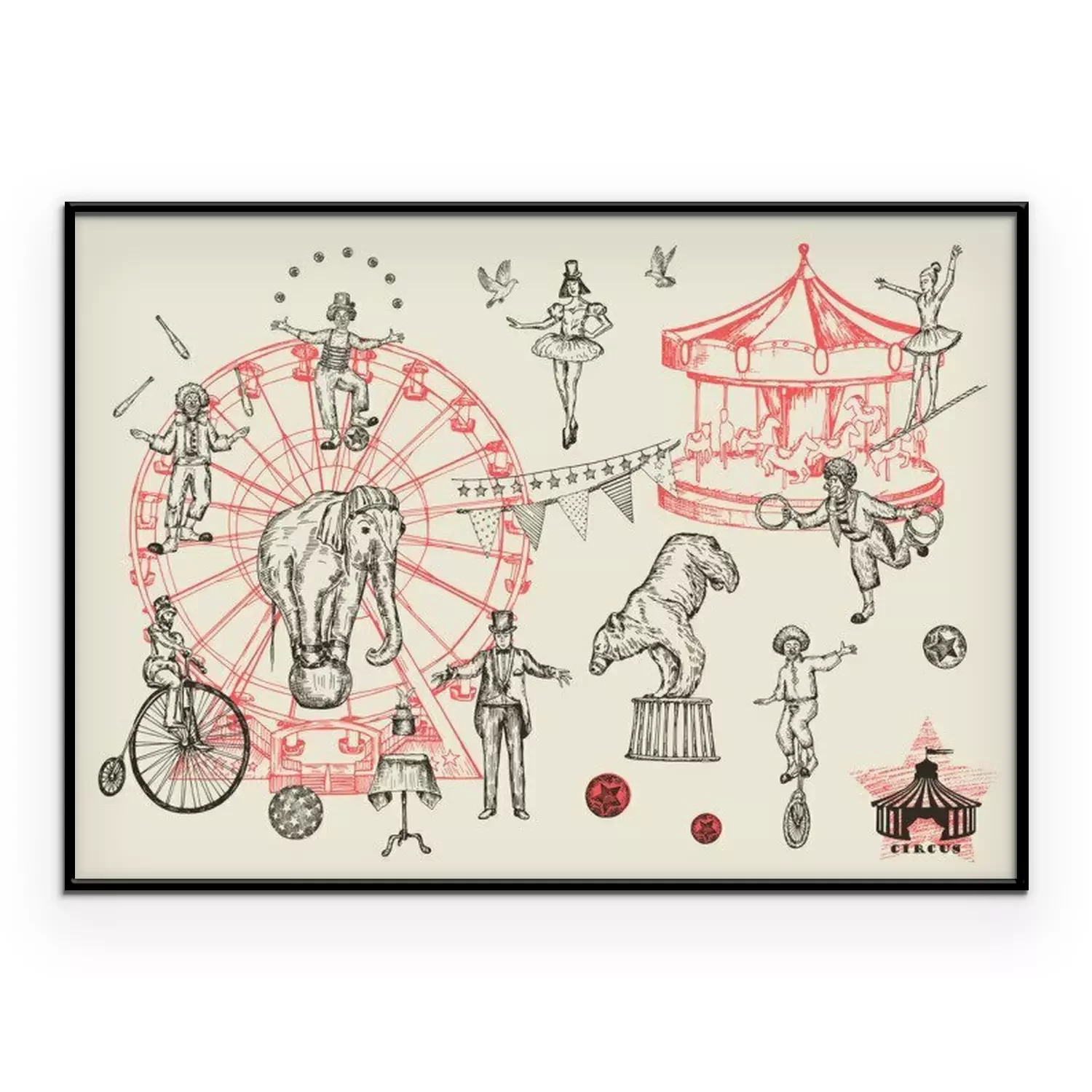 Poster  Performances de cirque rétro mis illustration vectorielle de croquis stile. Imitation dessinée à la main. Humain et animaux.