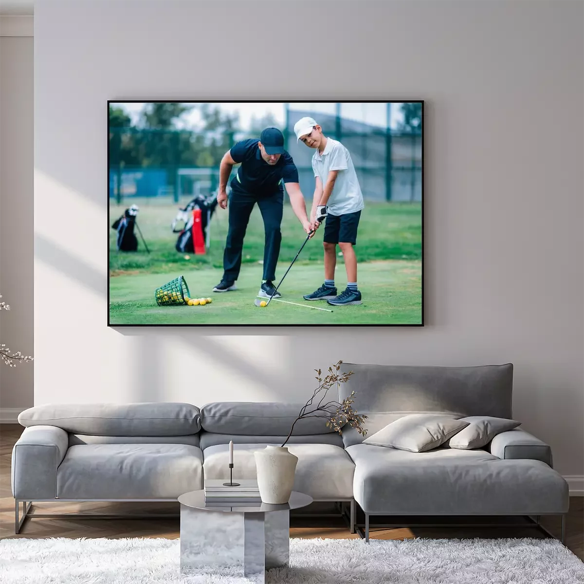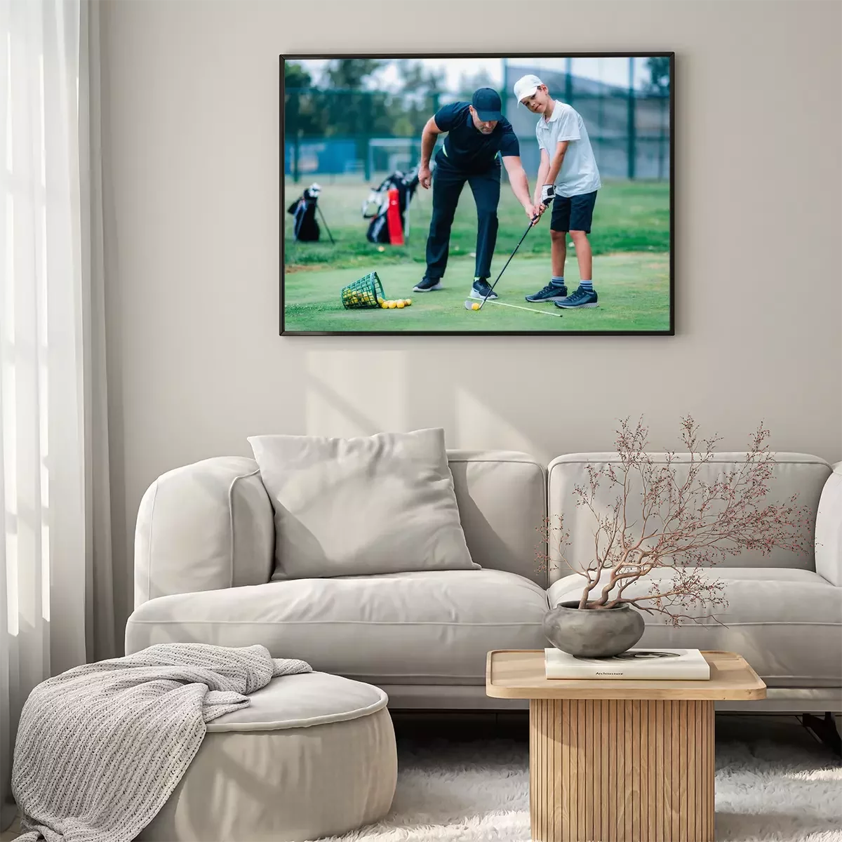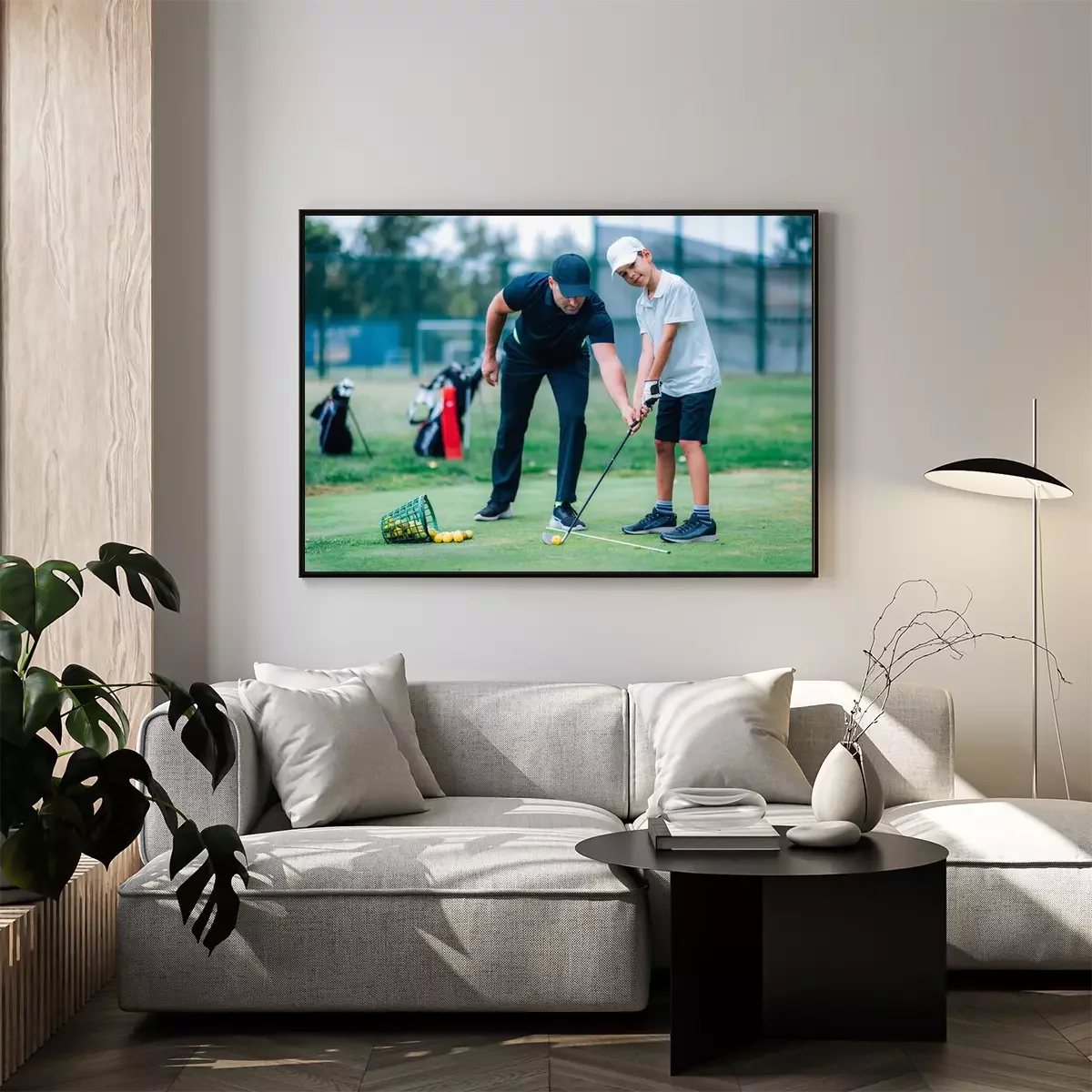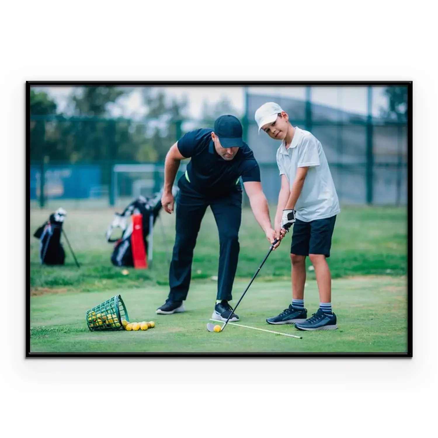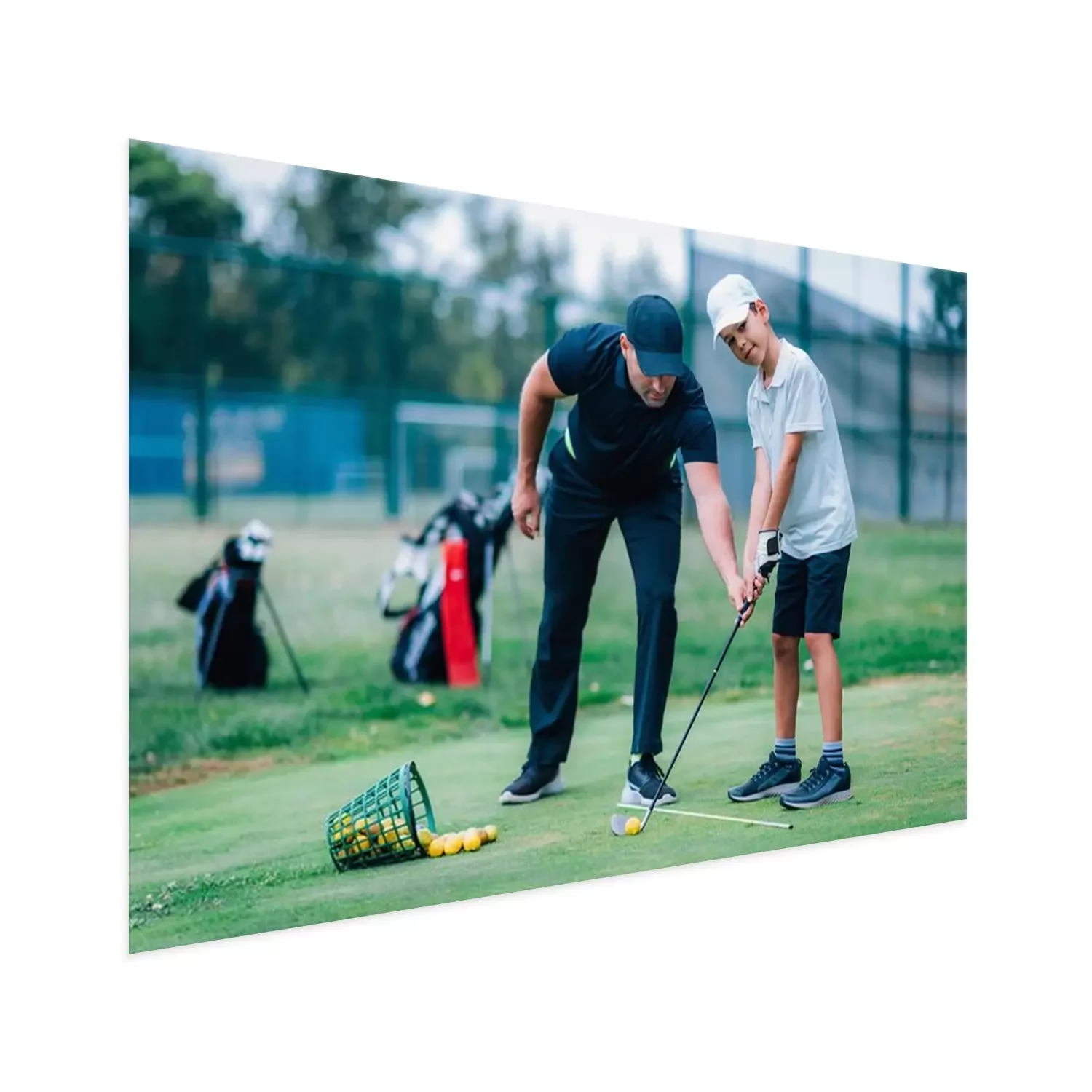 Poster  Personal golf lesson. Golf instructor with young boy on a golf driving range.
