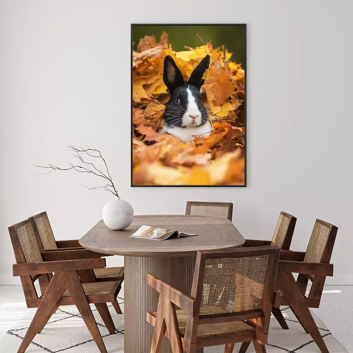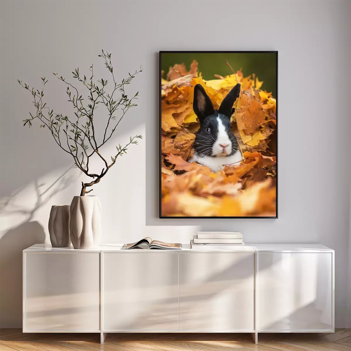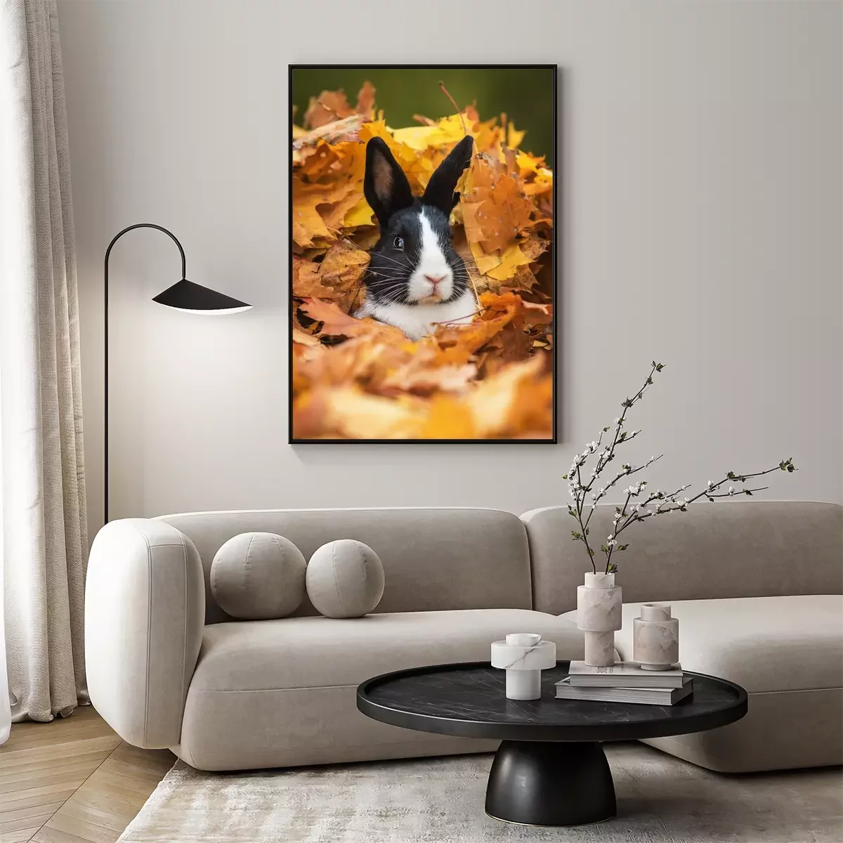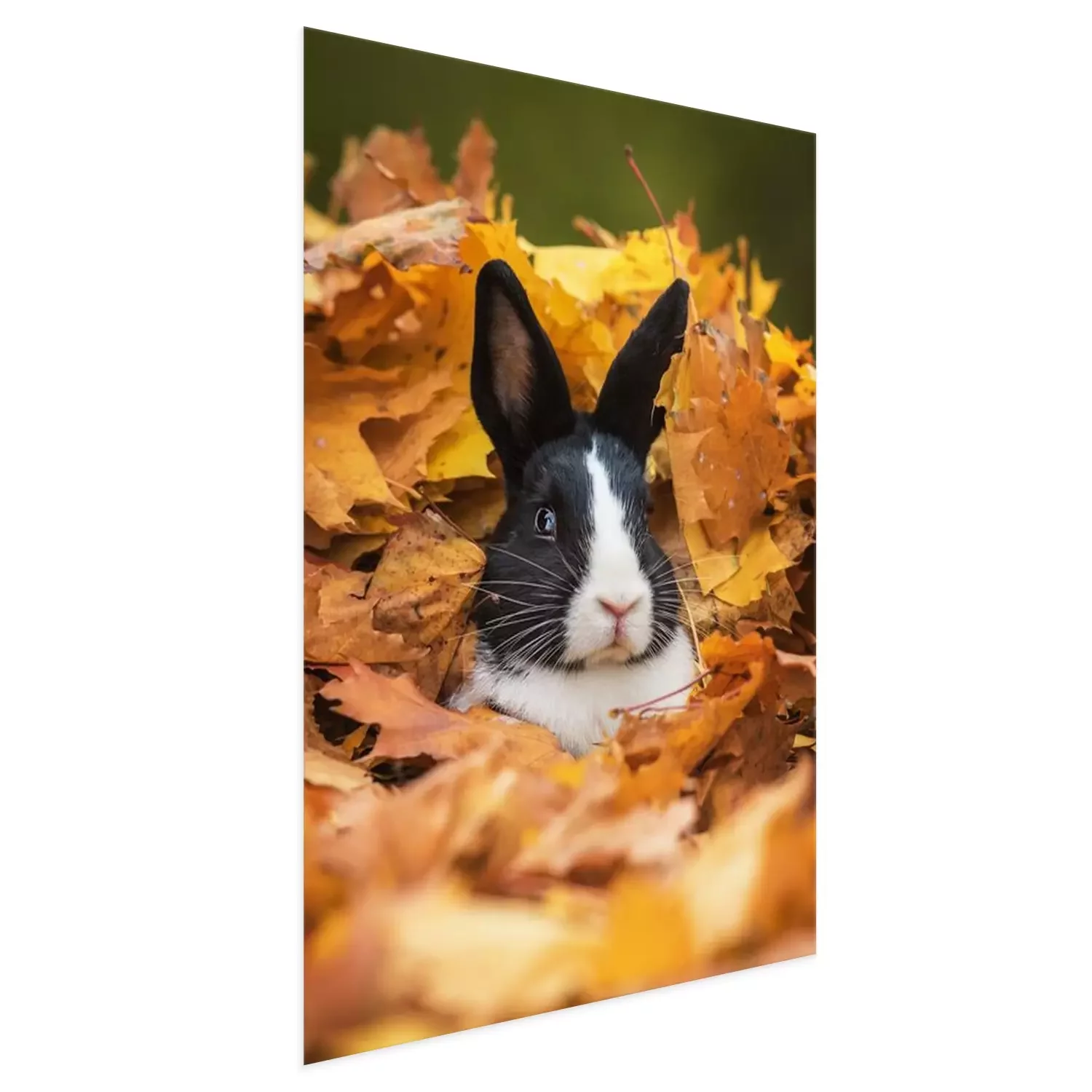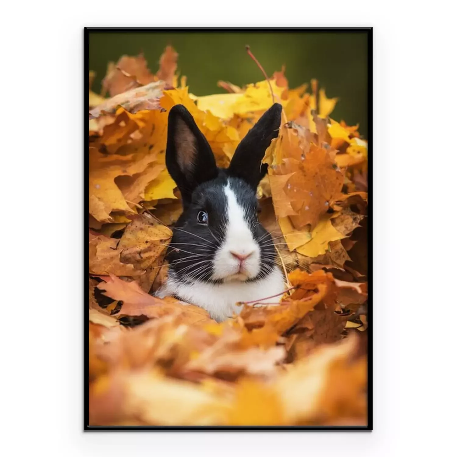 Poster  Petit lapin drôle assis dans un tas de feuilles en automne