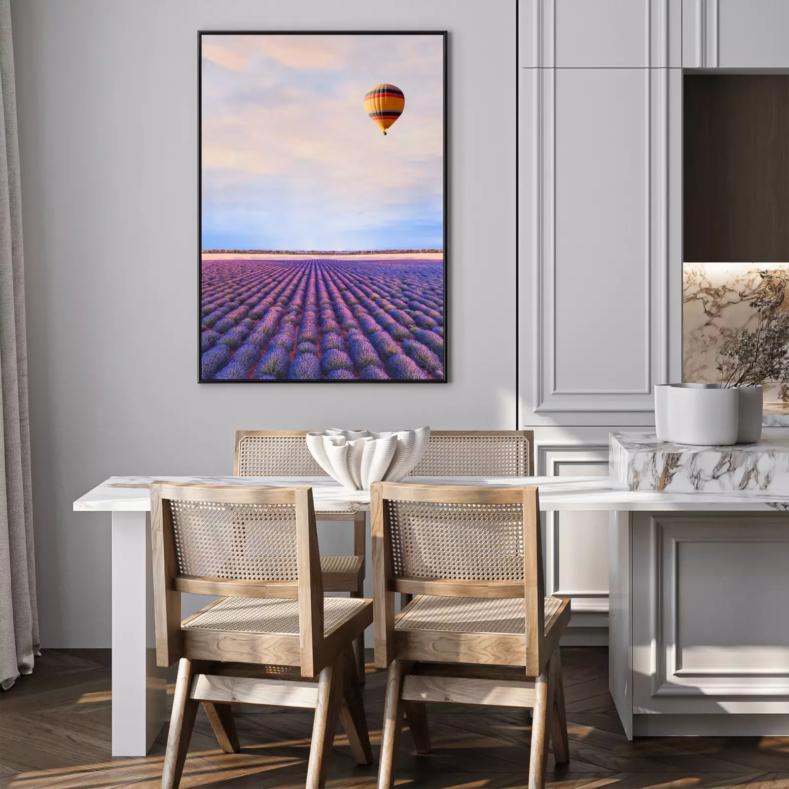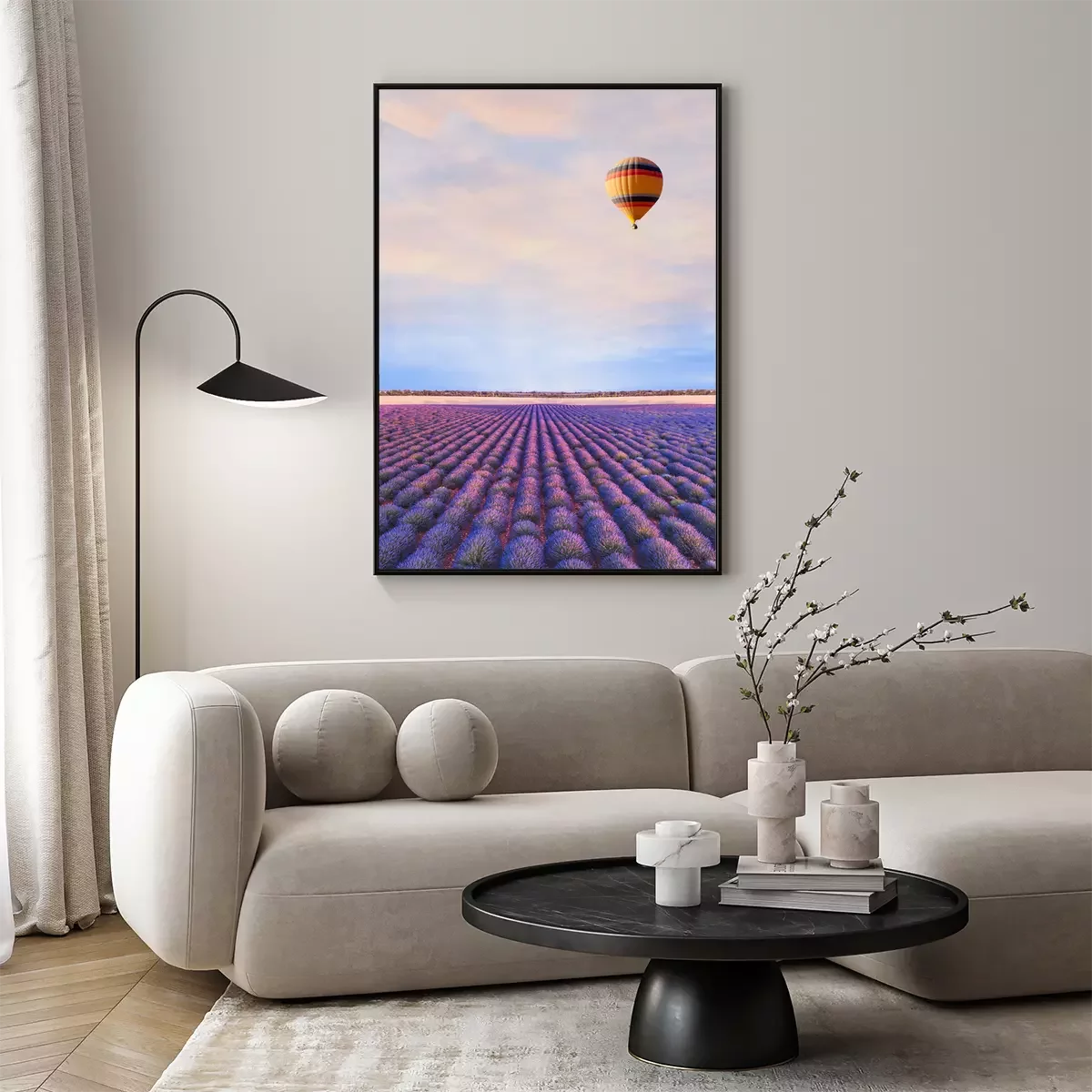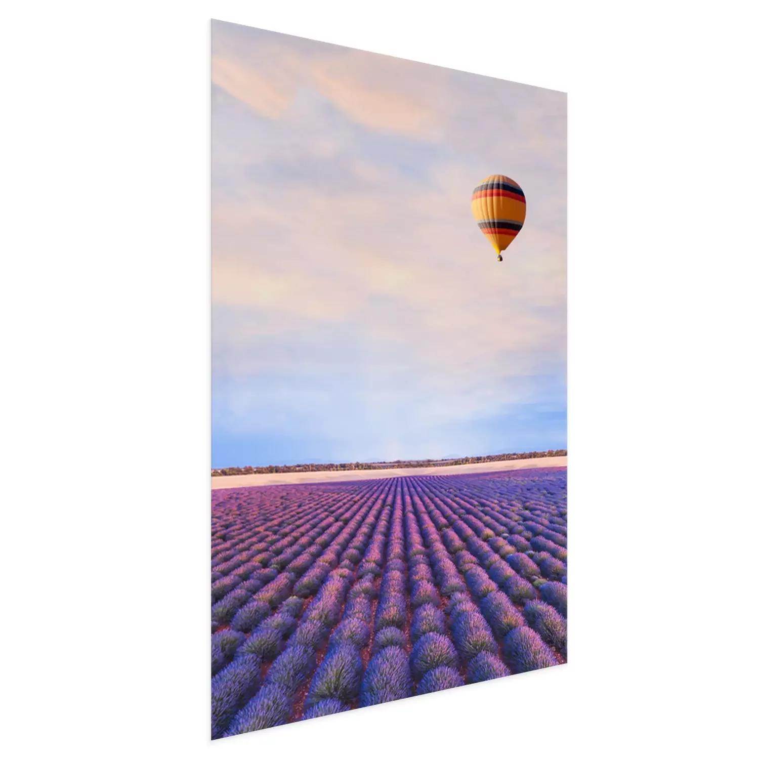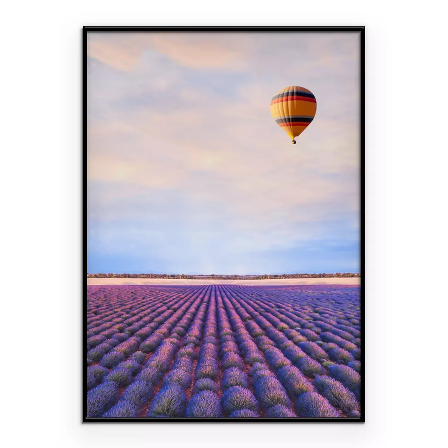Poster  Photographie avec une montgolfière au-dessus d'un champ de lavande