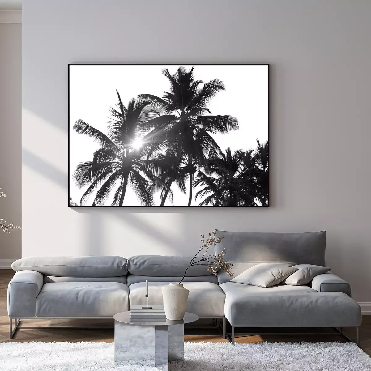 Poster : Photographie noir et blanc de palmiers et de soleil