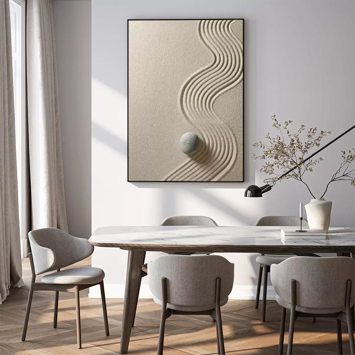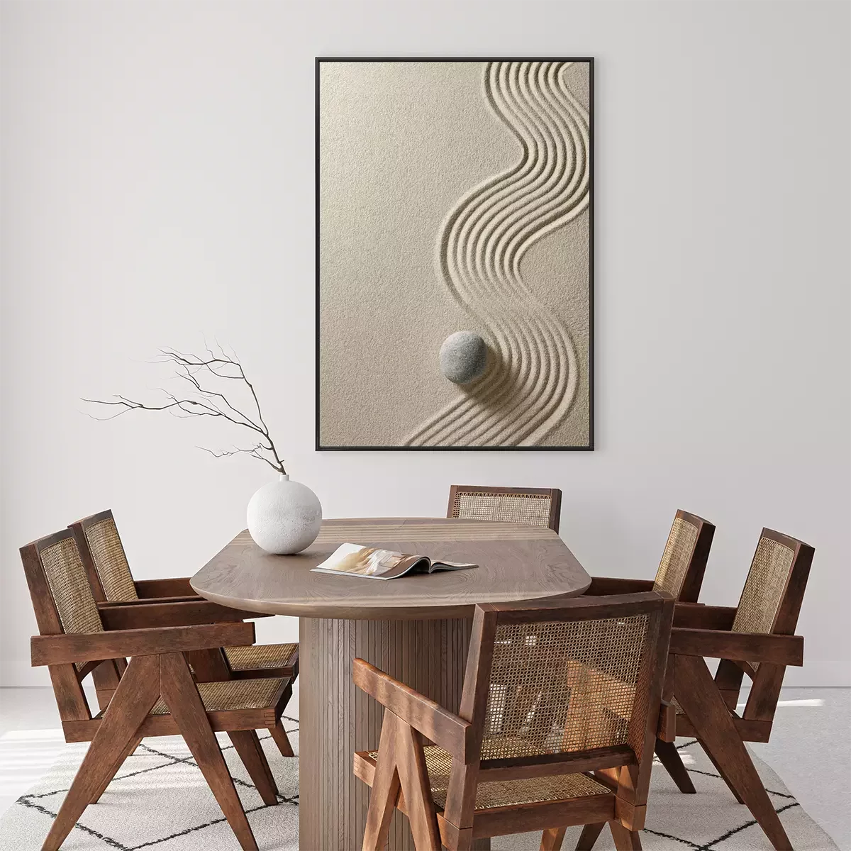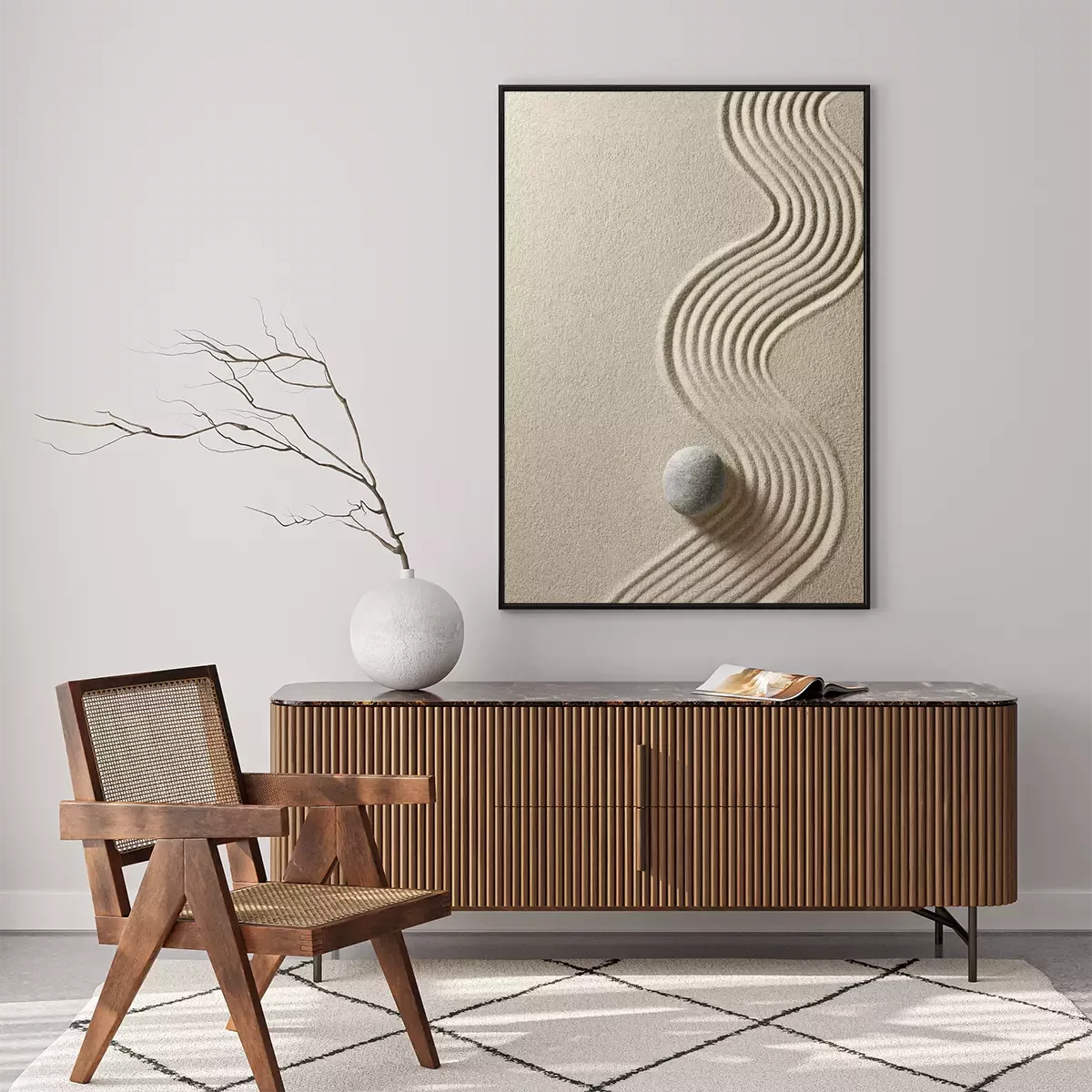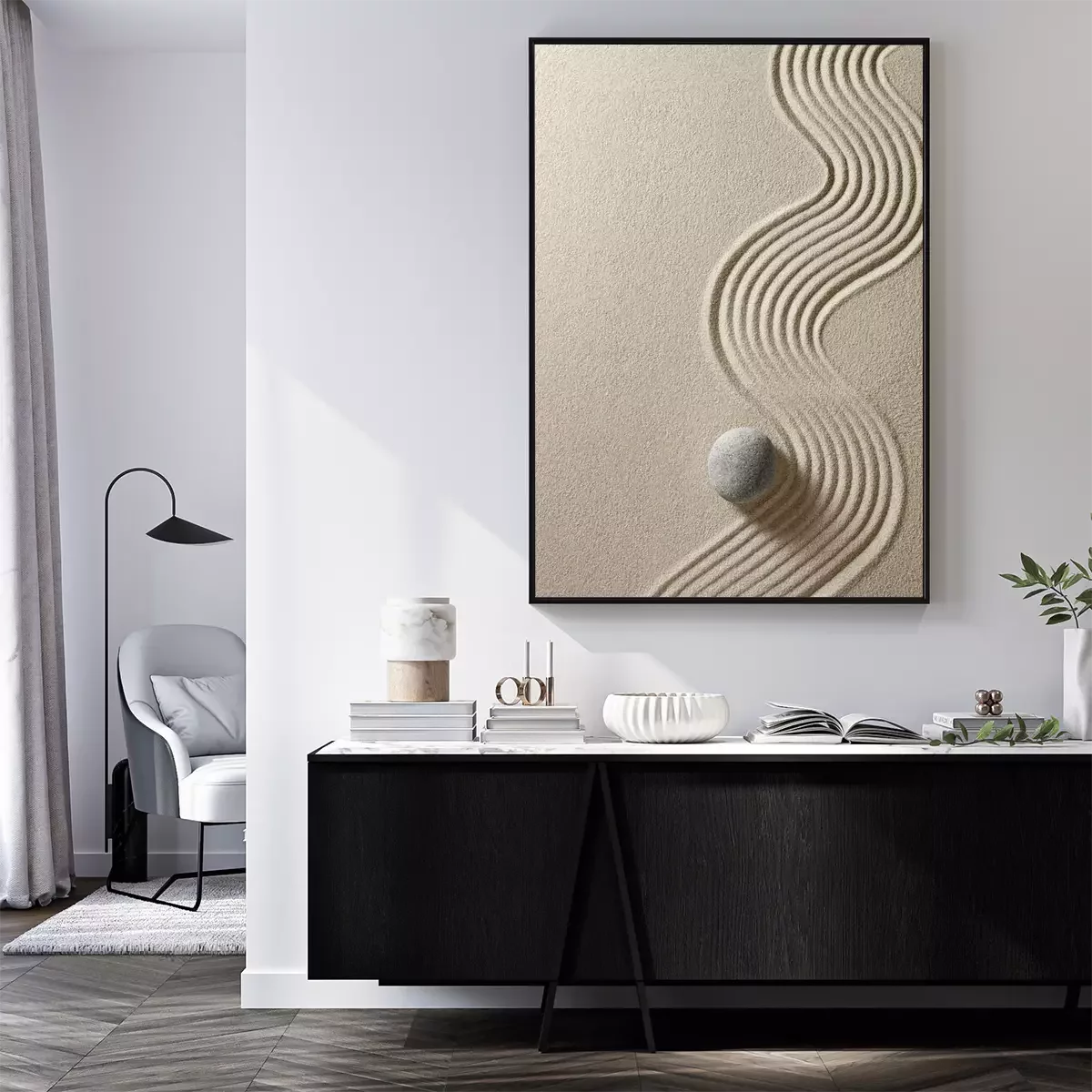 Pierres zen et lignes dans le sable