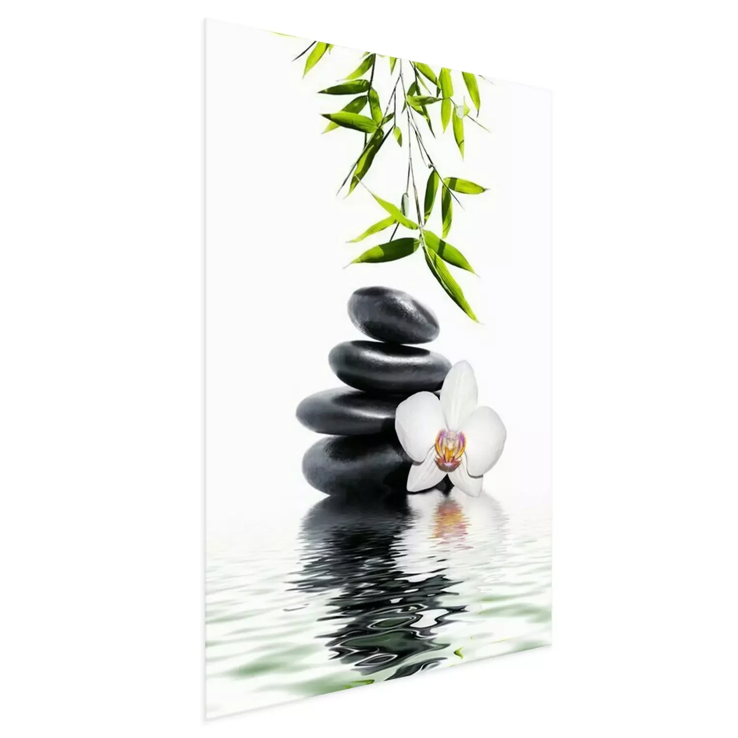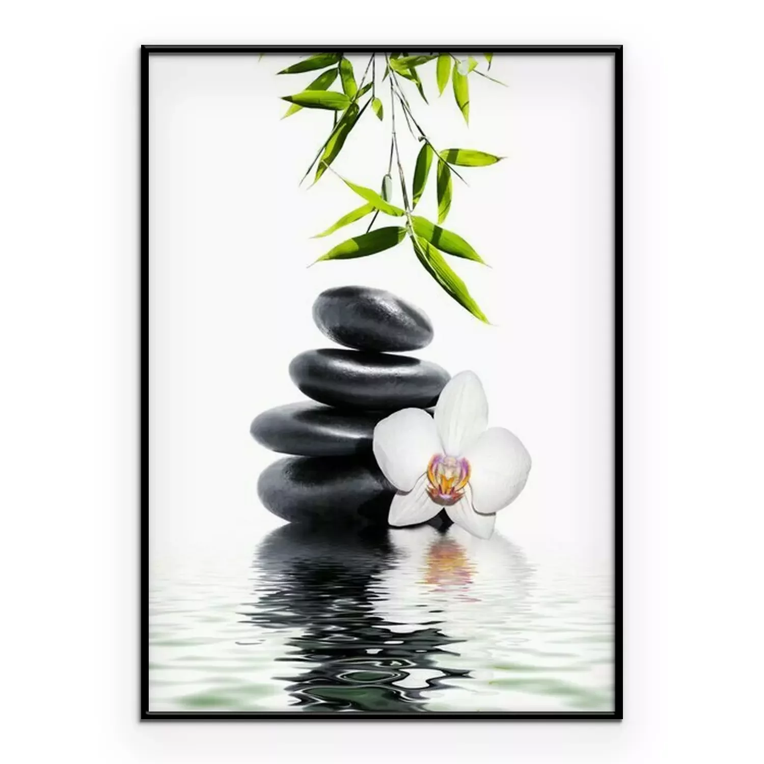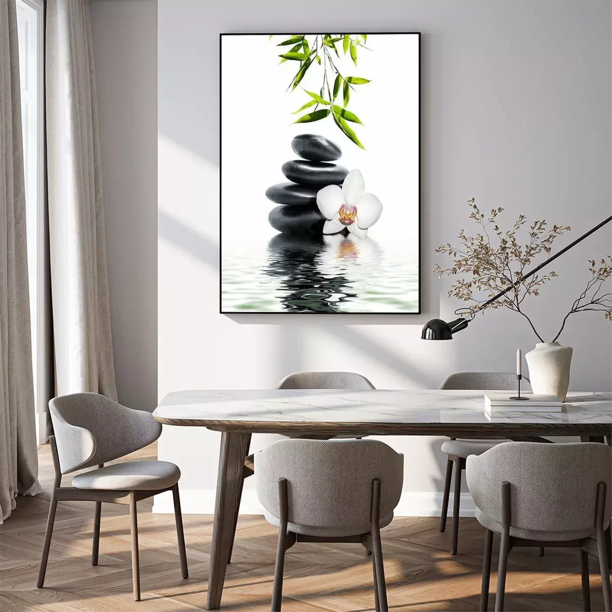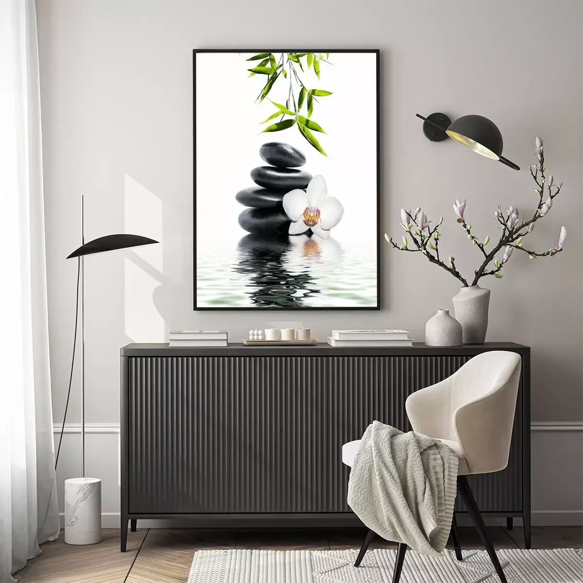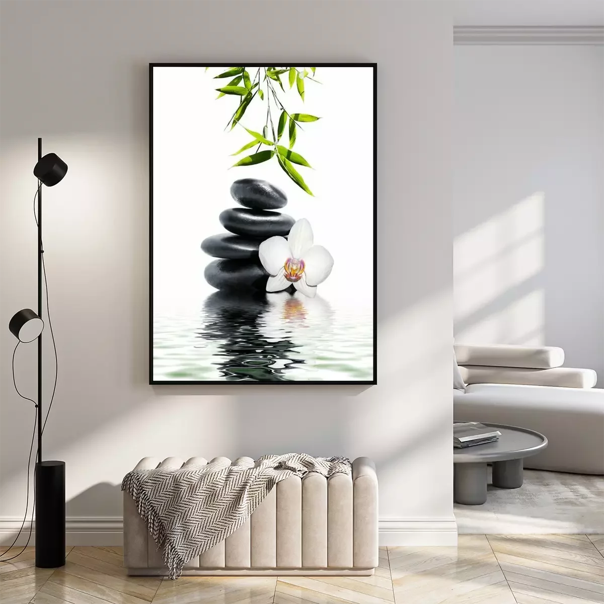 Pierres zen avec frangipanier et bambou se reflétant dans l'eau