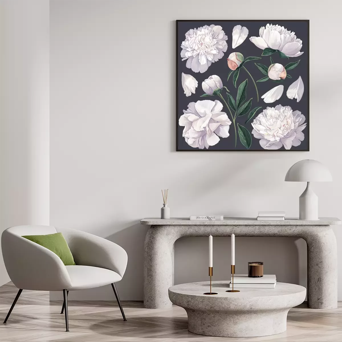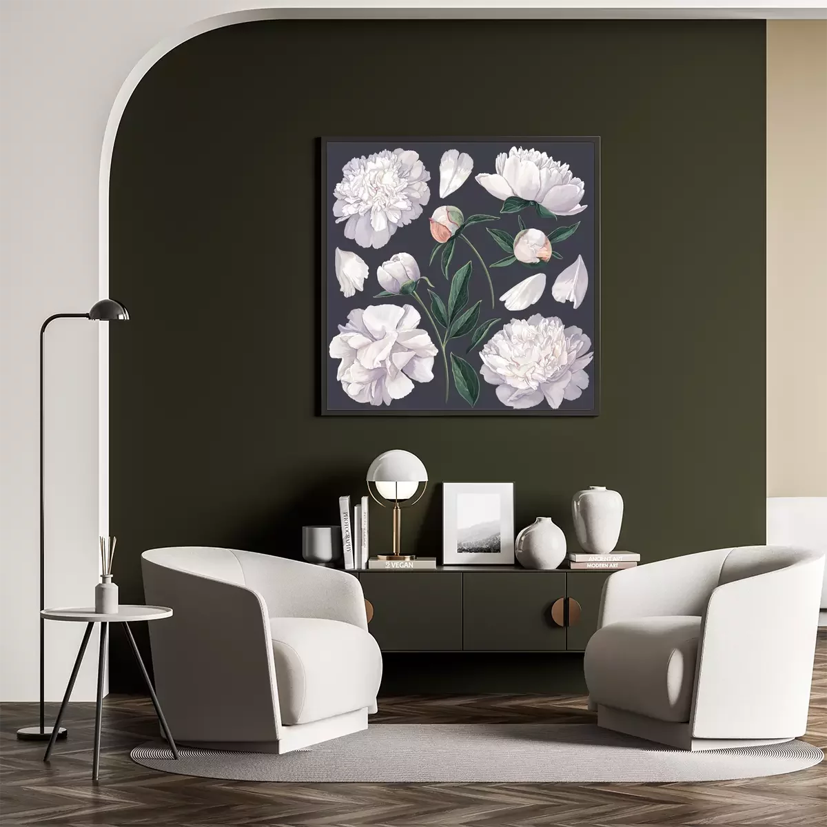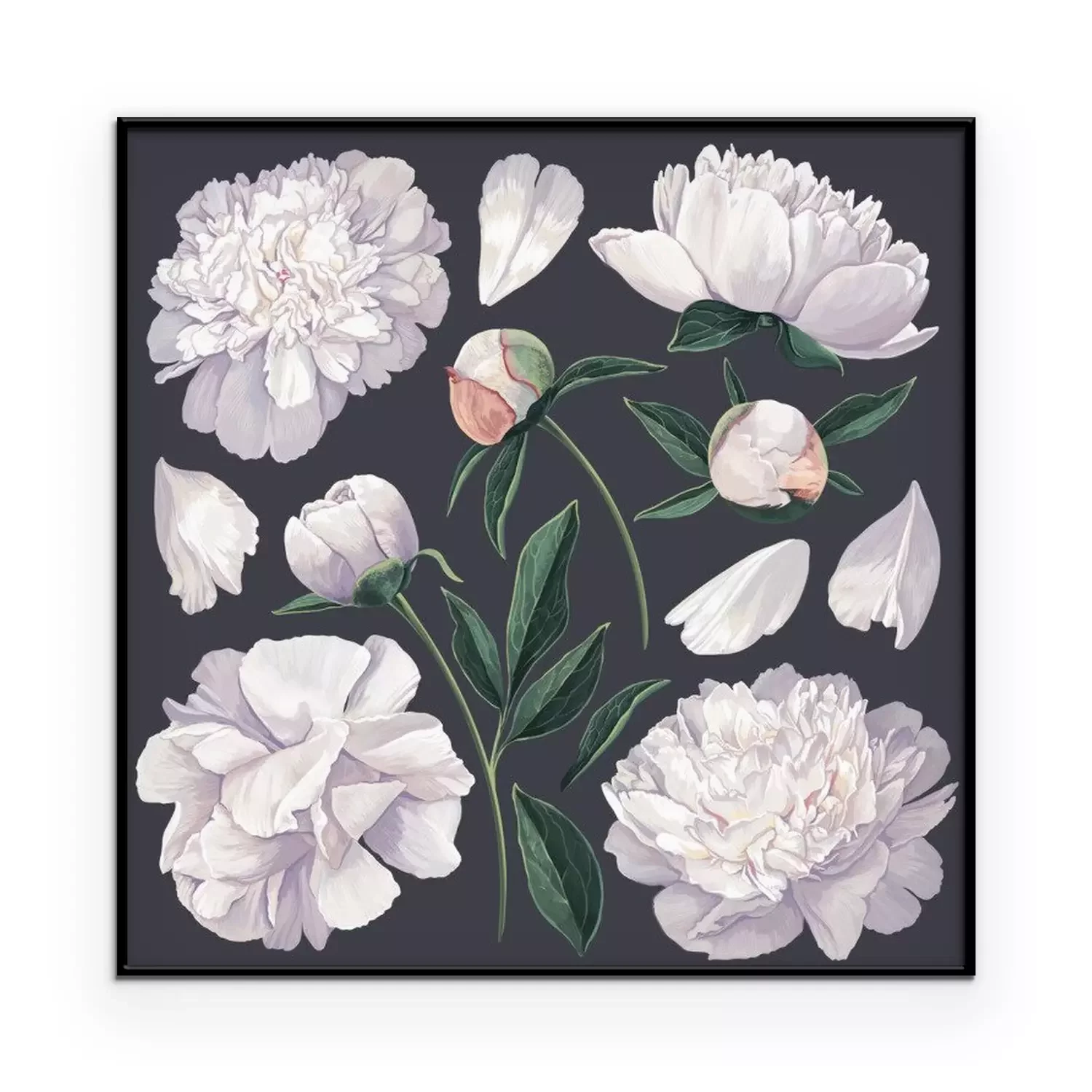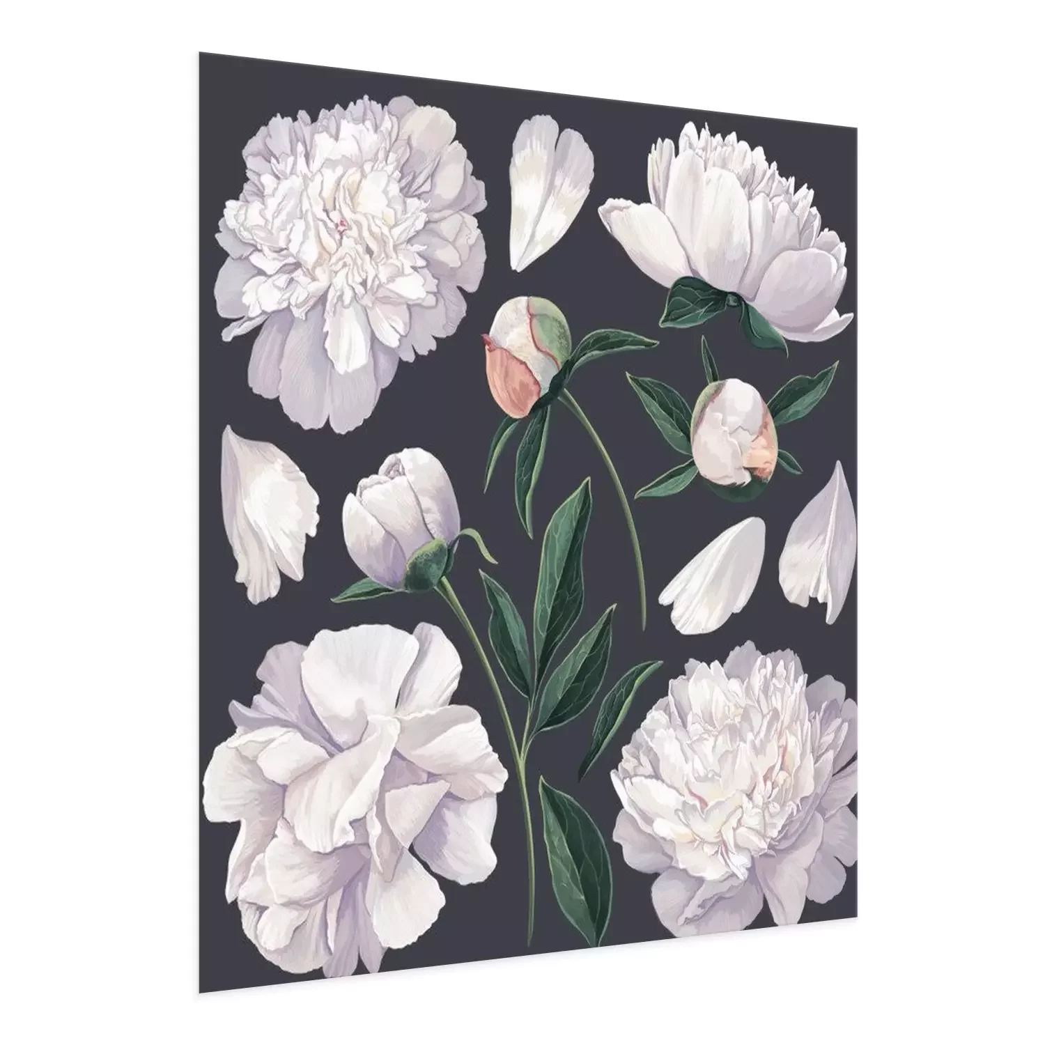 Pivoines blanches grandes fleurs fond sombre