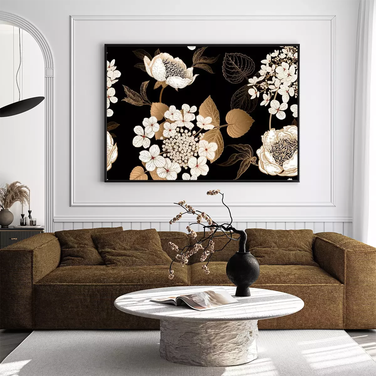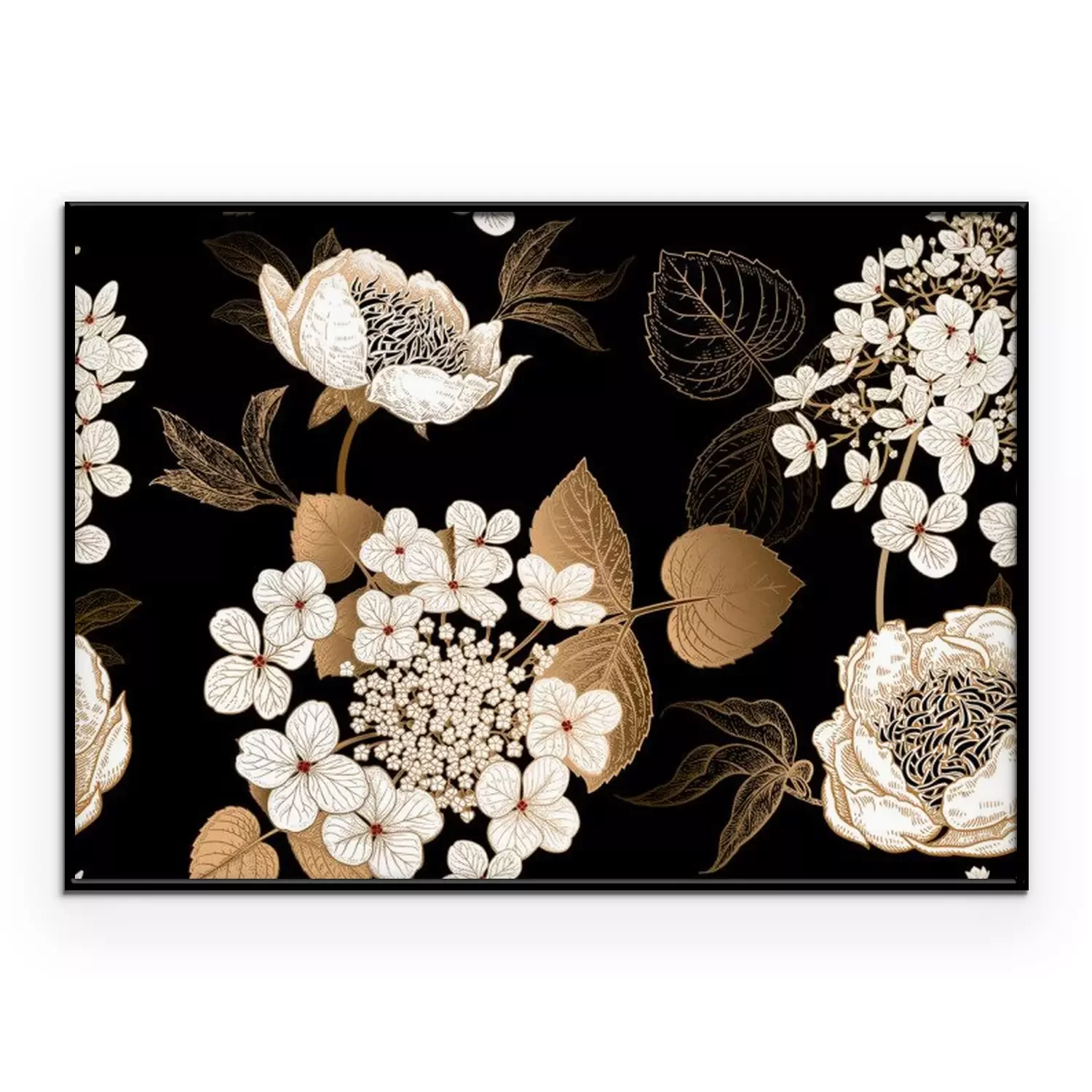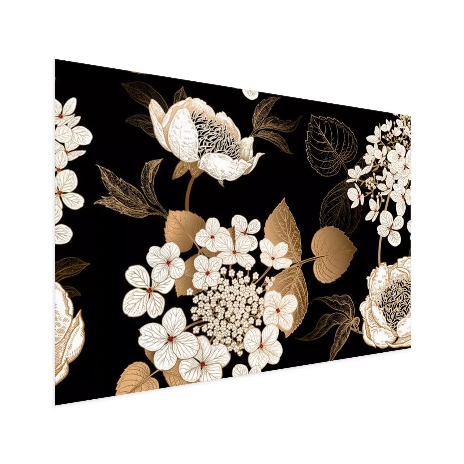 Poster : Pivoines blanches et feuilles dorées en noir