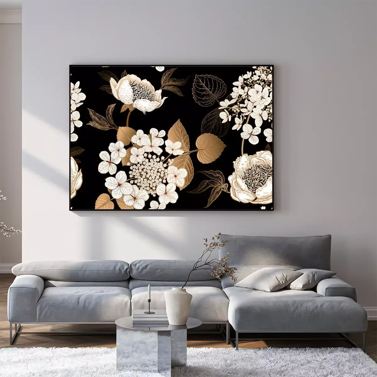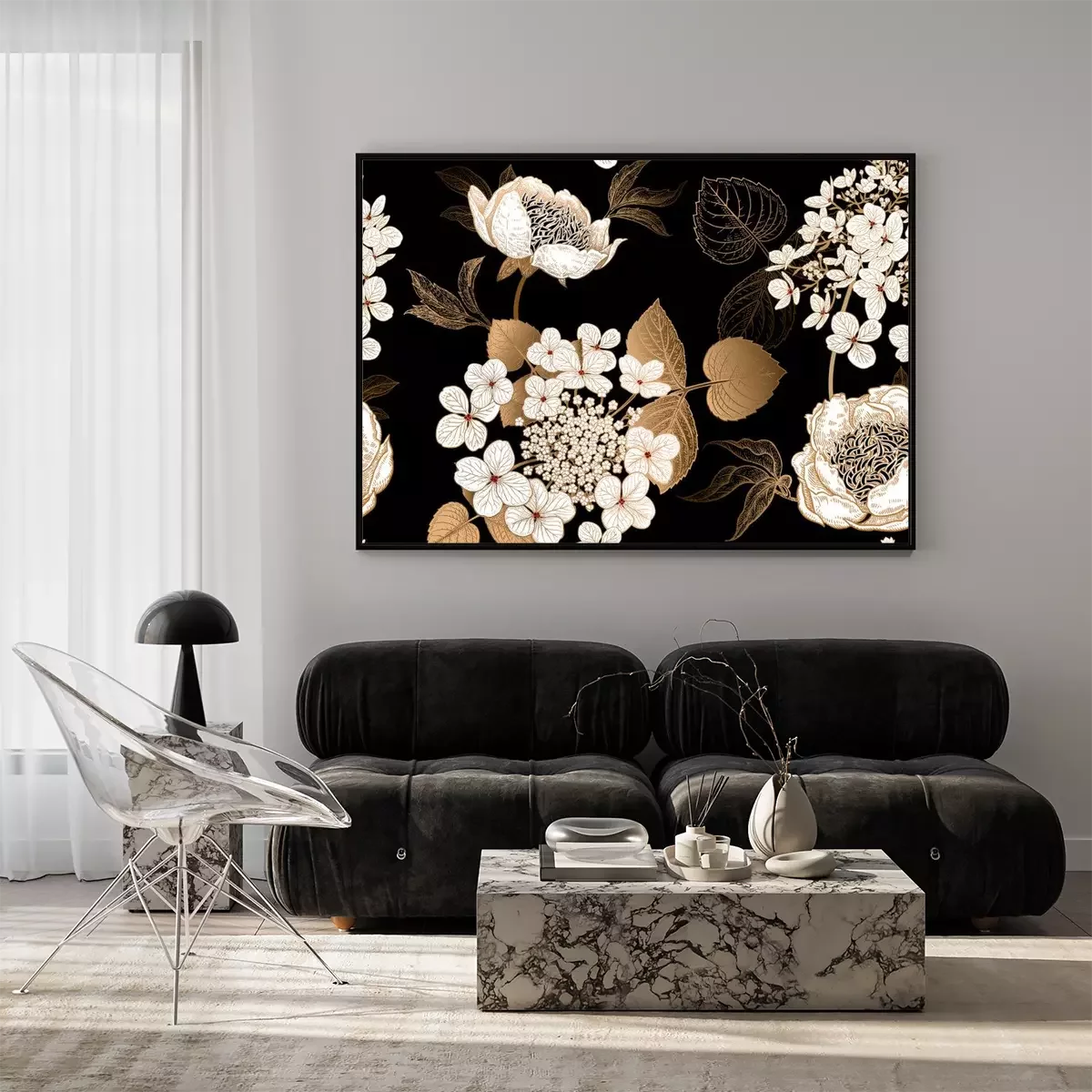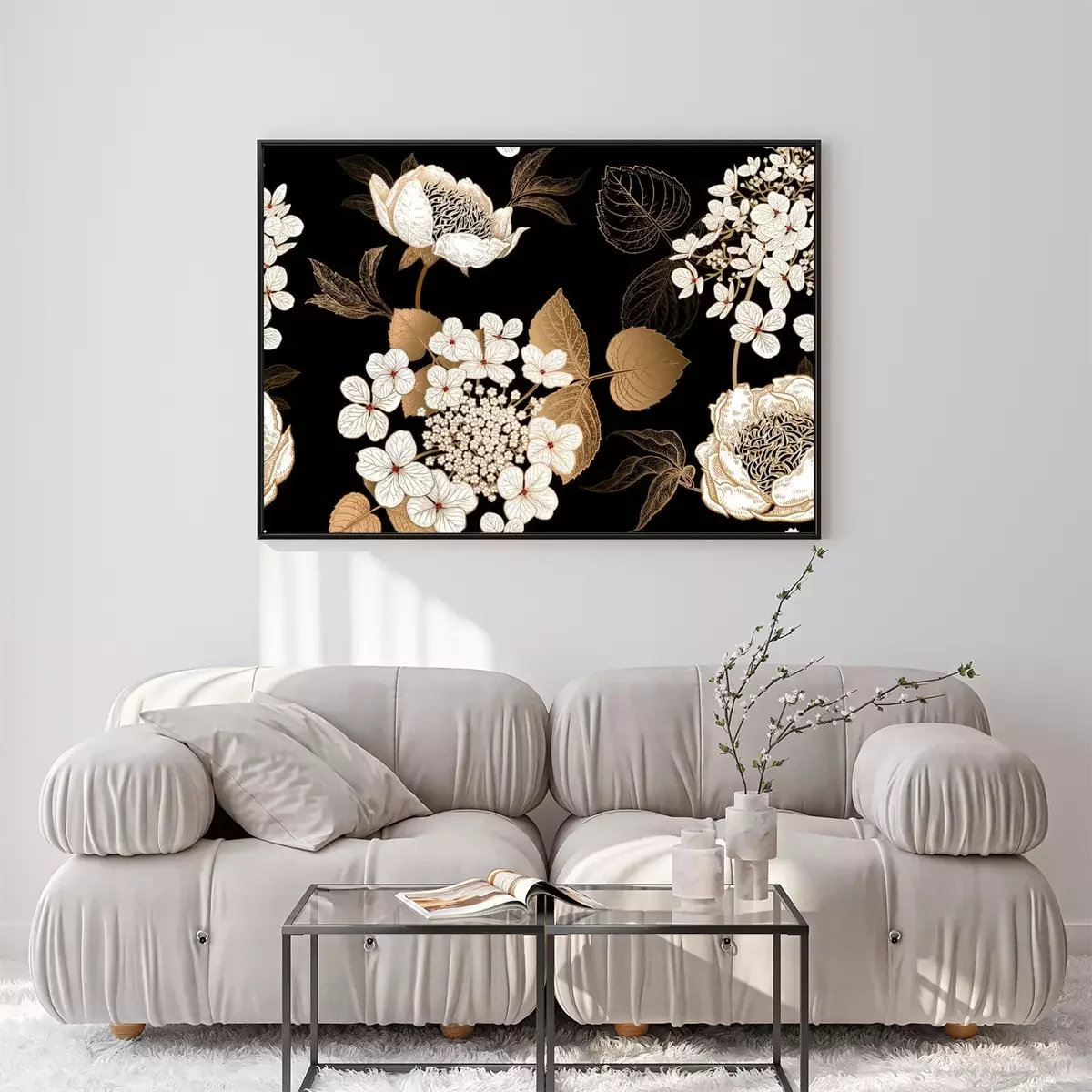 Poster : Pivoines blanches et feuilles dorées en noir