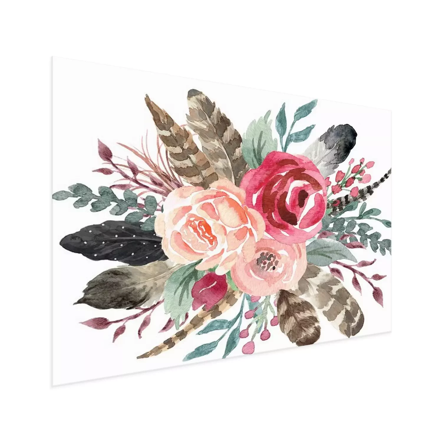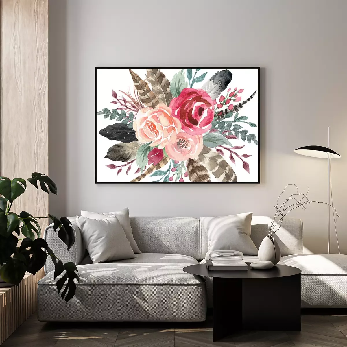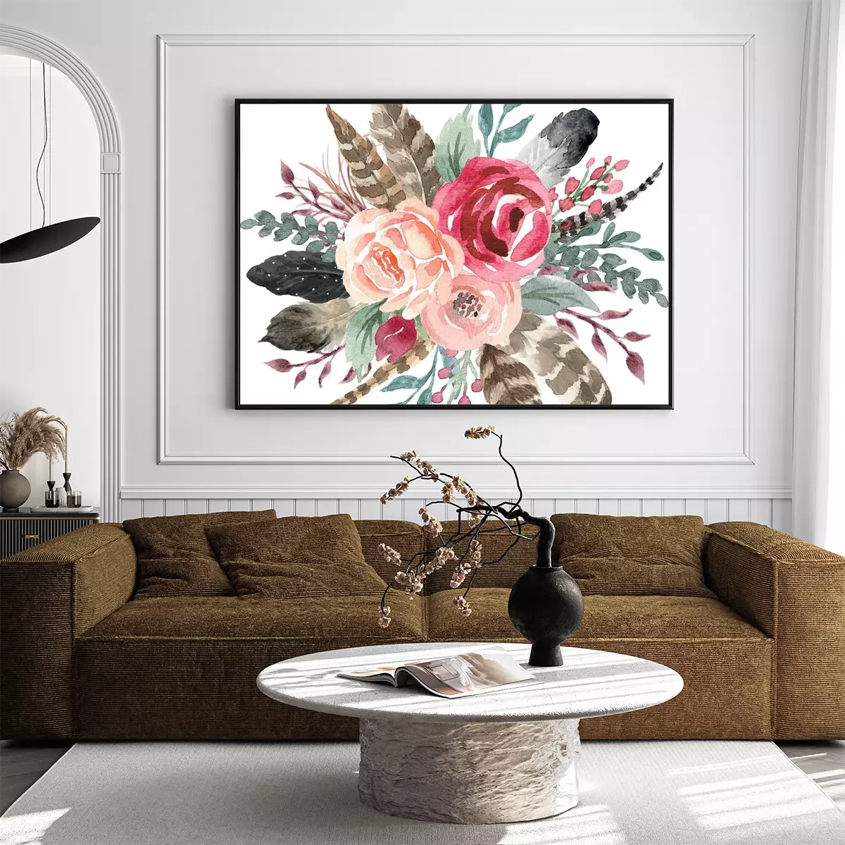 Poster : Pivoines de conte de fées entourées de feuilles et de plumes