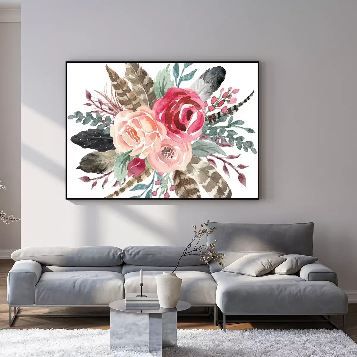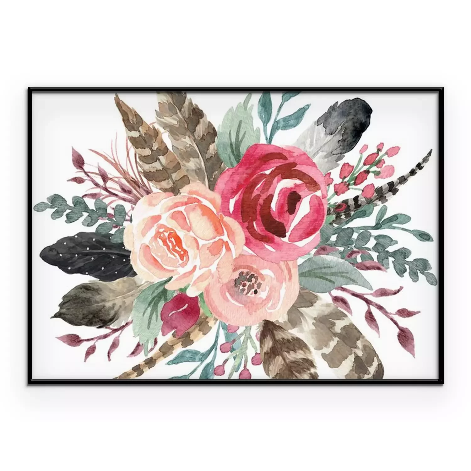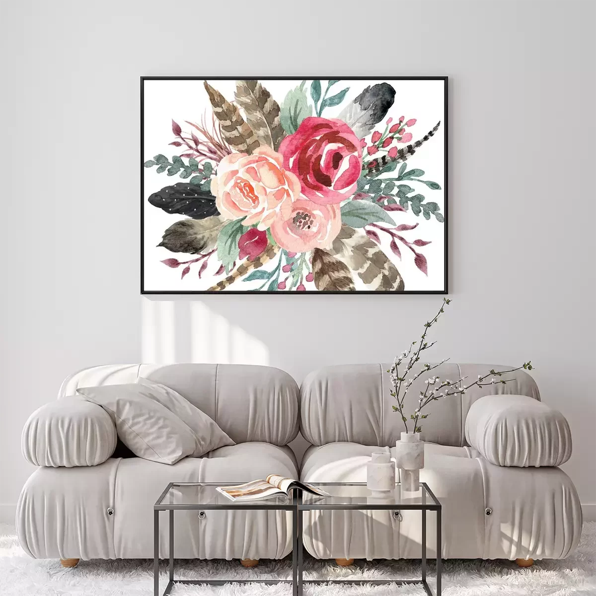 Poster : Pivoines de conte de fées entourées de feuilles et de plumes